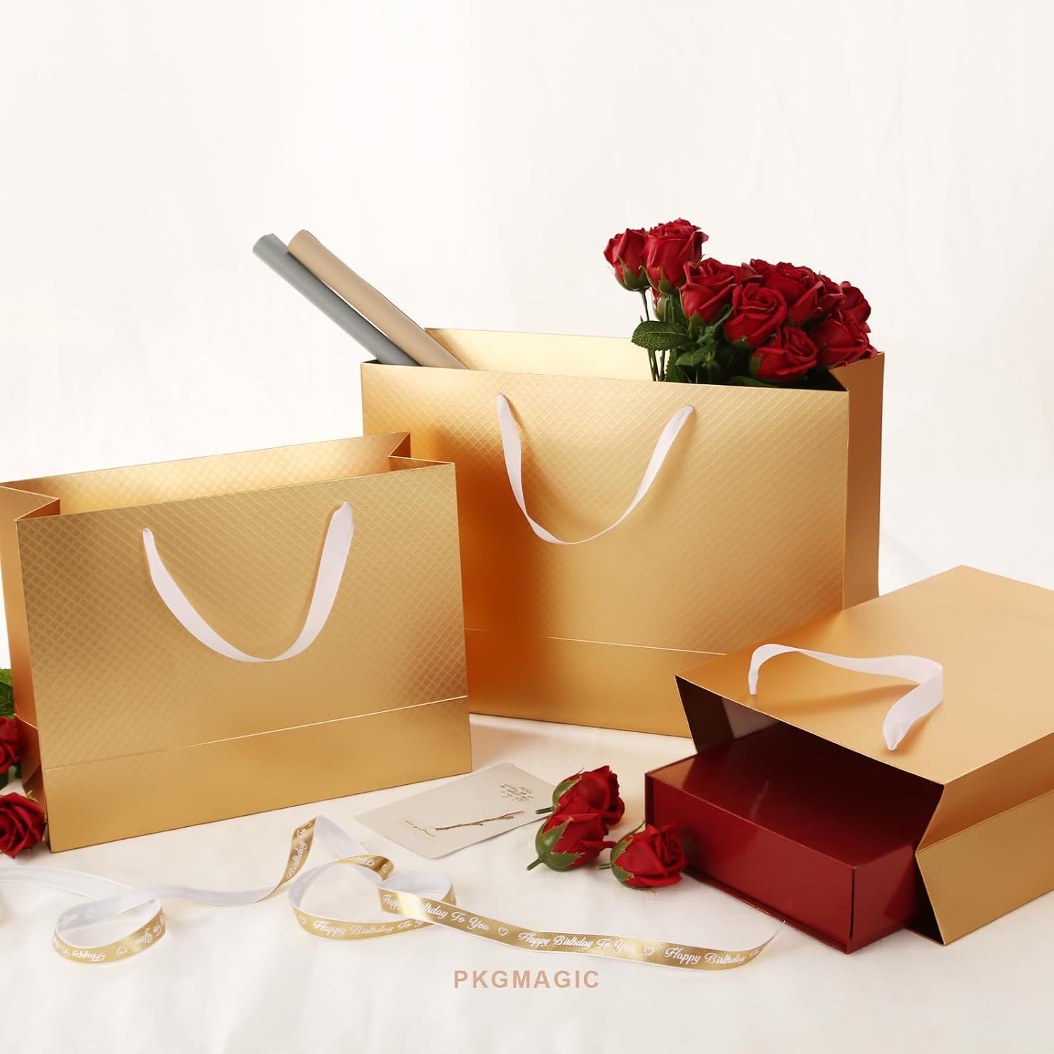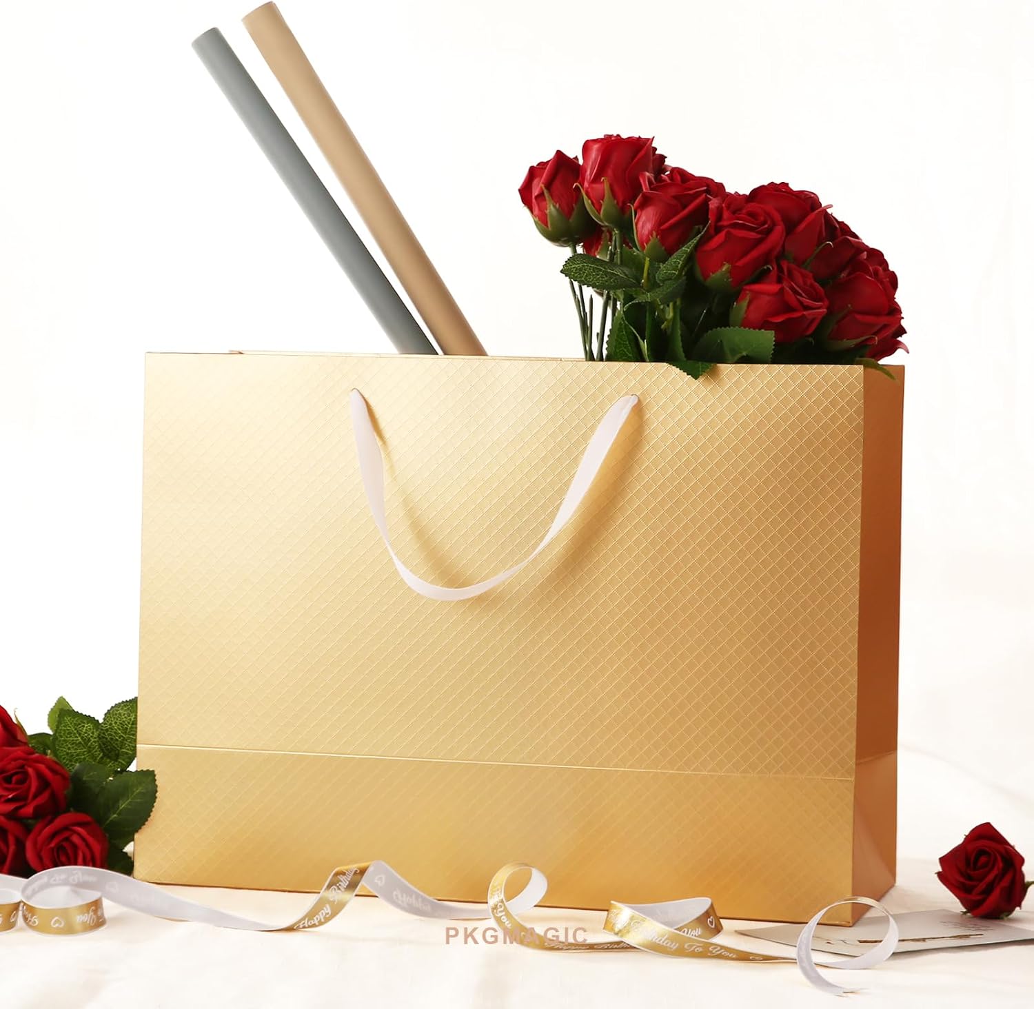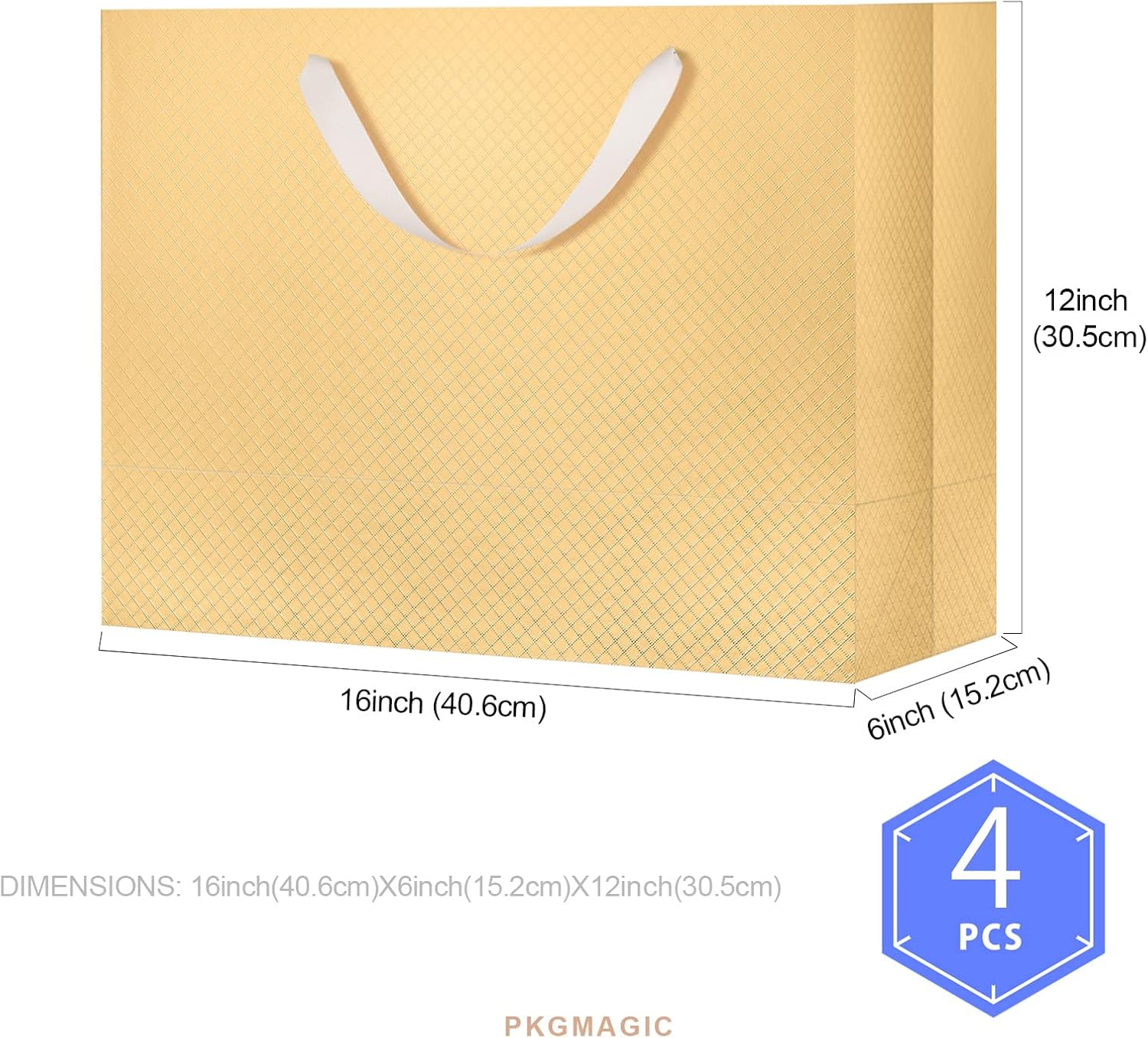 Dimensioni: il sacchetto regalo dorato extra large misura 40,64 x 15,24 x 30,48 cm (16 x 6 x 12 pollici). La confezione contiene: 4 sacchetti regalo. La superficie è laminata opaca con goffratura. I manici e i sacchetti regalo sono separati per evitare che si pieghino durante il trasporto Materiale: manici in cotone intrecciato e cartone bianco abbastanza resistente, possono essere utilizzati come sacchetti regalo riutilizzabili I sacchetti regalo sono perfetti per sacchetti regalo per le feste, borse della spesa, borse per la vendita al dettaglio, sacchetti per la merce e sacchetti di benvenuto per matrimoni, possono contenere fino a 8 libbre (3,62 Kg) Applicazione: adatti per vari regali come bicchieri, libri, cornici, ecc. Ottimo per compleanni, lauree, addio al nubilato e per neonati, Ringraziamento, Natale e tutte le occasioni.