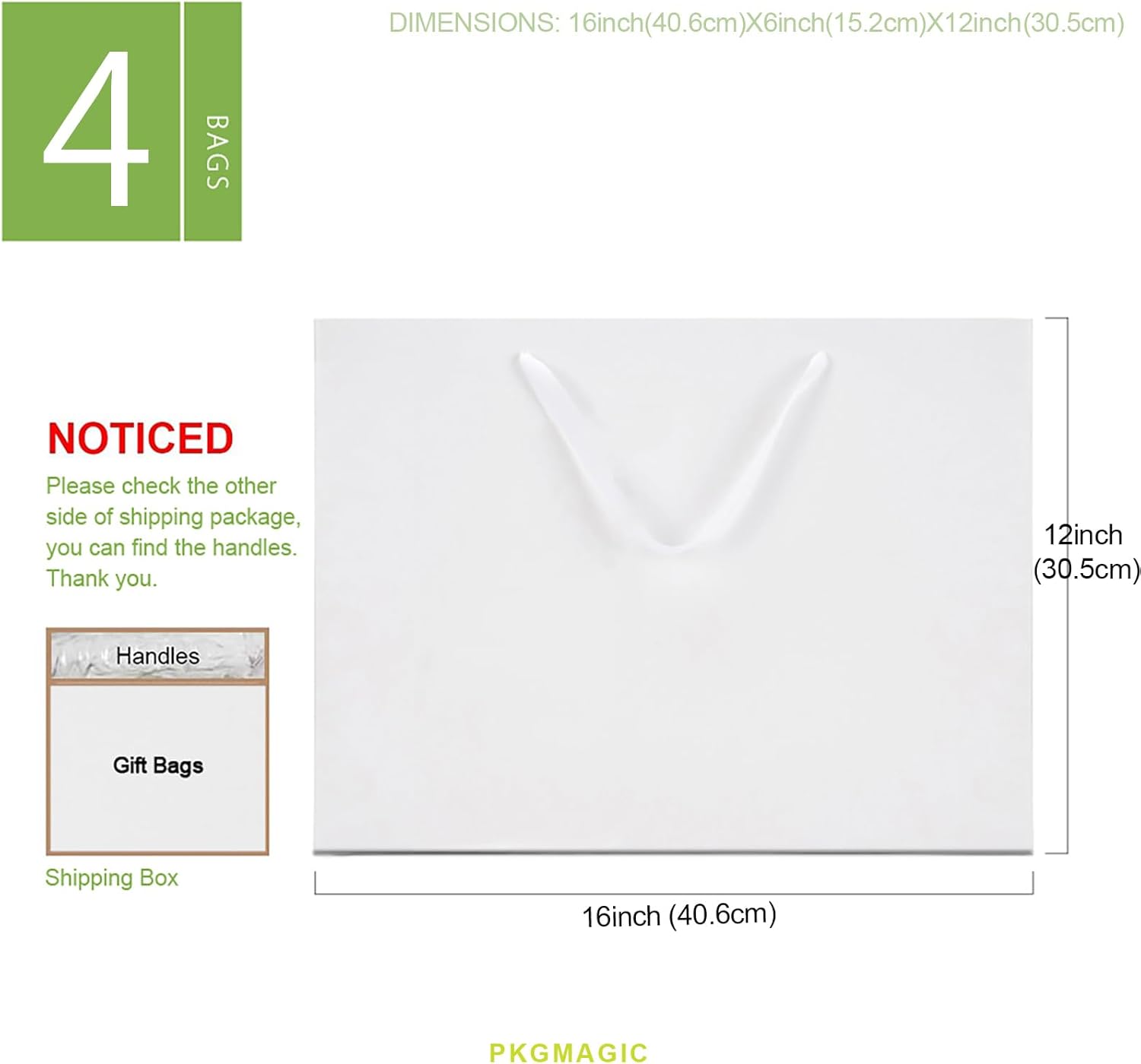 Dimensioni: il sacchetto regalo extra large in bianco misura 40,64 x 15,24 x 30,48 cm (16 x 6 x 12 pollici). La confezione contiene: 4 sacchetti regalo. La superficie è laminata opaca con goffratura. I manici e i sacchetti regalo sono separati per evitare che si pieghino durante il trasporto Materiale: manici in cotone intrecciato e cartone bianco abbastanza resistente, possono essere utilizzati come sacchetti regalo riutilizzabili I sacchetti regalo sono perfetti per sacchetti regalo per le feste, borse della spesa, borse per la vendita al dettaglio, sacchetti per la merce e sacchetti di benvenuto per matrimoni, possono contenere fino a 8 libbre (3,62 Kg) Applicazione: adatti per vari regali come bicchieri, libri, cornici, ecc. Ottimo per compleanni, lauree, addio al nubilato e per neonati, Ringraziamento, Natale e tutte le occasioni.