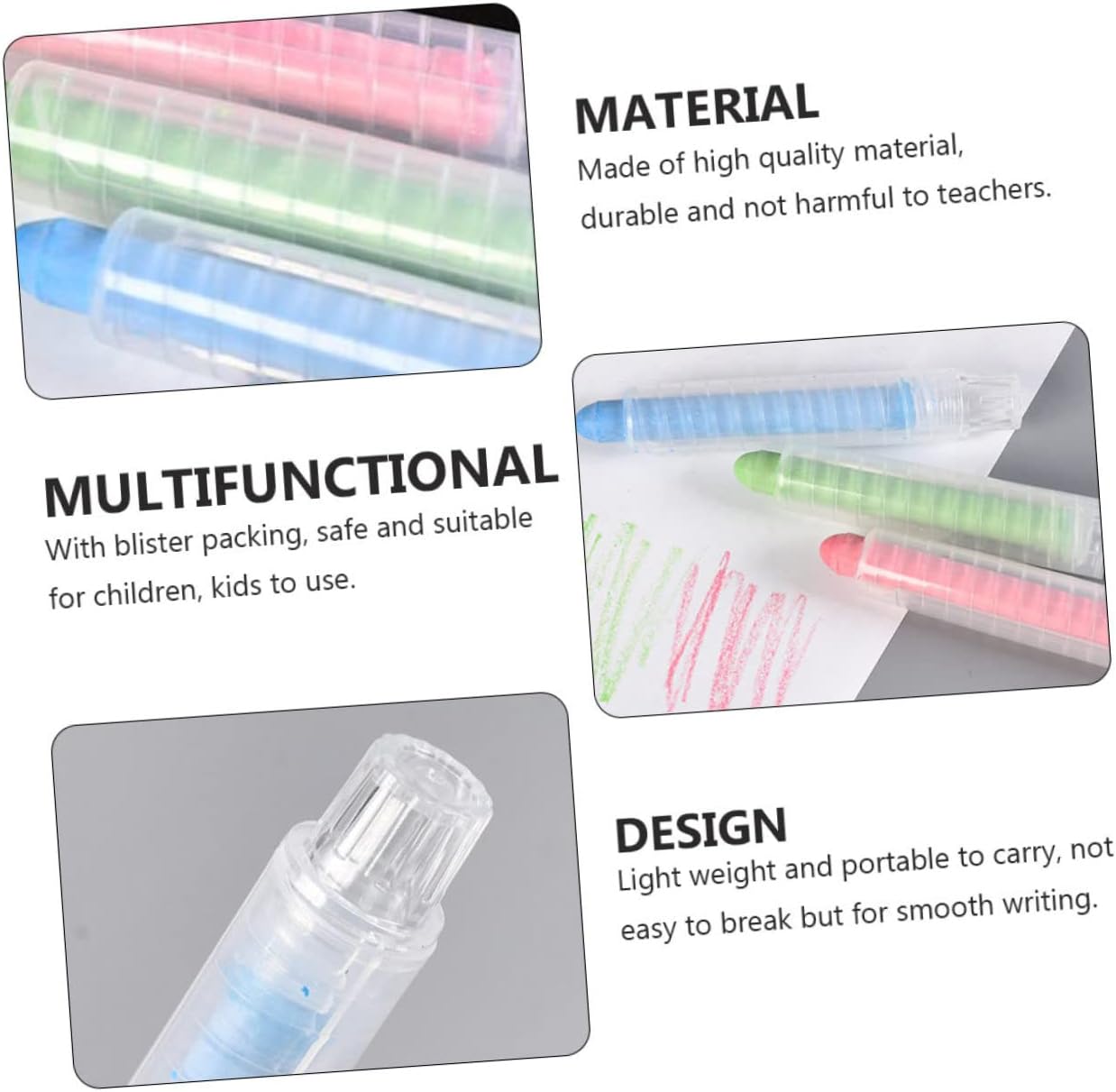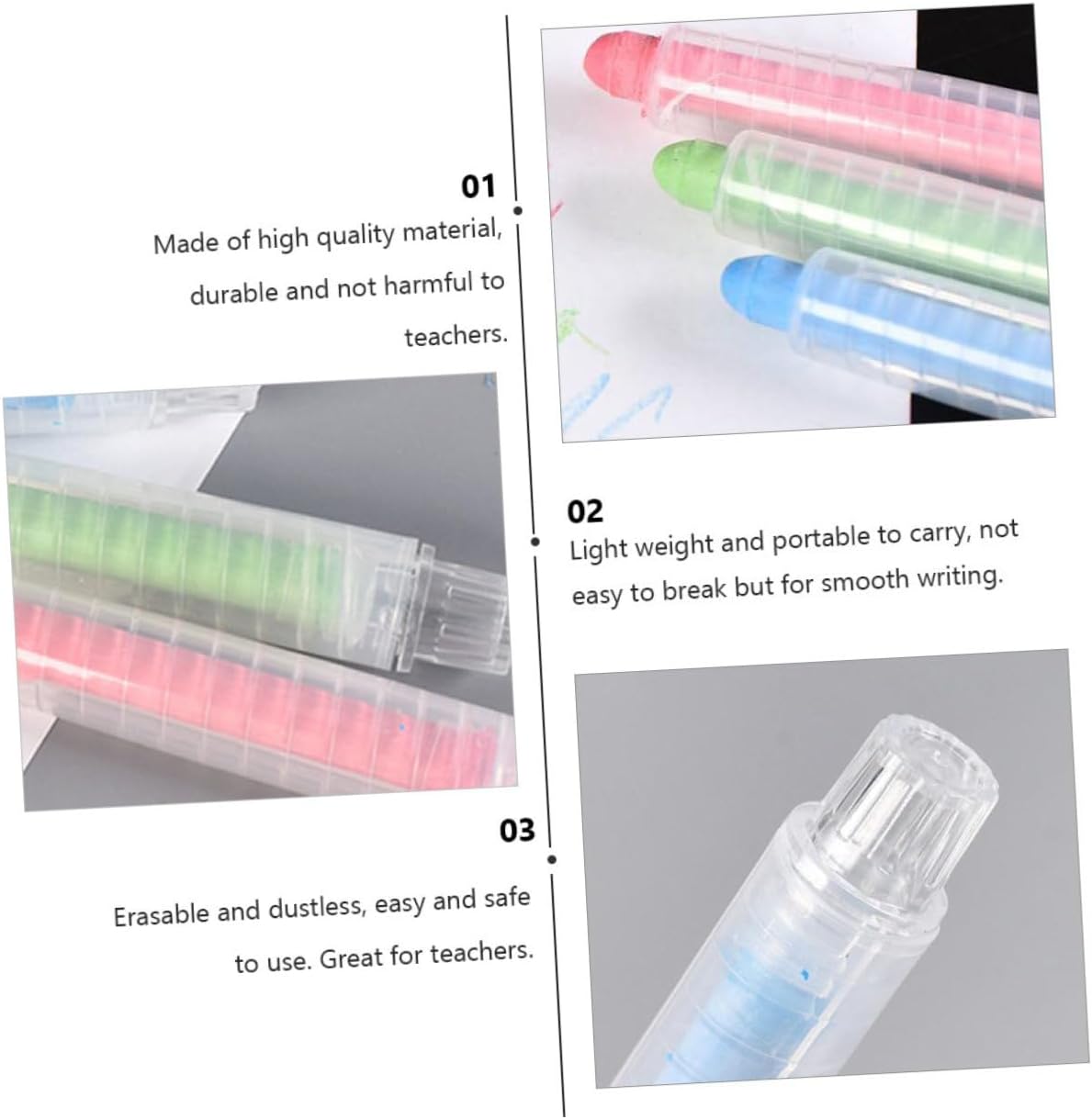 Gessetti colorati: leggeri e portatili, non facili da rompere, ma adatti anche per scrivere, gessetti per graffiti. Pastelli - Materiale: è realizzato in polimero ad alto peso molecolare, quindi la qualità di questo articolo è buona, confezionando il gesso. Gessetti didattici - Confezione da 6, gessetti lavabili e antipolvere in diversi colori, facili da scrivere e dipingere, gessetti portatili. - Gesso - con confezione, mantiene le mani dei tuoi bambini pulite, sicure e protette, gesso da lavagna. Imballaggio del gesso: sicuro, lavabile e appositamente progettato per ridurre al minimo la polvere di gesso, rendendolo sicuro da usare all'interno e all'esterno, come il gesso in classe.