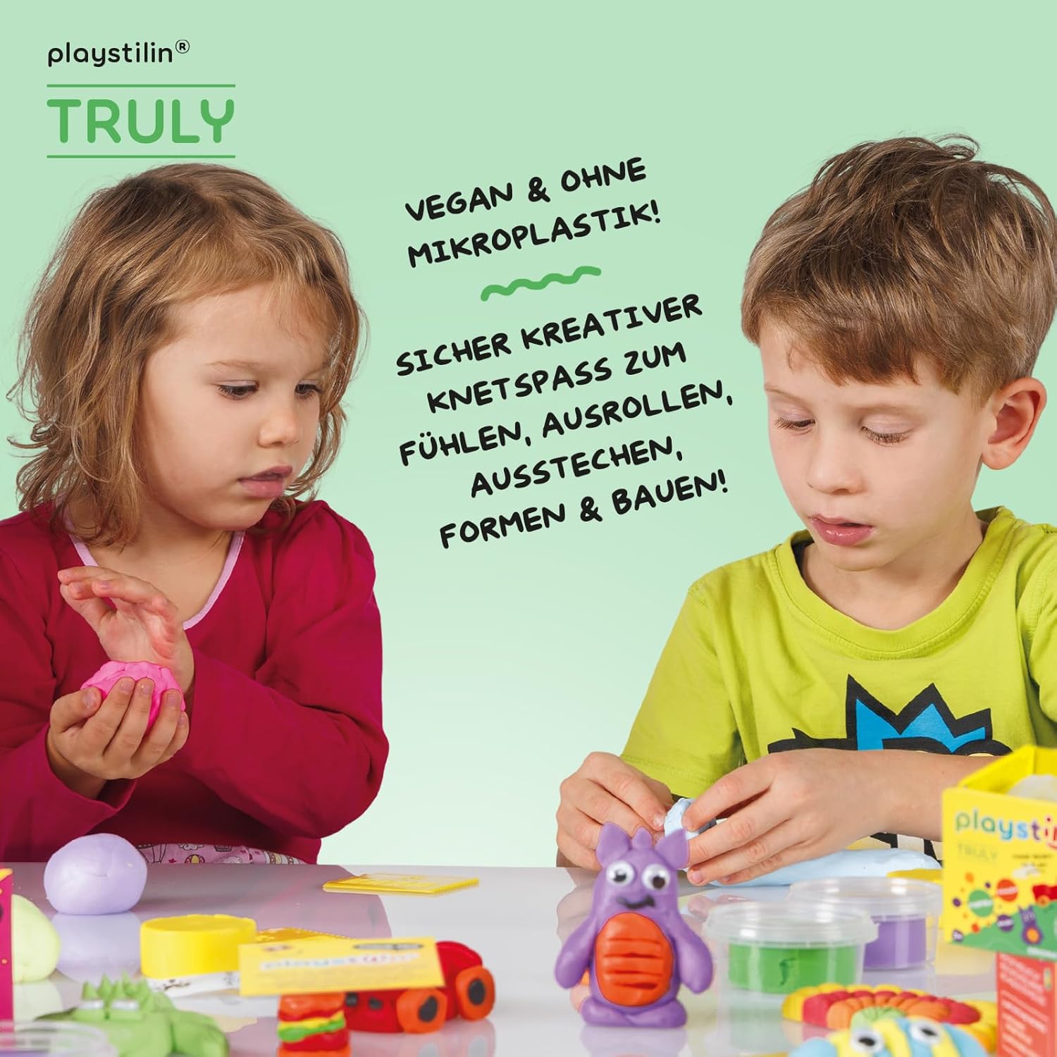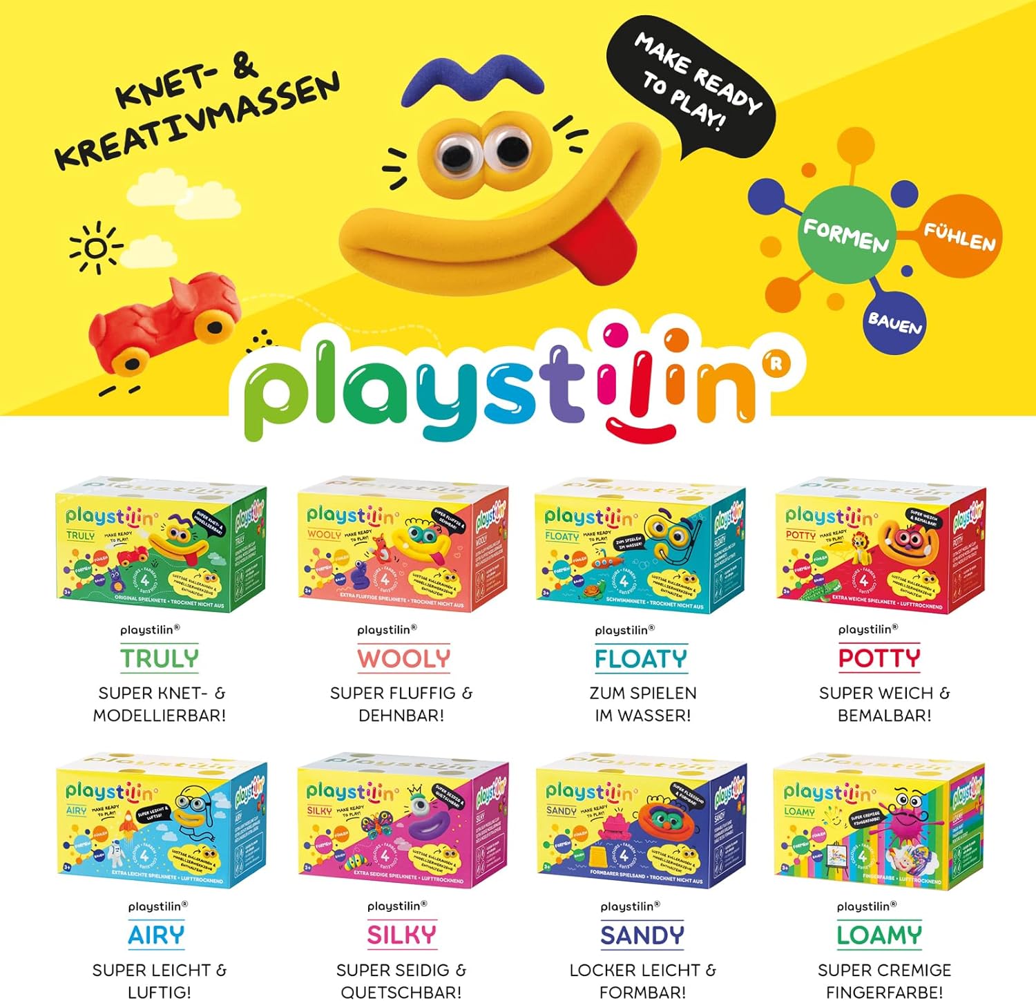 ORIGINALE: playstilin VERAMENTE pasta da gioco in 4 colori per bambini dai 3 anni in su. La classica argilla per bambini che non secca all'aria! Particolarmente facile da modellare grazie all'amido che contiene! CON ACCESSORI: divertenti occhi finti da attaccare e lo speciale strumento di modellazione Playstilin per tagliare, modellare e stampare inclusi nella confezione! Il piccolo regalo perfetto per i compleanni dei bambini! TATTILE: poiché Playstilin VERAMENTE non si secca, può essere palpato, impastato, steso, ritagliato e modellato ancora e ancora! Per avventure sensoriali e idee creative! SICURO: prodotto con ingredienti di alta qualità in Germania! Garantito atossico, vegano e senza microplastiche! Senza glutine, senza proteine, senza arachidi, senza lattosio! Facilmente lavabile! SMART: abbinabile a playstilin CONNECT! La combinazione unica di plastilina con mattoncini appositamente sviluppati (disponibili come opzione)! L'impasto davvero speciale per grandi e piccini! PREPARATI A GIOCARE!