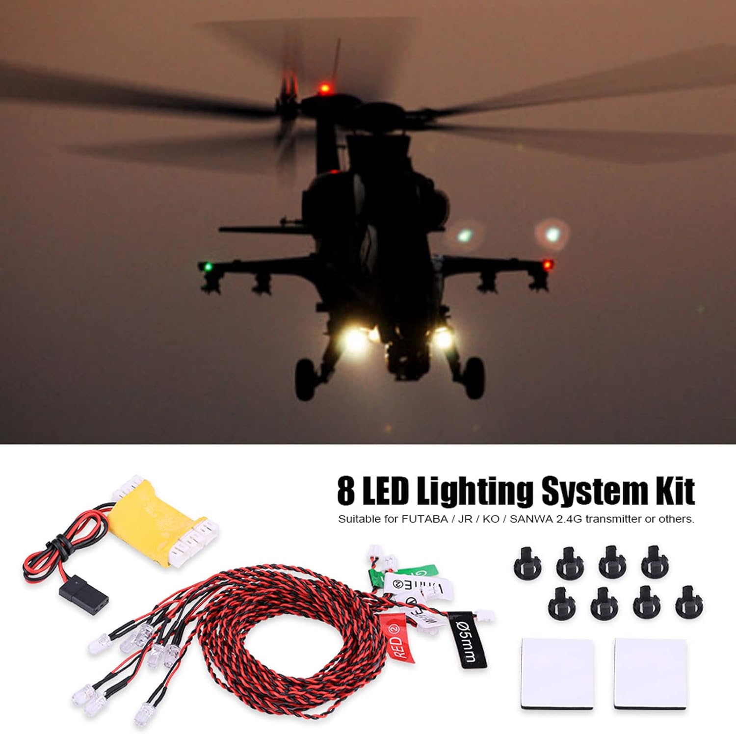 Costruzione in plastica duratura: realizzate con robusti materiali plastici, queste luci lampeggianti sono progettate per resistere ai rigori 'uso regolare. Il design pratico garantisce longevità e affidabilità in varie applicazioni di controllo remoto. Funzione di rilevamento di bassa tensione: questo di illuminazione include una funzione di rilevamento che avvisa gli utenti quando la tensione del ricevitore scende al di sotto di 9 V. Gli indicatori luminosi lampeggianti segnalano questa condizione, garantendo il ritorno sicuro e tempestivo 'aereo. Ampia compatibilità: il kit lampada lampeggiante RC è compatibile con una gamma di aerei ed elicotteri telecomandati. Si adatta ai tipi controllati da trasmettitori FUTABA, JR, KO, SANWA 4G o sistemi simili, rendendolo un accessorio di aggiornamento versatile. Set completo di luci a LED: sono incluse otto luci a LED: due luci bianche del carrello di atterraggio, una luce rossa sull'ala sinistra, una luce verde sull'ala destra, una luce rossa anticollisione e tre luci bianche lampeggianti. Questi migliorano la visibilità notturna e l'estetica. Esperienza di volo notturno migliorata: aggiungendo queste luci al tuo aereo o elicottero RC, puoi migliorarne significativamente l'aspetto e la sicurezza durante i voli notturni. La combinazione di colori e funzioni fa risaltare il tuo tipo e lo rende più attraente.