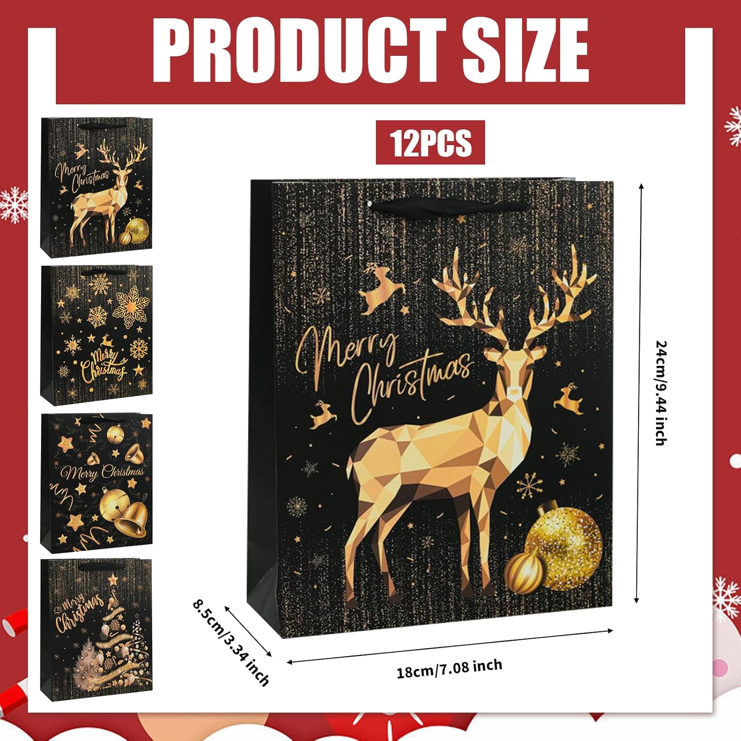 🎄 【Sacchetti natalizi in oro nero】 Riceverai 12 sacchetti di caramelle di carta natalizia con dimensioni 24 * 18 * 8,5 cm (9,5 * 7 * 3,4 pollici). Ci sono 4 stili in ciascun gruppo e ogni stile è composto da 3 parti. 🎄 【Elementi natalizi classici】 Elementi natalizi classici come fiocchi di neve, fiocchi di neve, alberi di Natale, renne e campanelle natalizie, abbinati al colore oro nero, che li rendono eleganti durante le feste di Natale. 🎄【Ecologici e Riutilizzabili】I nostri sacchetti regalo di Natale sono realizzati in cartone ecologico di alta qualità e sono resistenti e impermeabili, quindi possono essere riutilizzati durante le prossime festività natalizie. 🎄 【Pratica coulisse】 Pensando alla comodità e all'eleganza, ogni borsa è dotata di una pratica coulisse per garantire una chiusura facile e sicura garantendo al tempo stesso il comfort di essere trasportata in qualsiasi momento. 🎄【Occasioni applicabili】Ideali per caramelle, dessert, cioccolatini, piccoli snack e giocattoli, questi versatili sacchetti regalo sono perfetti per feste di Natale, matrimoni natalizi, feste di compleanno, baby shower e altre occasioni festive.