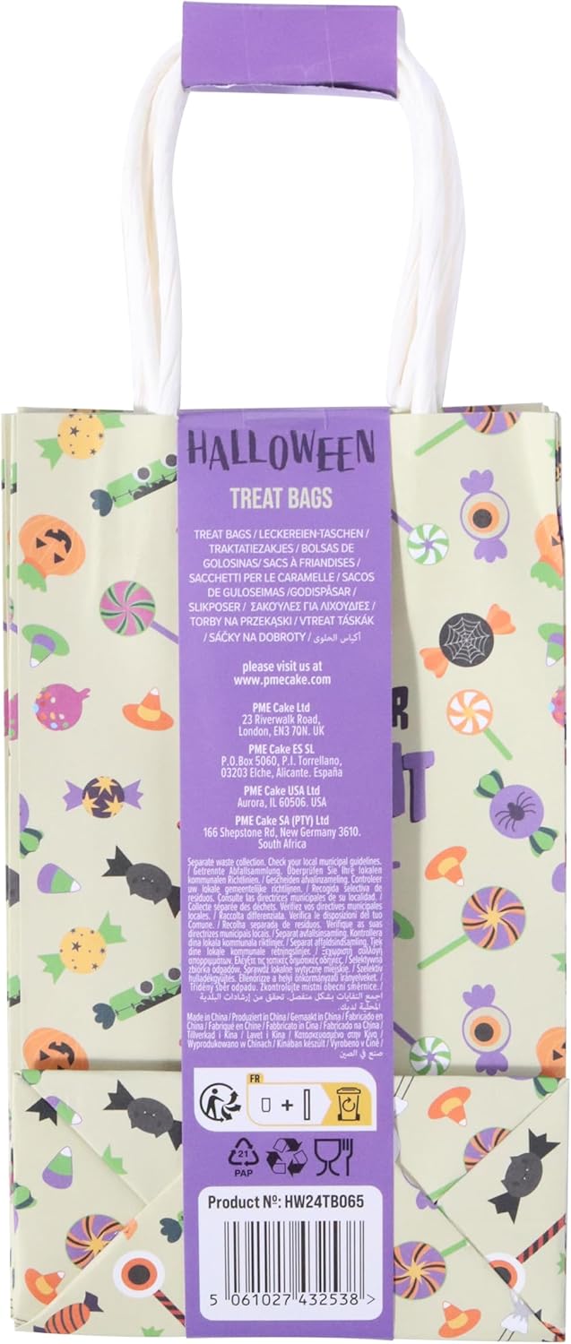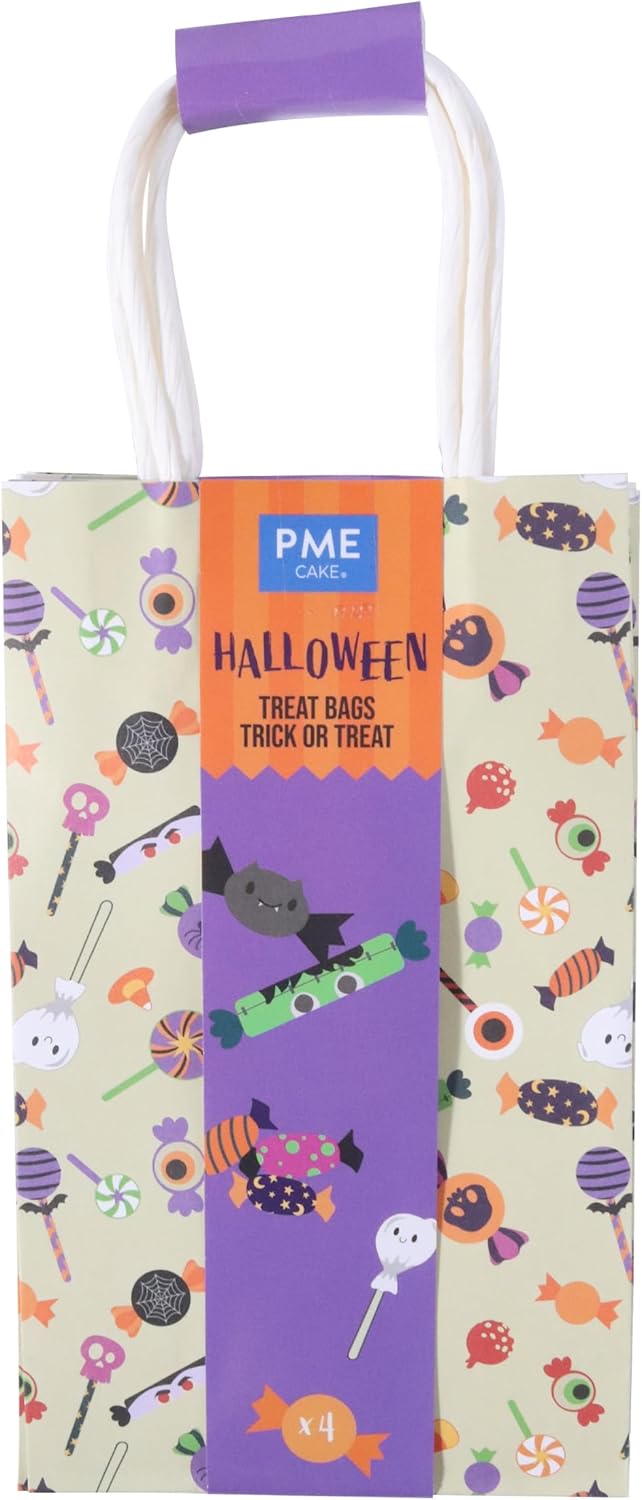 Trasporta le tue dolci e spaventose sorprese con stile con questi sacchetti di caramelle di carta PME. PME ha tutti i trucchi per i tuoi dolcetti di Halloween! Confezione composta da 4 sacchetti decorati con un motivo di caramelle colorate. Dimensioni 120 x 288 mm e dotato di robusta maniglia. Realizzato con carta kraft riciclata. Può essere usato come sacchetto regalo oppure i bambini possono scriverci sopra i loro nomi da utilizzare come sacchetto per le feste. Perfetto per le avventure dolcetto o scherzetto in famiglia! Riempili con giocattoli, caramelle, cioccolato, biscotti o altre prelibatezze. Preparati per le tue feste di Halloween con la selezione stagionale "spettacolare" di PME, tra cui prodotti da forno, pirottini per cupcake, toppers per torta e altro ancora.