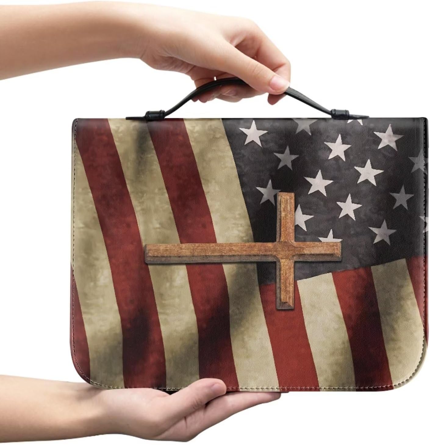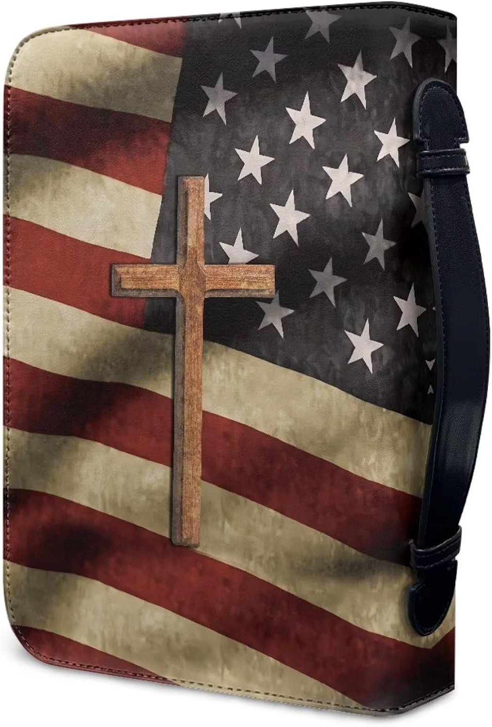 Poceacles Copertine per Bibbia Croce per donne e uomini Retro Bandiera Americana Custodia in pelle con Croce Bibbia Cover Piccola con Manico e Cerniera Chiesa Tote Bibbia Protettiva, M, Retro Croce
