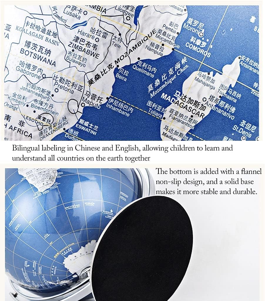Divertente ed educativo: questo mappamondo è di buone dimensioni, facile da riporre e trasportare, elegante e pratico. Non sbiadisce facilmente, la lunga durata rende l'apprendimento della geografia più interessante e adatto a studenti di età diverse. Struttura robusta: la base e la struttura sferica sono rifinite con placcatura in rame metallico. È liscio come uno specchio, lavorazione squisita e alta qualità. Il design scorrevole della flangia viene aggiunto di seguito. La base solida è durevole. Squisita fattura: la superficie della palla viene spruzzata con la tecnologia della vernice metallica. È luminoso e bello. La tecnologia di placcatura in metallo lucido evidenzia la qualità e la consistenza. Ovviamente è facile da distinguere e di lunga durata. Design rotante: rotazione verticale di 360°, rotazione orizzontale di 360°, stoccaggio flessibile e regolare, che consente di osservare chiaramente da qualsiasi angolazione. La vite è fissa, non è facile cadere, non taglia le ferite, è robusta e durevole Dettagli: stampa cinese e inglese, tutti i paesi e regioni del mondo sono descritti in cinese e inglese; Lo squisito mappamondo geografico mostra il globo dettagliato di montagne, correnti oceaniche, deserti, laghi, stati e principali città.