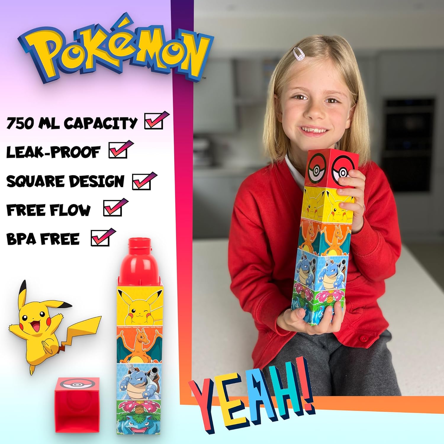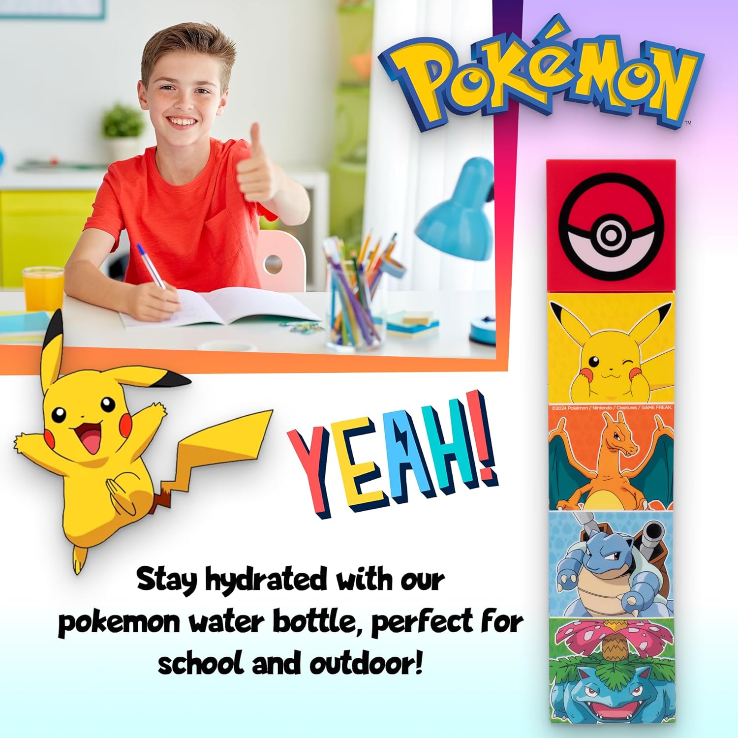 Sicuro e senza BPA: questa borraccia da 650 ml per ragazzi è realizzata in plastica di alta qualità priva di BPA, che garantisce un'opzione di idratazione sicura e sana per il tuo bambino. I materiali utilizzati sono privi di sostanze chimiche nocive, dandoti tranquillità. Durevole e a prova di perdite: progettata per resistere all'uso quotidiano, questa borraccia per bambini presenta una struttura resistente che resiste a crepe e perdite. È perfetto per i bambini attivi e può sopportare il ruvido e cadavere della scuola e delle attività all'aperto Design divertente e coinvolgente: con vivaci grafiche Pokémon questa borraccia per bambini sarà sicuramente un successo tra ragazzi e ragazze. Il design divertente incoraggia i bambini a rimanere idratati durante il giorno, rendendolo una scelta pratica e accattivante. Comoda per la scuola e le attività: con una capacità di 650 ml, questa borraccia Pokemon è della dimensione ideale per scuola, sport e avventure all'aria aperta. È facile da trasportare in uno zaino o in una borsa per il pranzo, garantendo al bambino l'accesso all'acqua ovunque vada. Collezione completa abbinata: parte di un set coordinato, questa borsa con coulisse ha uno zaino, un astuccio, una borsa per il pranzo e un cappello disponibili nello stesso vivace design Pokémon