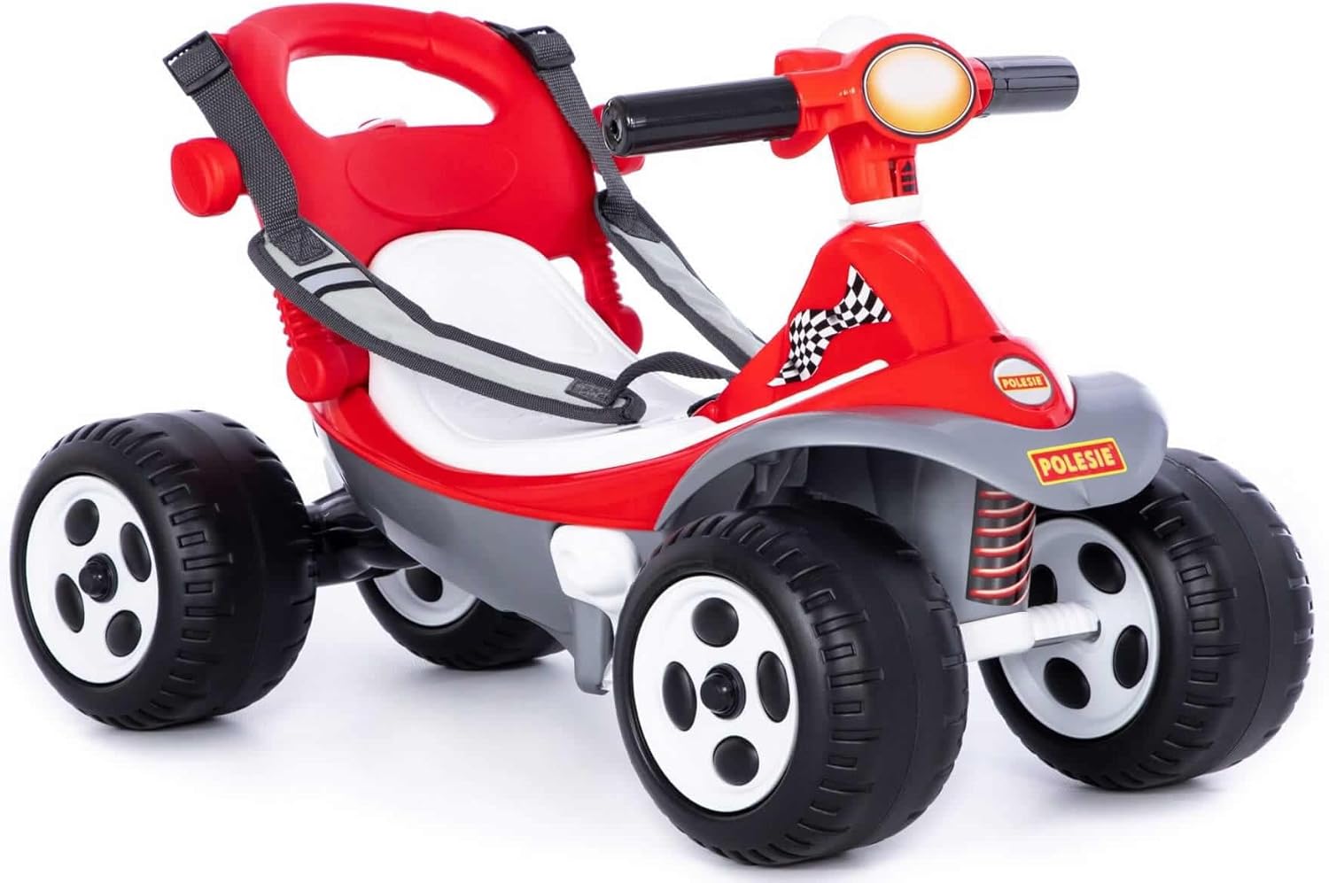 Veicolo quad da corsa della Polesie nel design di un'auto da corsa - dimensioni del prodotto LxWxH: ca. 665 x 370 x 405 mm - altezza seduta: ca. 19 cm, altezza del sedile (con asse posteriore regolato): ca. 25 cm con volante ergonomico incluso sedile con clacson meccanico con cintura di sicurezza e schienale allungato e pieghevole con maniglia integrata e poggiapiedi pieghevoli con dispositivo per spinta o asta di spinta (barra non inclusa) e portabicchieri ad es. B. per borracce con asse posteriore regolabile: ciò consente di modificare il passo e quindi anche l'altezza del sedile