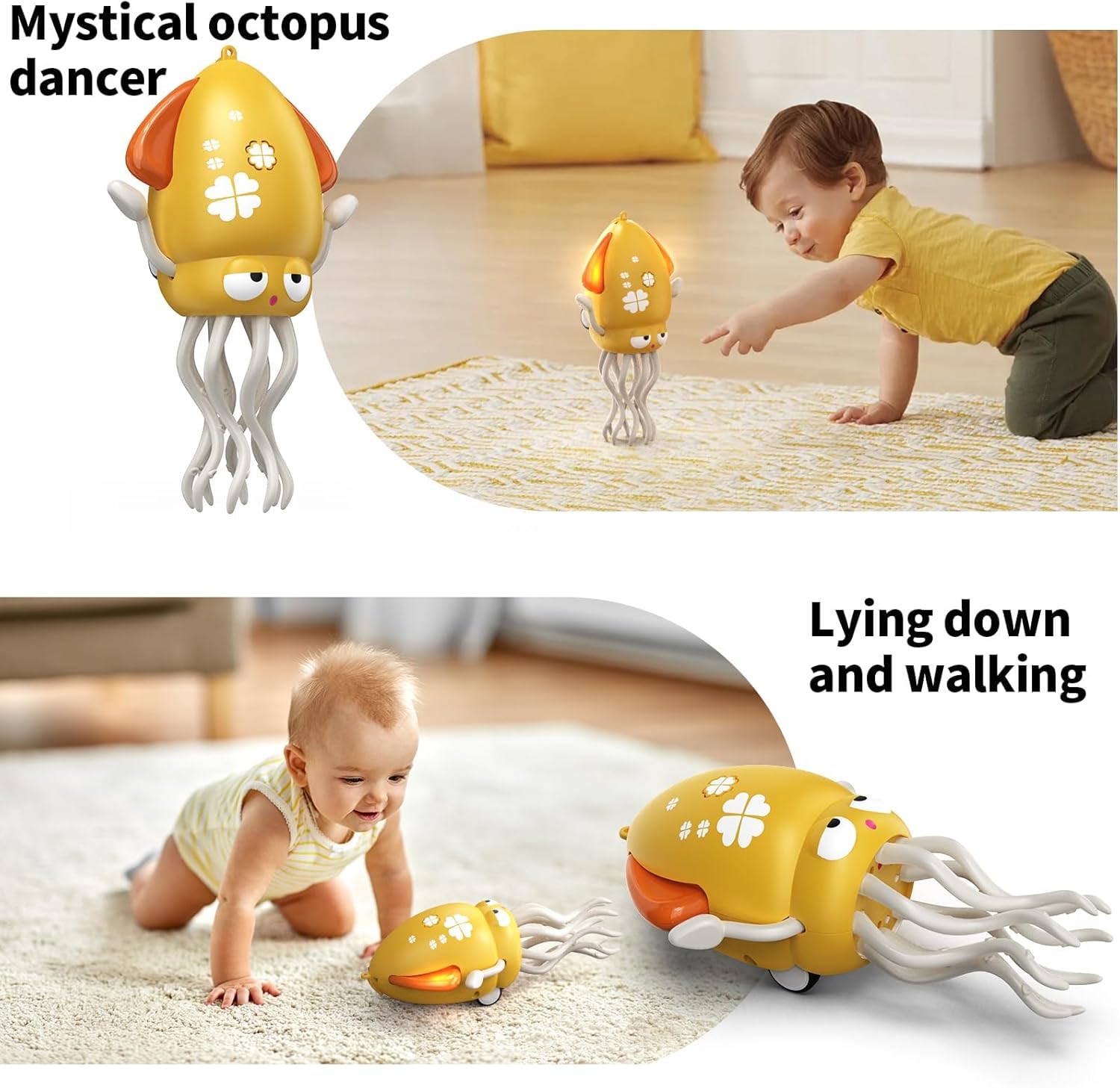 GIOCATTOLO INTERATTIVO DANZANTE E STRISCIAnte: osserva la gioia del tuo bambino mentre questo giocoso polipo balla, gattona e dimena con musica vivace e luci colorate! I suoi cambiamenti di direzione a sorpresa incoraggiano il tempo trascorso a pancia in giù e motivano il gattonare. APPRENDIMENTO SENSORIALE E GIOCO INTELLIGENTE: progettato per il divertimento dello sviluppo, questo giocattolo combina canzoni allegre e luci lampeggianti per supportare l'apprendimento causa-effetto, il riconoscimento del suono e il tracciamento visivo. I sensori integrati aiutano a evitare gli ostacoli per un gioco ininterrotto. DUREVOLE E SICURO PER I BAMBINI: Realizzato in ABS di alta qualità con bordi arrotondati e tentacoli resistenti ai morsi, questo giocattolo soddisfa gli standard di sicurezza. Le sue dimensioni compatte (12,8*8,6*21,5 cm / 5,04*3,39*8,46 pollici) sono facili da impugnare per le mani dei più piccoli. FACILE DA USARE E PULIRE: dispone di 2 modalità di gioco (Danza/Strisciamento) per un tempo di gioco flessibile. Pulisci semplicemente con acqua. divertimento immediato, ideale per la casa, il viaggio o l'asilo nido. REGALO PERFETTO: ottimo per compleanni, vacanze o giochi sensoriali. Viene fornito in confezione regalo festiva