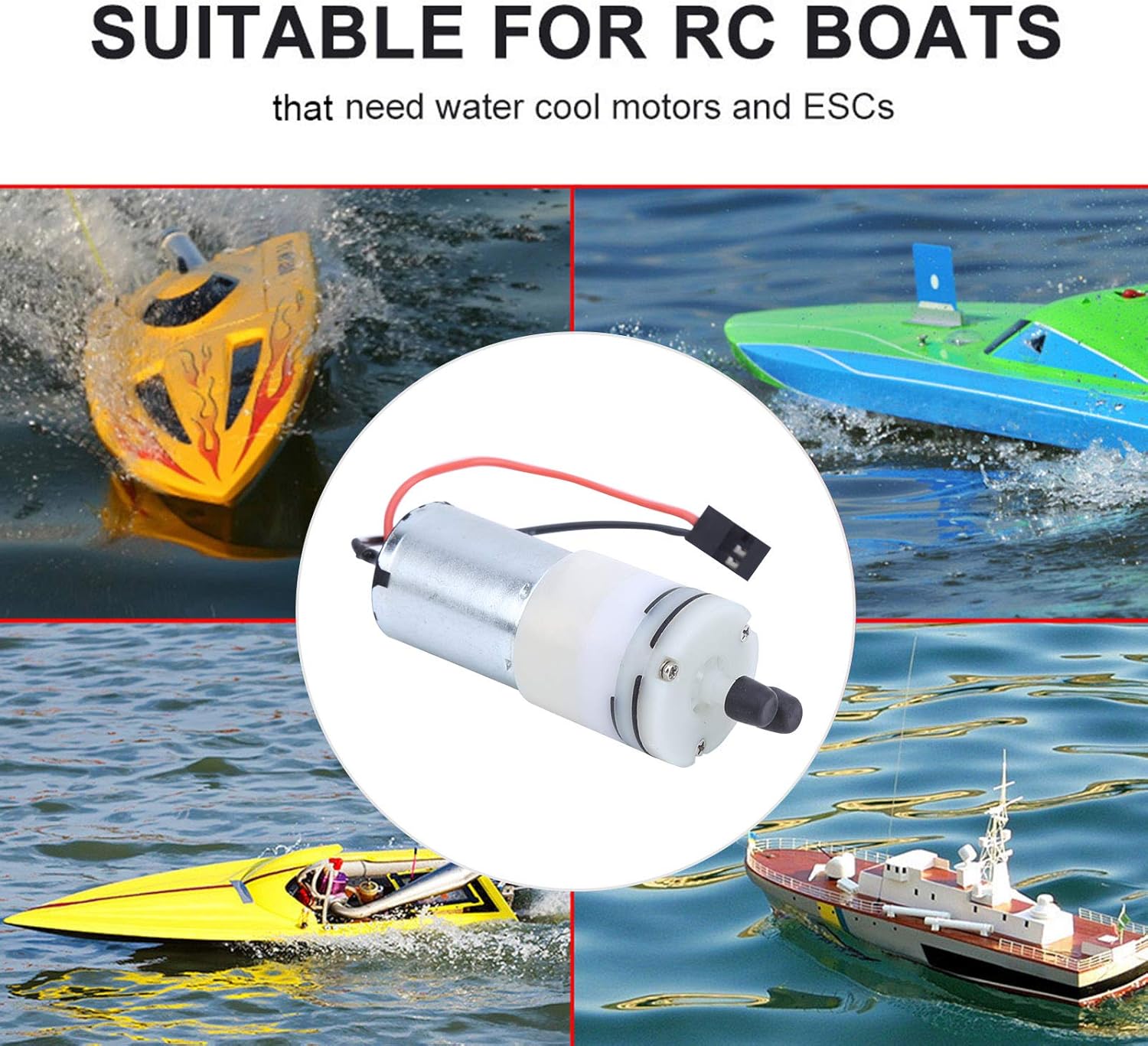 È impermeabile e funziona bene in acqua, spina JR adatta per essere collegata al ricevitore, plug and play. Con una tensione di 5 V, la pompa funziona continuamente per 15 ore e pompa l'acqua continuamente. Mettilo in funzione normalmente, la temperatura sarà calda, ma rientra nell'intervallo normale e non influirà sull'uso. La tensione di pompaggio del motore 370 è di 3-6 V, che consente di collegarlo direttamente al ricevitore per ottenere elettricità. Attraverso il modulo step-down, è possibile collegare direttamente una batteria 2-6S (7-28V) per abbassare la pompa dell'acqua da 5V.