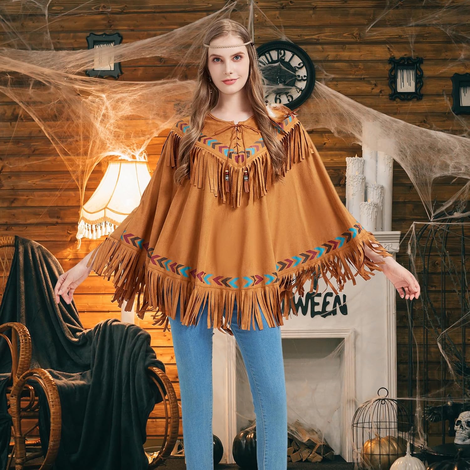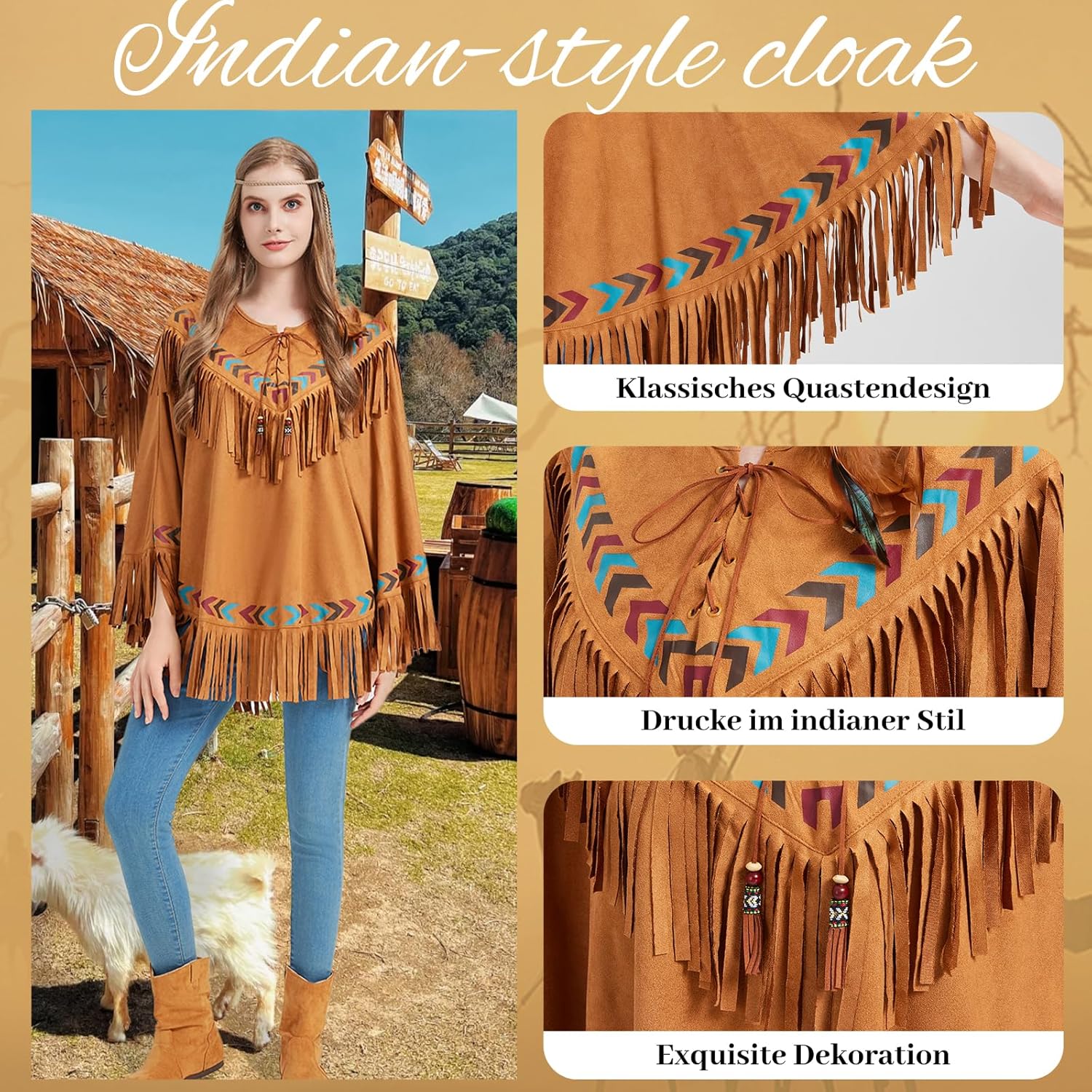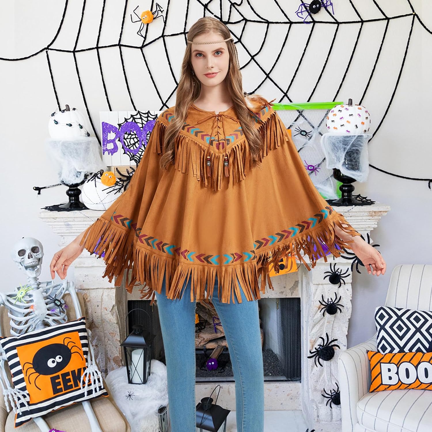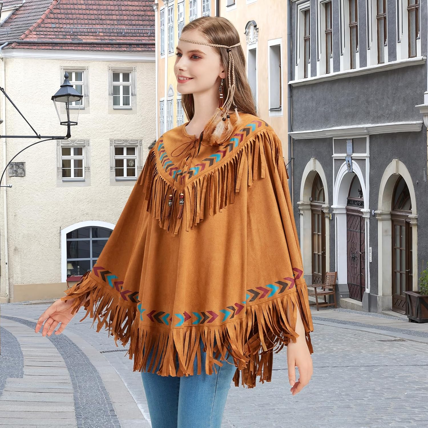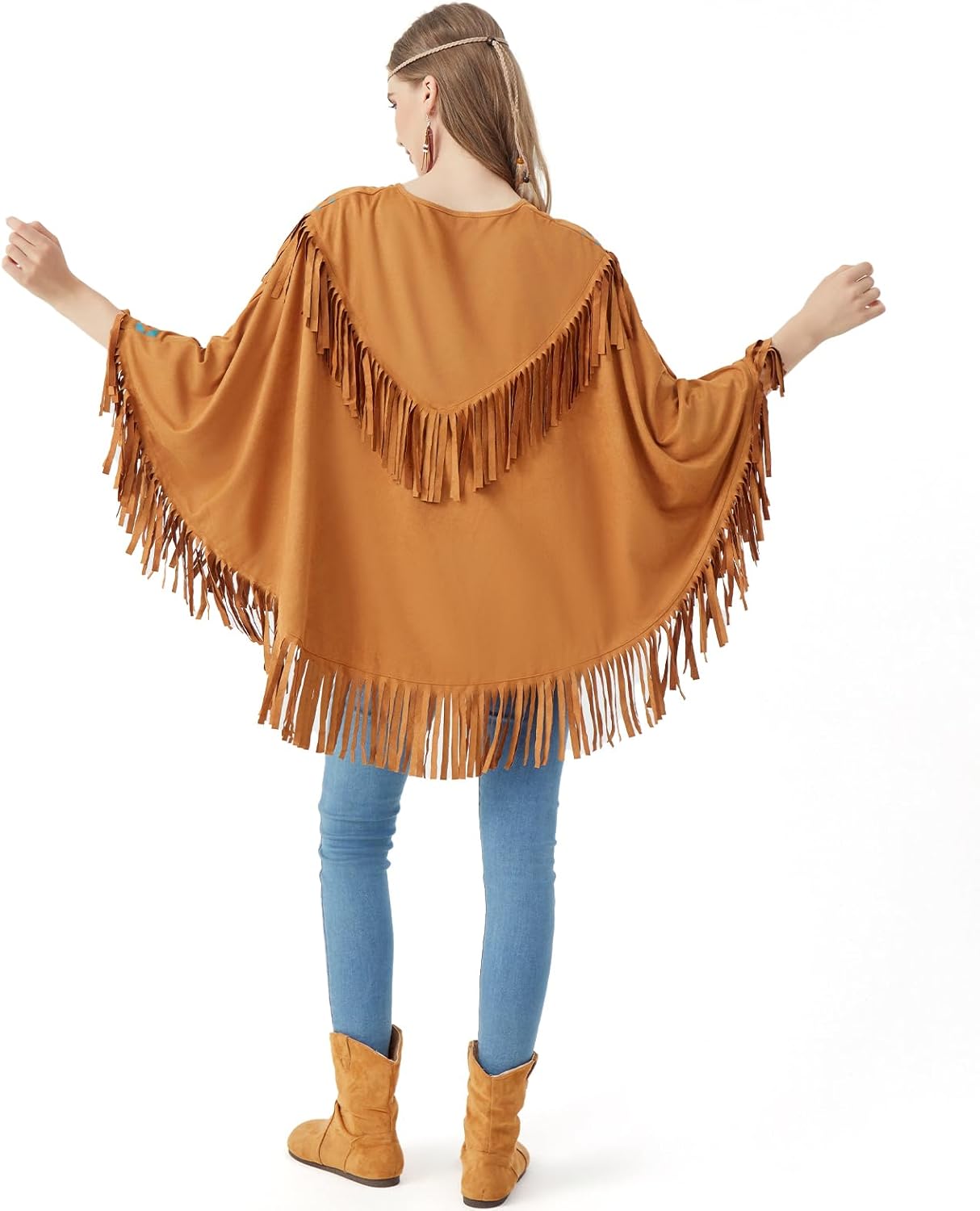 Poncho indiano marrone indiano top da donna costume da cowboy capo squaw carnevale fast night halloween cosplay mantello effetto pelle con frange costume di carnevale per esterni