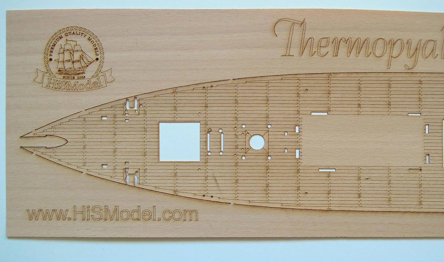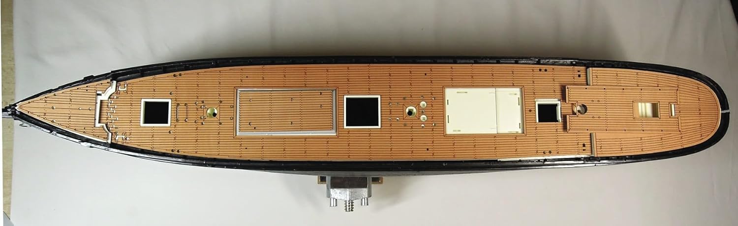 Tavola impiallacciata di precisione (0,3 mm) in rovere e faggio, adatta per il modello Revell Thermopylae in scala 1:96. Con autentico design floreale, assi marcate, struttura a "vie d'acqua" e marcature realistiche per unghie, ideale per una riproduzione dettagliata della costruzione navale storica. Include istruzioni per un facile montaggio.