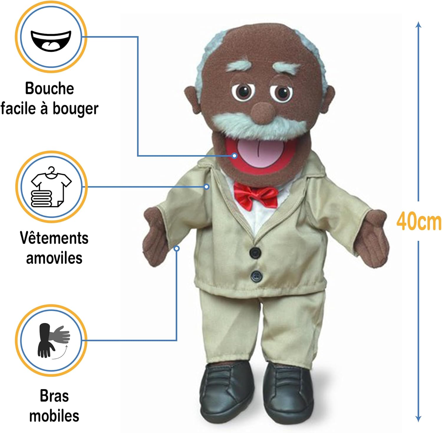 Burattino a bocca mobile di alta qualità realizzato da Silly Puppets. Progettato per i bambini ma si adatta alla maggior parte delle mani degli adulti. Bocca e braccia facili da spostare. Ingresso manuale dal fondo del burattino. Altezza: circa 40 cm. Peso leggero: solo 200 g. L'abbigliamento splendidamente progettato e dettagliato è rimovibile.
