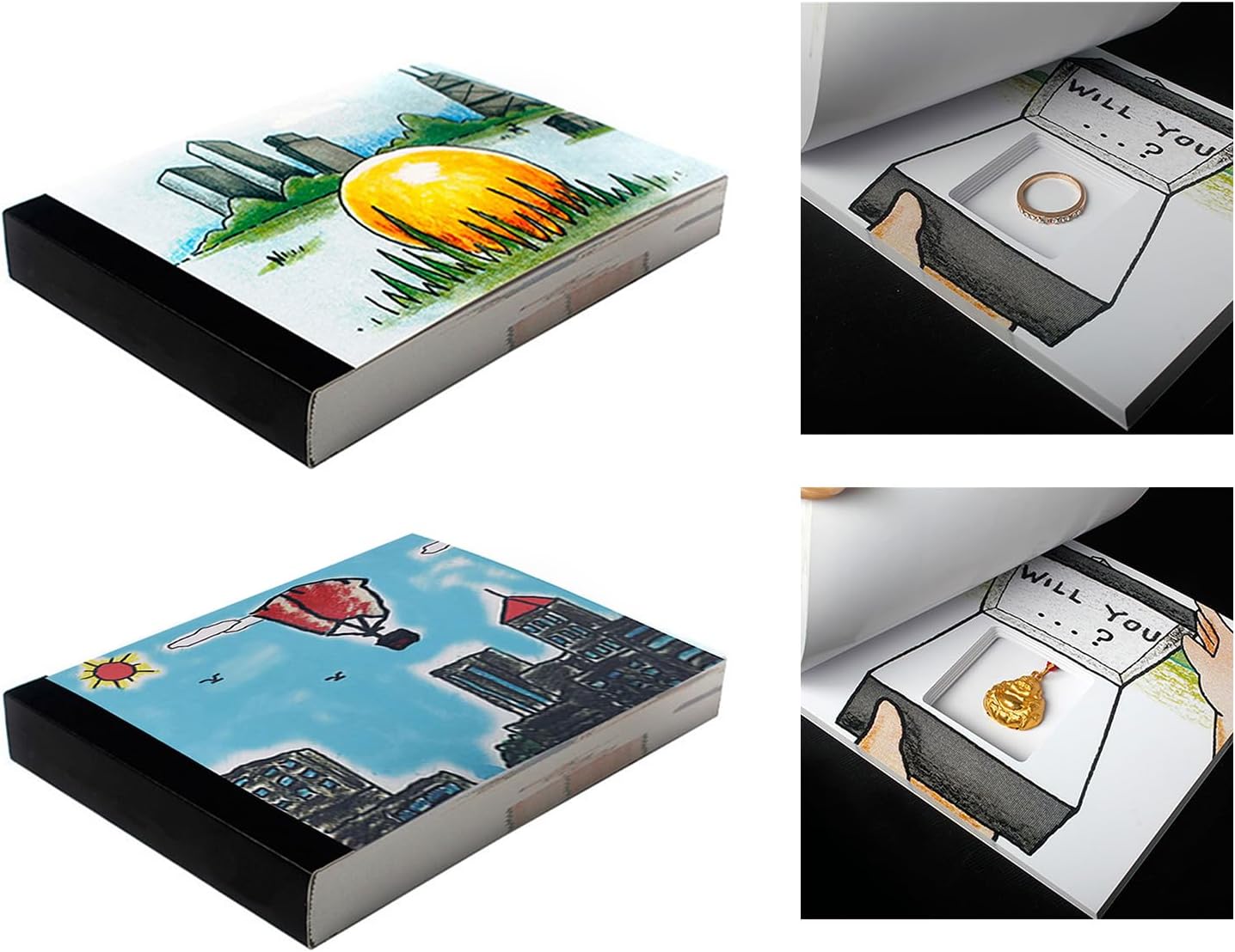 Arricchisci la tua proposta con la scatola porta anelli pieghevole e stravolgi il tradizionale fidanzamento unendo narrazione e sorprese per momenti indimenticabili. Adatto per fidanzamenti, anniversari, San Valentino, compleanni o occasioni speciali. Questo supporto per anelli può modificare tutte le impostazioni direttamente dal libro pieghevole alla scena. Perfetto per chi è alla ricerca di proposte indimenticabili. La nostra scatola per anelli è adatta sia agli uomini che alle donne che vogliono dimostrare il loro amore in modo unico e creativo. Mantieni il tuo posto nel loro cuore come la loro storia d'amore con questa accattivante scatola ad anelli con libro di cartoni animati. Questo portagioie presenta un'affascinante storia di cartoni animati e luci a LED per mostrare il tuo anello con un gioco d'amore alla moda