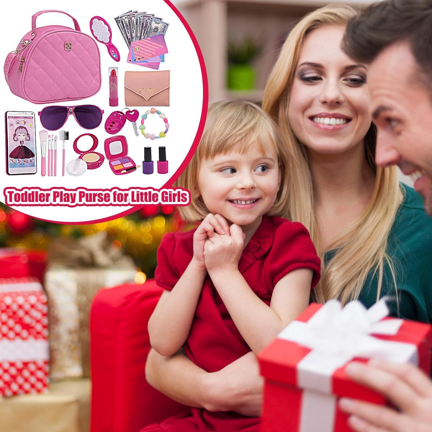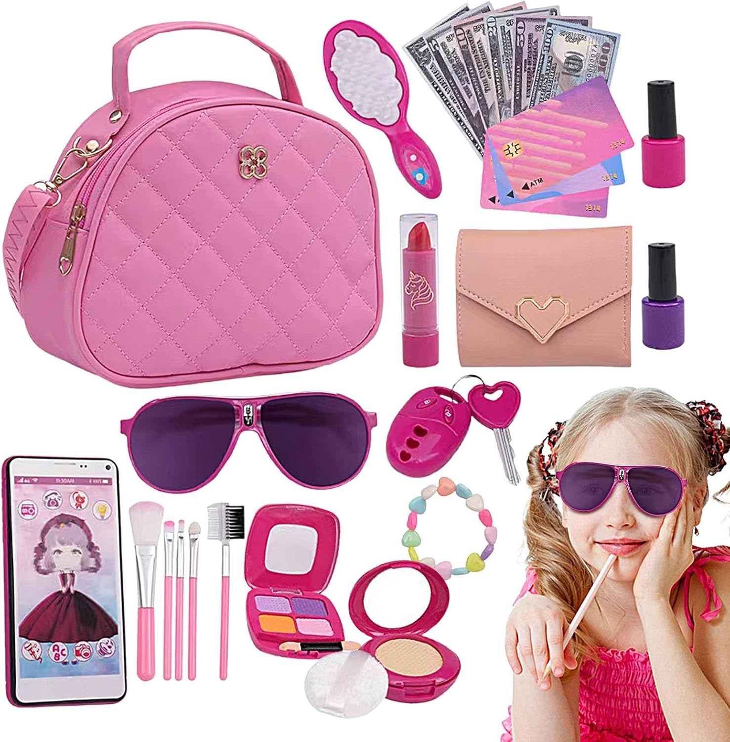 Kit borsa all-inclusive: la nostra borsa da gioco per bambine è più di un semplice giocattolo. Include borsa, portafoglio, telefono cellulare, chiavi della macchina, occhiali da sole, carte di credito e kit trucco immaginario, tutti progettati per incoraggiare il gioco di ruolo e simulare esperienze di shopping reali per il tuo bambino, aiutando a sviluppare abilità indispensabili per la vita. Materiali adatti ai bambini: la nostra borsa da gioco per ragazze incoraggia il gioco di simulazione con un design e una sensazione realistici, con rossetti luminosi e cuscini d'aria che favoriscono l'immaginazione garantendo al contempo un tempo di gioco sicuro e innocuo. Incoraggia l'immaginazione interattiva: la nostra borsa da gioco per bambine viene fornita con luci e suoni realistici del telefono che contribuiscono all'esperienza fantasiosa, favorendo il tempo di gioco interattivo e lo sviluppo delle abilità sociali. Alta durabilità: mantieni gli accessori di tua figlia organizzati con questa borsa da gioco che dispone di una tracolla regolabile per un facile trasporto. Realizzato con materiali di alta qualità e cerniera in metallo, il design spazioso consente una conservazione pratica e pratica di tutti gli accessori inclusi. Regalo sorprendente: rendi indimenticabili compleanni, Natale, Pasqua, Capodanno e altre occasioni speciali con questa borsa da gioco per bambine. Adatto per bambini dai 3 agli 8 anni, è la scelta perfetta come regalo.