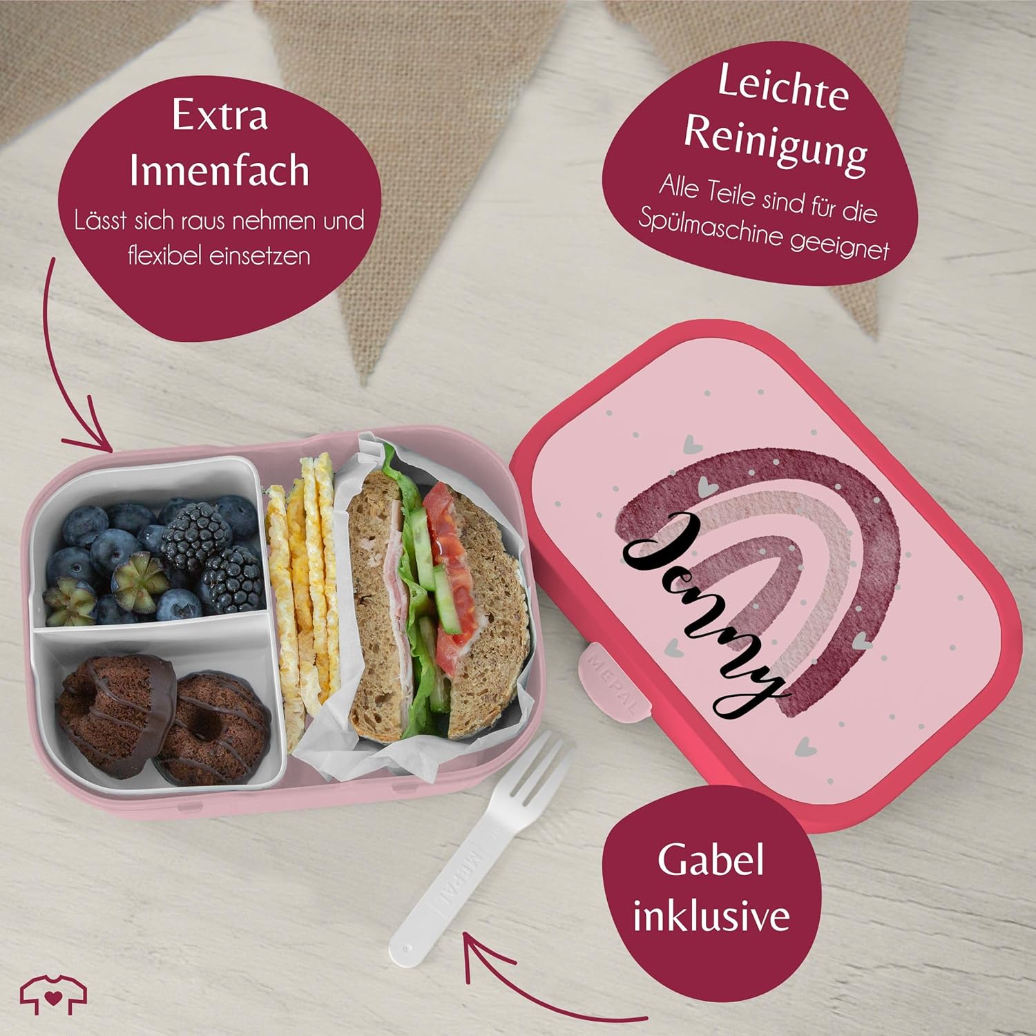 | Enthaltene Komponenten | Bento-Einsatz, Brotdose, Snack-Gabel |
