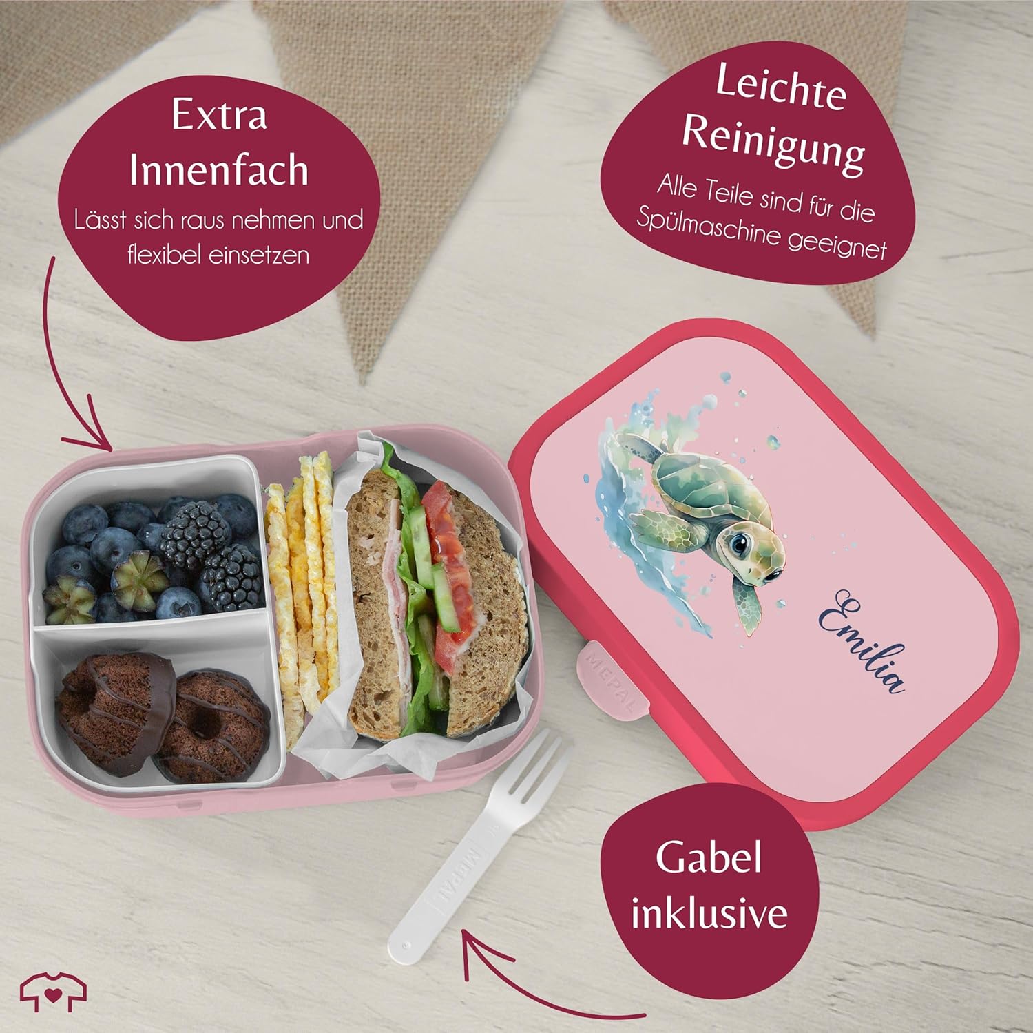 REGALO TARTARUGA: fantastico motivo con tartaruga in stile acquerello per bambini Inserto Bento: questo bellissimo contenitore per il pranzo per bambini consente di separare il cibo grazie all'inserto Bento rimovibile e può quindi essere utilizzato in vari modi. Che si tratti del classico pranzo o della frutta fresca e secca per la scuola, grazie agli scomparti tutto rimane fresco e appetitoso. Forchetta snack: il contenitore per il pranzo ti invita a gustare un'ampia varietà di cibi con la piccola forchetta snack. Il contenitore per snack non è adatto al microonde. Per riscaldare il cibo è quindi necessario toglierlo dal contenitore del pranzo. Lavabile in lavastoviglie: la pulizia del contenitore per il pranzo dei bambini può essere effettuata facilmente in lavastoviglie dopo l'uso. Sia il contenitore per il pranzo, l'inserto bento che la forchetta sono lavabili in lavastoviglie e quindi facili e igienici da pulire. Il materiale del contenitore per il pranzo è privo di BPA e adatto agli alimenti, quindi non dovrai preoccuparti delle sostanze chimiche nocive. Leggero: con un peso di soli 250 grammi, il contenitore per il pranzo stampato può essere facilmente portato ovunque. Con una dimensione di 132 mm di larghezza, 178 mm di lunghezza e 61 mm di altezza, il contenitore per il pranzo è compatto e perfetto per la borsa della scuola o lo zaino. Con una stampa divertente, il contenitore per il pranzo è perfetto per l'inizio della scuola e per ogni altra pausa pranzo