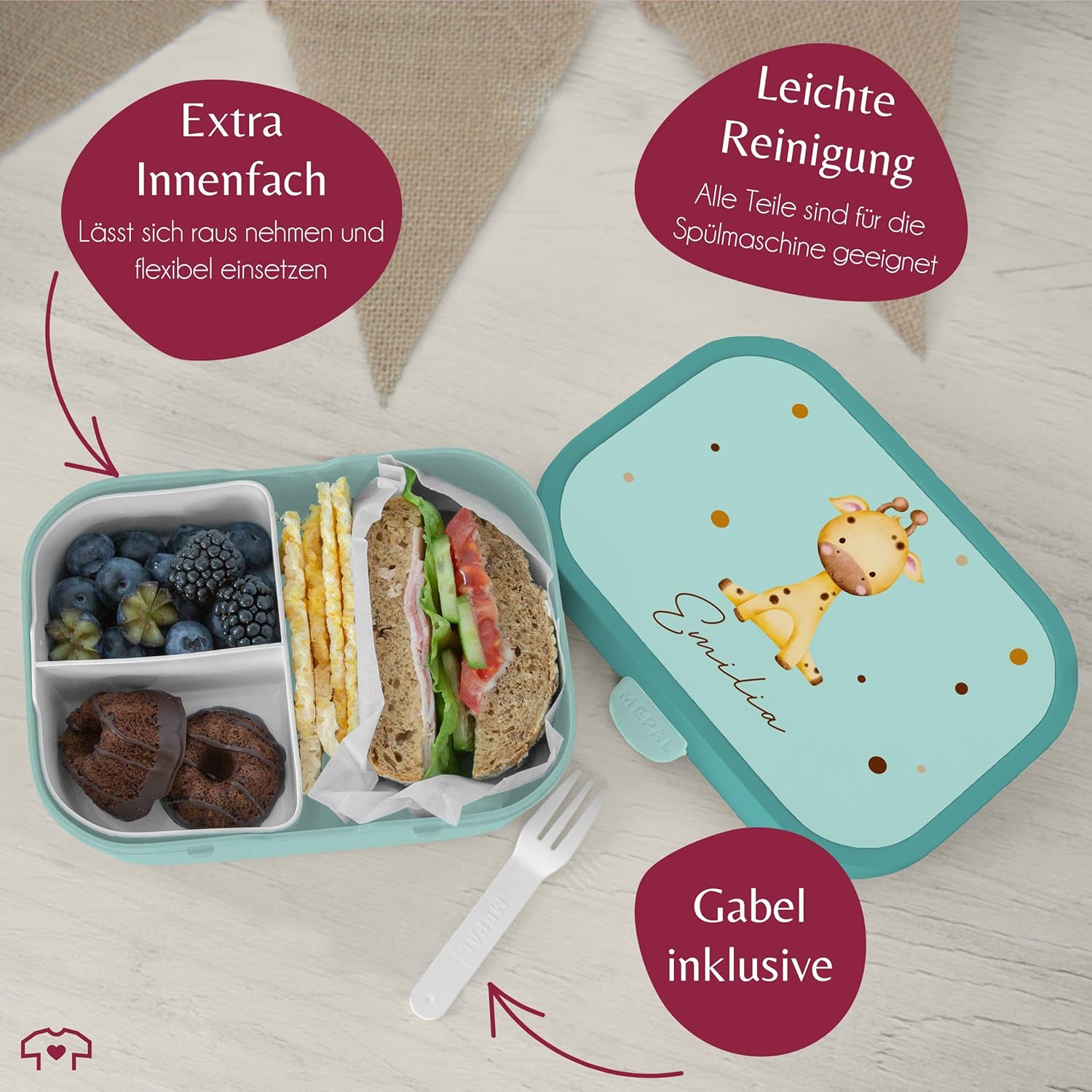 | Enthaltene Komponenten | Bento-Einsatz, Brotdose, Snack-Gabel |