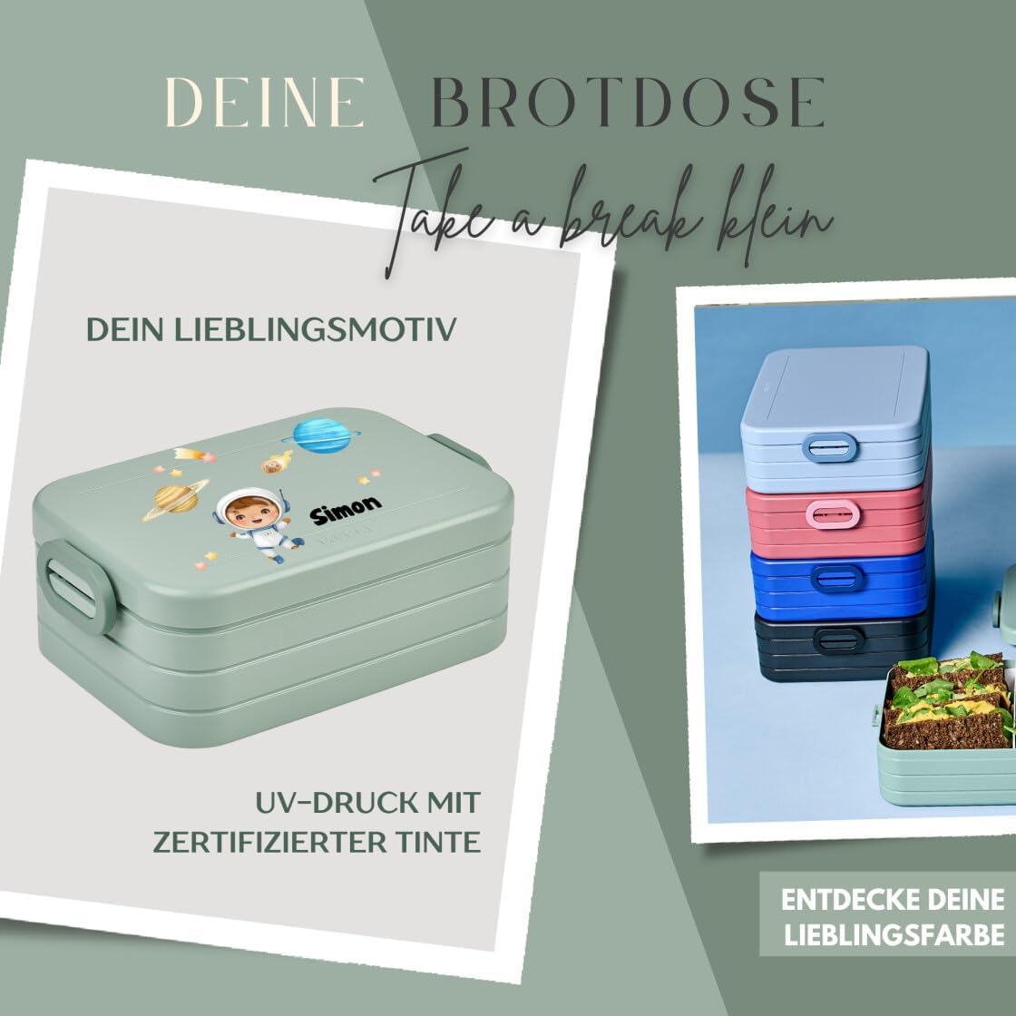 Lunch box personalizzato: Lunch box Mepal con stampa colorata e nome. Clicca sul pulsante giallo “Personalizza ora” e personalizza un pezzo davvero unico. Design accurato: contenitore per il pranzo per bambini con scomparti e inserto bento con forchetta. Perfetto per porzionare un'ampia gamma di snack come yogurt, frutta, salse o dolci. Chiusura a clip adatta ai bambini e facile da aprire. Pratico nella vita di tutti i giorni: contenitore perfetto per le pause per la scuola, l'asilo, le escursioni e i viaggi. Il contenitore per il pranzo è a prova di perdite e può quindi essere idealmente portato con sé nello zaino della scuola. Stampa certificata: la personalizzazione e il motivo colorato sono adatti ai bambini e rispettosi dell'ambiente. Il corpo del contenitore per il pranzo è lavabile in lavastoviglie. Il regalo perfetto: sorprendete ragazze e ragazzi con un regalo distintivo per l'inizio della scuola, i compleanni e ogni altra occasione. Un'idea regalo unica e personalizzata.