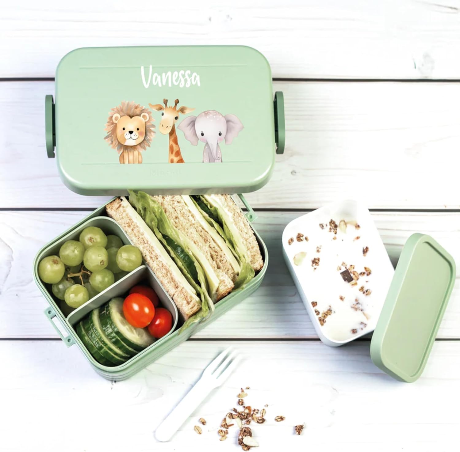 🎨 DESIGN: contenitore per il pranzo dal design amorevole con motivo Jungle Trio - perfetto per piccoli avventurieri ed esploratori. 🖋️ PERSONALIZZAZIONE: il portapranzo viene stampato individualmente con il nome desiderato: un articolo davvero unico per l'asilo e la scuola. 📦 QUALITÀ: contenitore per il pranzo midi di alta qualità: robusto, durevole e senza BPA. 🍎 PRATICO: Ideale per panini, snack e frutta - chiusura sicura e facile da aprire. 🎁 IDEA REGALO: ottimo regalo personalizzato per i compleanni dei bambini, l'inizio della scuola o l'inizio dell'asilo nido.