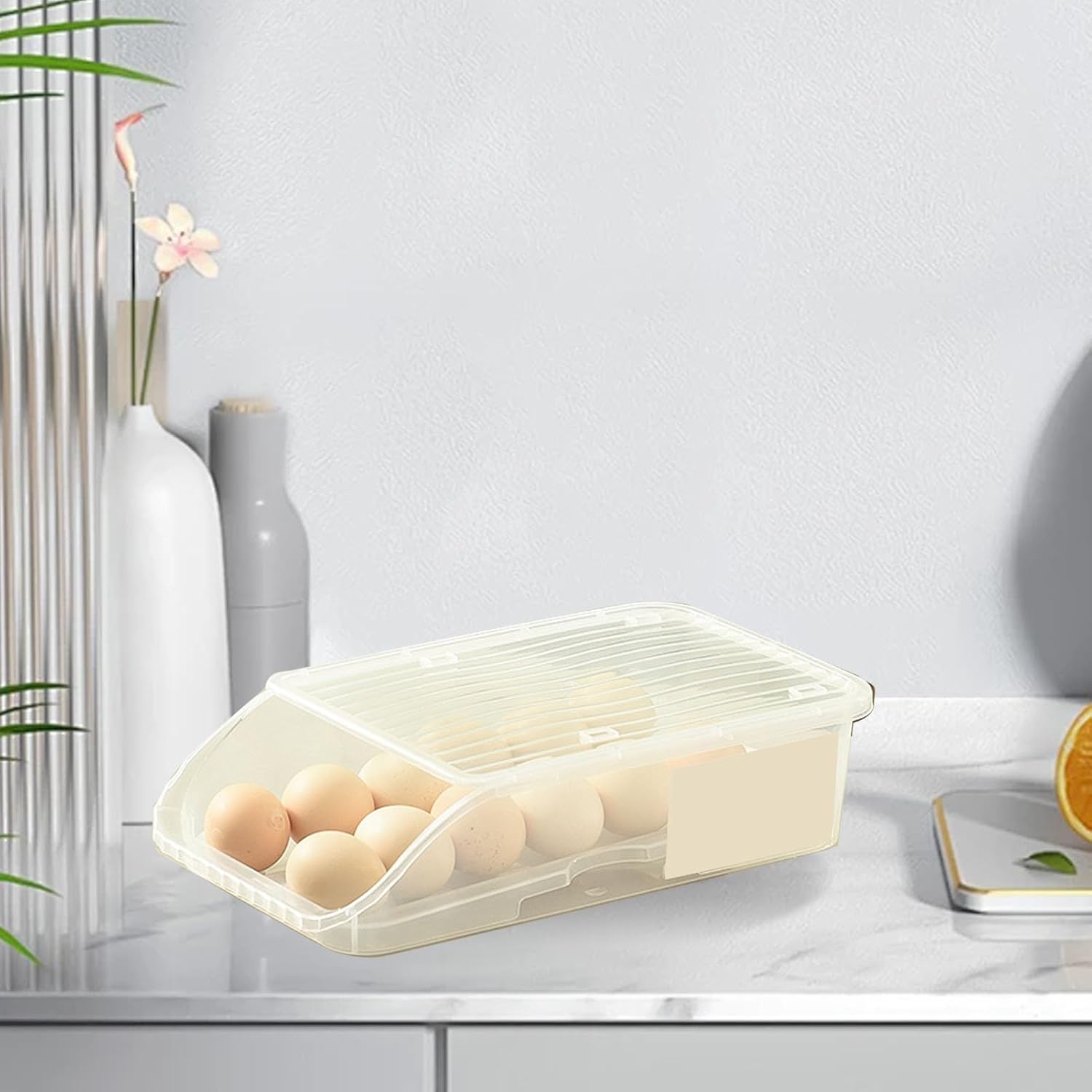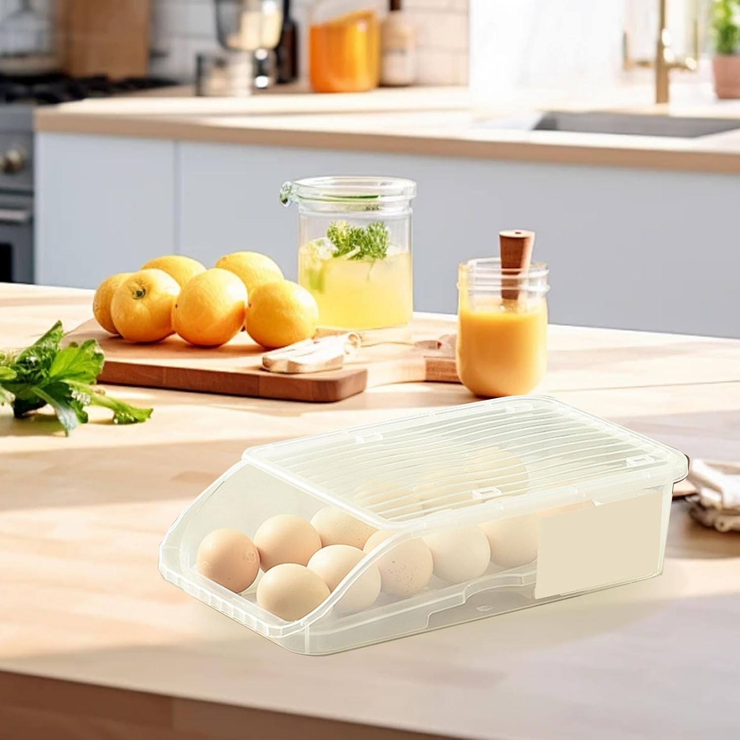 [Design innovativo a rotolamento automatico] La scatola per la conservazione delle uova presenta un design innovativo a rotolamento automatico che garantisce che le tue uova rimangano fresche e organizzate. Basta aprire e girare le uova con un semplice rullo, comodo ed efficiente per l'uso quotidiano. Questo design non solo mantiene le uova in buone condizioni, ma aggiunge anche un tocco moderno alla tua cucina. [Salvaspazio e compatto] Questa scatola per uova si adatta alla tua cucina, alla tua cucina e al tuo frigorifero. Le dimensioni compatte ti consentono di massimizzare lo spazio di archiviazione senza compromettere la funzionalità. per cucine piccole o per chi cerca di ottimizzare lo spazio nel frigorifero. [COSTRUZIONE DUREVOLE E AFFIDABILE] Realizzato in plastica di alta qualità, questo contenitore per uova è progettato per durare. È robusto, resistente agli urti e può resistere all'uso quotidiano. La struttura durevole garantisce che le tue uova siano conservate in modo sicuro e protette da danni, rendendole affidabili per la tua cucina. [Uso versatile e multiuso] Questo vassoio per uova non solo può contenere uova, ma può anche contenere altri piccoli oggetti come frutta, verdura o persino materiali artigianali. Il design versatile lo rende un'aggiunta pratica a qualsiasi cucina e ti consente di utilizzarlo per varie esigenze di conservazione oltre alle uova. [Facile da pulire e igienico] Il contenitore per le uova è facile da pulire, rendendolo igienico per conservare le uova. Basta rimuovere le uova dalla scatola e sciacquarle con acqua. La superficie liscia garantisce che sia facile da mantenere e rimanga pulita, fornendo una soluzione di conservazione sicura e igienica per le tue uova.