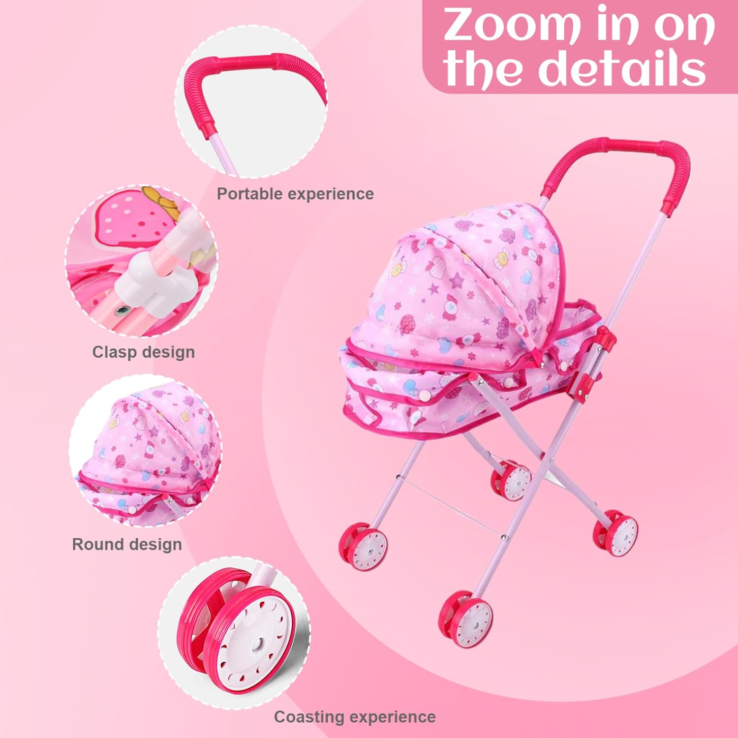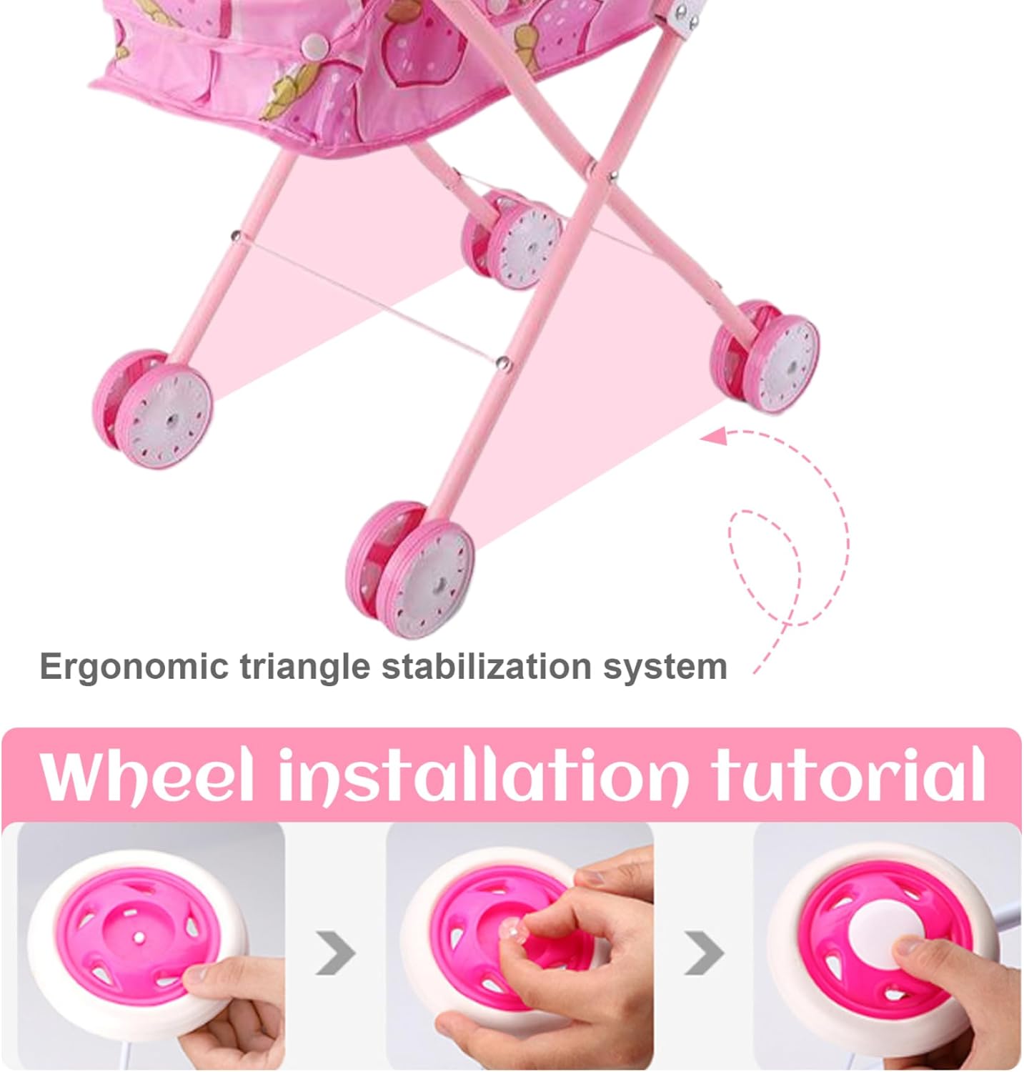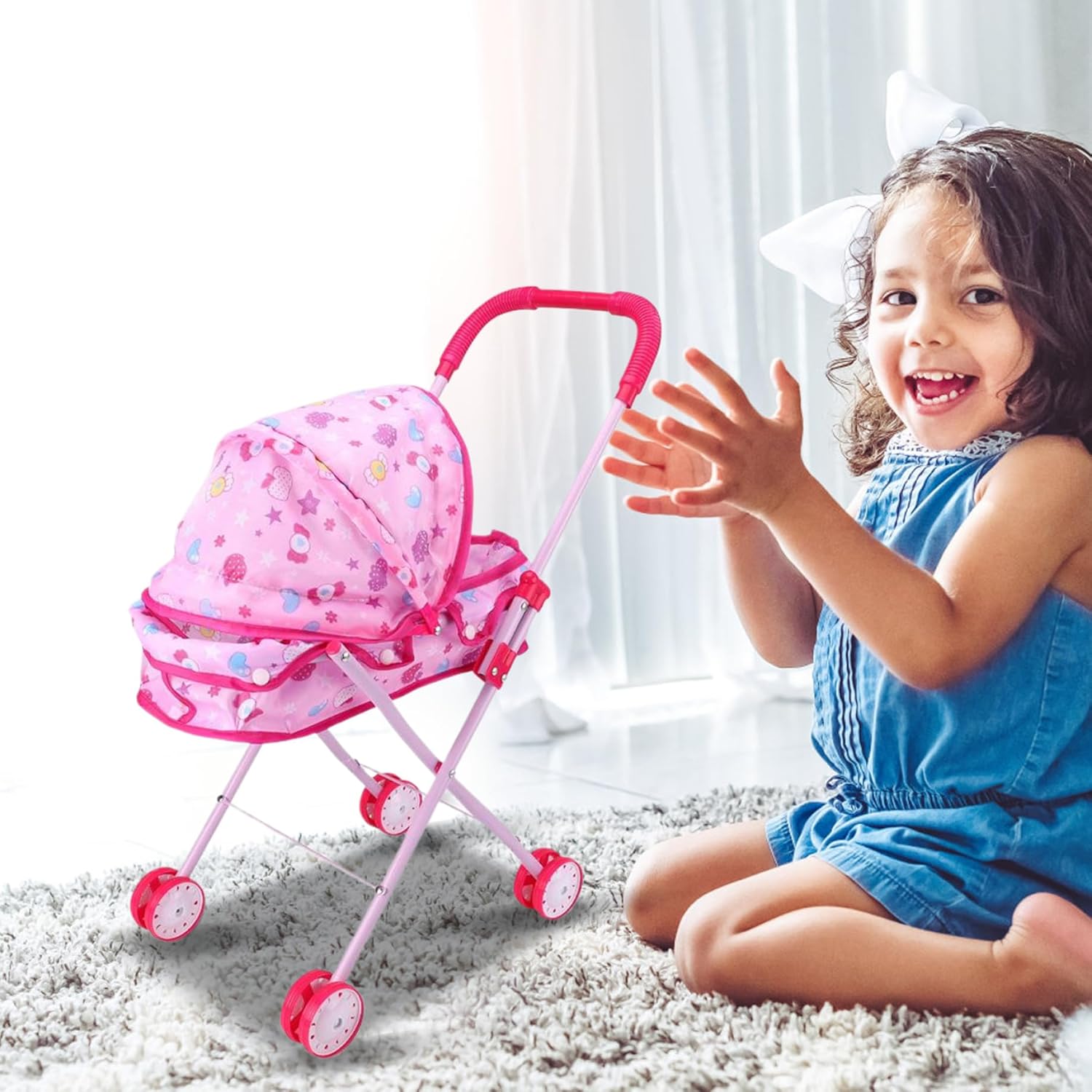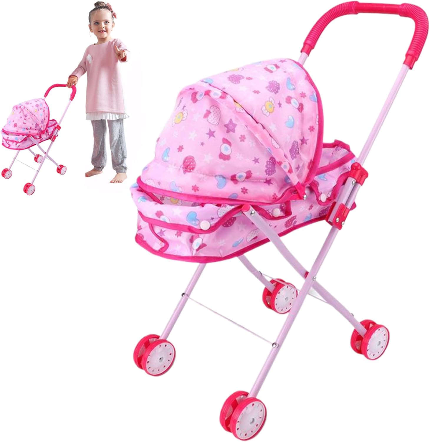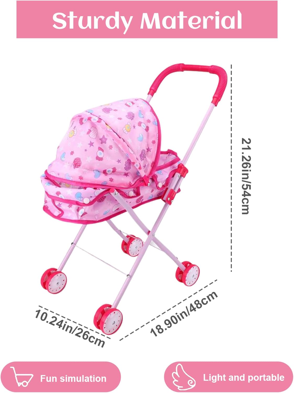 Frame di ferro robusto: il passeggino della bambola per bambini è costruito con una robusta cornice di ferro in grado di gestire il gioco energico del tuo piccolo..Questa costruzione garantisce che il passeggino durerà attraverso innumerevoli avventure, offrendo un divertimento duraturo per i bambini. Sedili morbidi e sicuri con cintura di sicurezza: progettato con un sedile accogliente e una cintura di sicurezza, questo passeggino per bambole dà la priorità alla sicurezza di tuo figlio proprio come un vero passeggino per bambini..Le doppie ruote su tutte le gambe garantiscono stabilità e facilità di controllo..Inoltre, il tessuto carino con stampe di cartoni animati divertenti è rimovibile per una facile pulizia. Design affascinante e realistico: il passeggino delle bambole per bambini dispone di un design adorabile e realistico che ricorda un vero passeggino..Ciò incoraggia la creatività e le abilità sociali nei bambini, promuovendo il gioco di ruolo fantasioso e coltivando la loro capacità di mostrare compassione. Piegabile per una facile memoria: una delle caratteristiche straordinarie di questo passeggino per bambole per bambini è il suo design pieghevole, che lo rende un gioco da ragazzi da conservare quando non è in uso..Questa funzione di risparmio spaziale è perfetta per mantenere la tua casa organizzata e senza ingombri. Dimensioni perfette per le bambole: misura 26 x 48 x 54 cm, questo passeggino giocattolo ha le dimensioni giuste per trasportare bambole e animali di peluche..Il tuo bambino può facilmente portare i loro compagni preferiti per il, migliorando il divertimento e l'eccitazione durante il gioco.