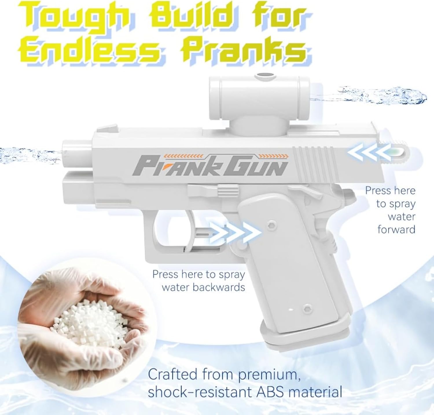 Prank Water Gun: Master hilarious tricks with our unique two-way spray system! The main trigger delivers an unexpected reverse splash for self-soaking laughs, while the rear button unleashes a forward stream to catch friends off guard Simple, Instant Fun: Effortlessly switch between hilarious reverse splashes and direct sprays using intuitive dual controls (trigger + button) for non-stop laughs. Strong & Far-Reaching Spray Action: Engineered for maximum impact, this prankster essential shoots powerful, targeted water streams with impressive range. Guarantee a perfect hit every time for the most satisfying practical jokes Tough Build for Endless Pranks: Crafted from premium, shock-resistant ABS material, this water blaster withstands accidental drops and rough play. Built super durable for long-lasting prank sessions and repeated fun Portable Water-Based Entertainment: Lightweight construction and splash-resistant components make this suitable for poolsides, parks, or backyard use