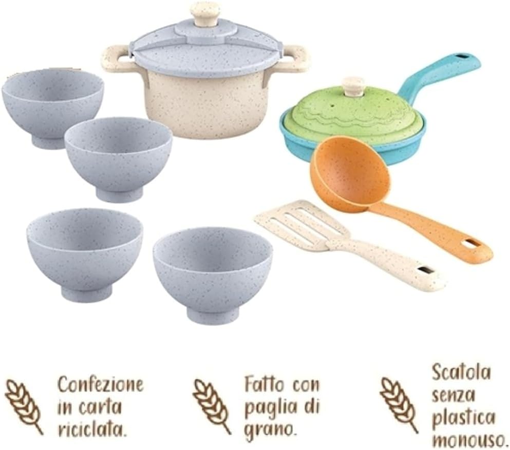 ✔️Eco chef set Pentole da cucina Gourmet 12 pezzi - Giocattolo in materiali ecologico ✔️Set composto da : spatola, mestolo, 2 posate, pentola e coperchio, padella e coperchio, 4 scodelle. Dimensione scatola 30 x 20 x 11 cm ✔️ Per 3 anni + ✔️Include portachiave pailettes linea PRESTIGE & DELUXE di colore e forma casuale