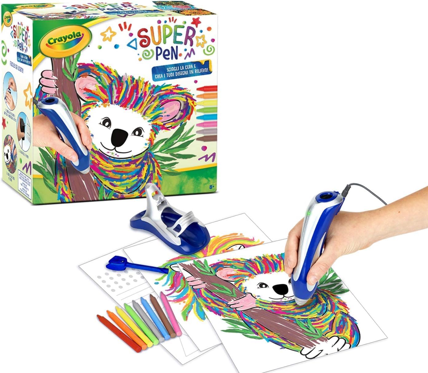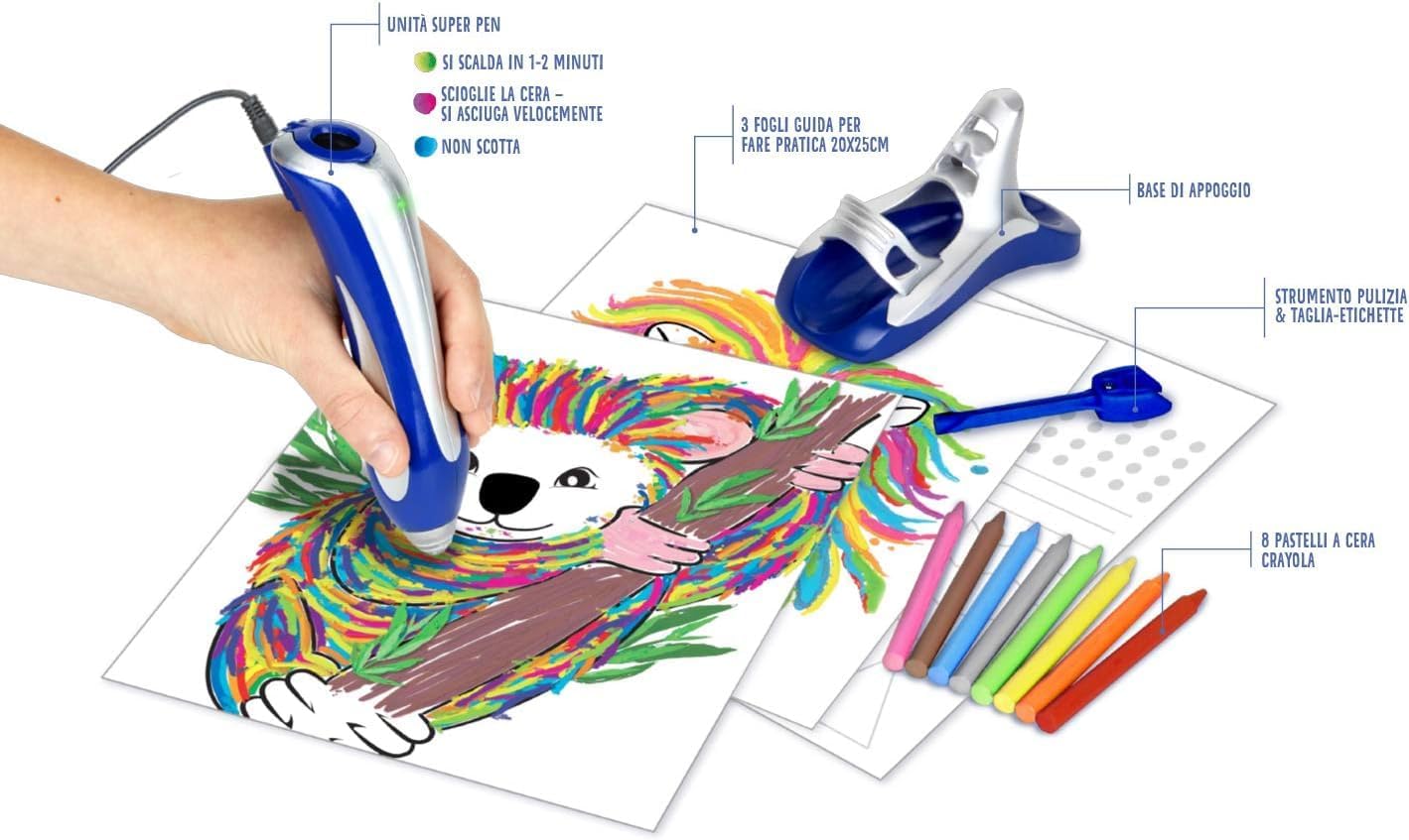 ✔️Super Pen è la penna magica che permette di sciogliere i pastelli a cera per creare disegni in rilievo ✔️Non scotta e mantiene una bassa temperatura costante che permette un’erogazione continua della cera in tutta sicurezza ✔️Si può utilizzare su diversi materiali come tela, legno, vetro, cartoncino e non mettere limite alla creatività; da usare solo con pastelli a cera ✔️Contenuto: 1 unità Super Pen, 8 pastelli a cera, 3 fogli guida 20x25 cm, 1 strumento multifunzione, base di appoggio, adattatore, guida rapida e istruzioni Età: 8+ ✔️Omaggio portachiave pailettes e penna sirena linea Prestige & Deluxe