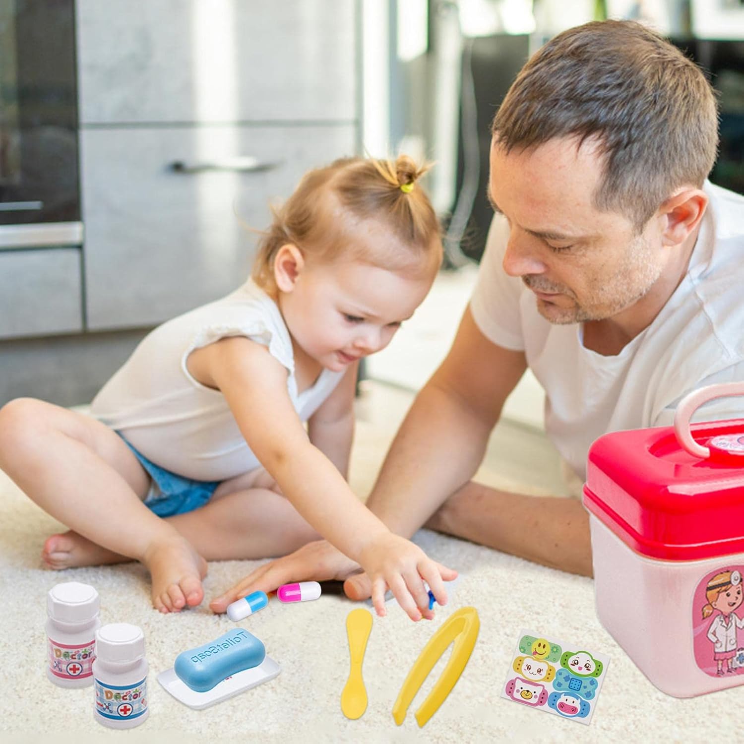 【Interazione genitore-figlio】 Il set di giocattoli per bambini aumenta l'interazione genitore-figlio, aiuta a stabilire un contatto e promuove le abilità motorie e le abilità pratiche Ridurre l'ansia: aiuta il tuo bambino a ridurre la sua paura del medico e a sviluppare le sue qualità di cura mentre impara quotidianamente i compiti e le attrezzature di un medico Sicuro e affidabile: questo set di giocattoli per bambini è sicuro e affidabile, è realizzato in materiale ABS di alta qualità, sano ed ecologico e non contiene oggetti appuntiti Quantità sufficiente: il set da gioco per pediatra contiene 23 pezzi, quantità sufficiente, tappi per le orecchie in silicone morbido, adatti per le orecchie dei bambini, in modo che i bambini possano sviluppare la loro creatività e immaginazione Il miglior regalo: i giocattoli da dottore sono il regalo perfetto per compleanno, Natale o Pasqua per tuo figlio o tua figlia. Che grande regalo, può offrire ai bambini un divertimento infinito e amato dai bambini