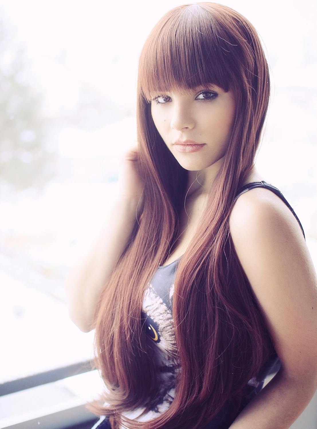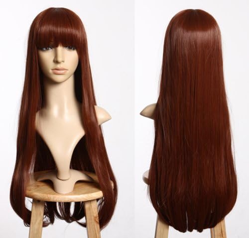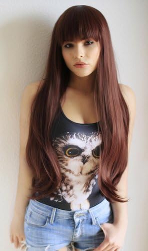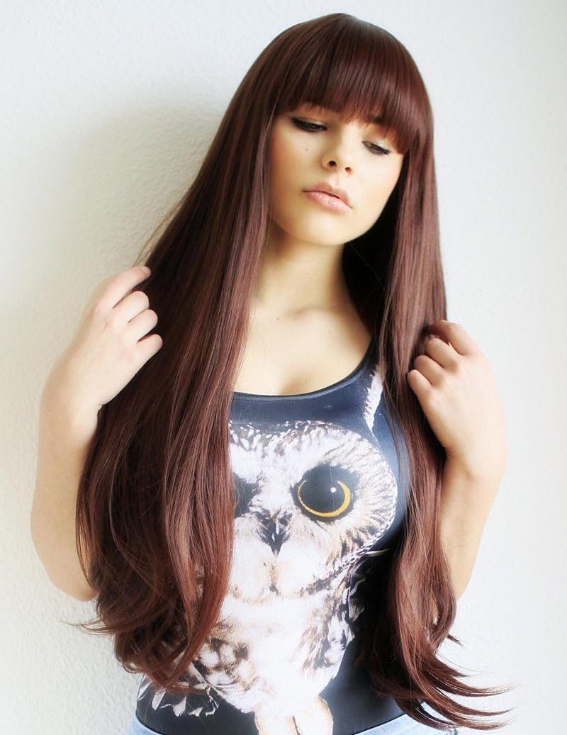 Prettyland C865 - parrucca capelli extra lunghi lisci voluminosi 75cm castano con frangia dritta corta parrucca capelli lisci lunghezza ca. 75cm in un colore castano molto naturale. capelli voluminosi con frangia spessa dritta che saltano all'occhio! Grazie alle sue fibre morbide ed il look naturale è ideale da indossare tutti i giorni, però anche per conventions/cons, shootings, teatro, film, feste/feste a tema, cosplay, halloween e carnevale Una cuffia per capelli è inclusa gratis nella consegna