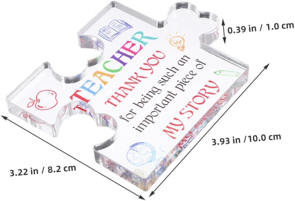 Ideale per l'apprezzamento dell'insegnante: è per la giornata dell'insegnante, la scelta della laurea e altre occasioni, questi puzzle esprimono gratitudine e apprezzamento in un modo unico, puzzle in acrilico per insegnanti, puzzle in acrilico di ringraziamento Scelta versatile: ideale per la festa dell'insegnante, la scelta della laurea e altre occasioni speciali, rendendolo un premuroso e memorabile per gli educatori, puzzle di ringraziamento per l'insegnante, fermacarte di apprezzamento per l'insegnante Materiale acrilico: questi puzzle sono realizzati in acrilico di alta qualità, garantendo una finitura liscia, una sensazione di leggerezza e una , grazie blocco , fermacarte in blocco acrilico Stampa chiara e accattivante: la stampa acrilica su questi blocchi acrilici assicura che il messaggio sia chiaro e visivamente accattivante, rendendolo un pezzo straordinario, placca puzzle per insegnanti, puzzle inciso per insegnanti Costruzione acrilica: realizzati in acrilico, questi puzzle offrono una superficie liscia, sensazione di leggerezza e , blocco acrilico grazie all'insegnante, puzzle per la giornata degli insegnanti