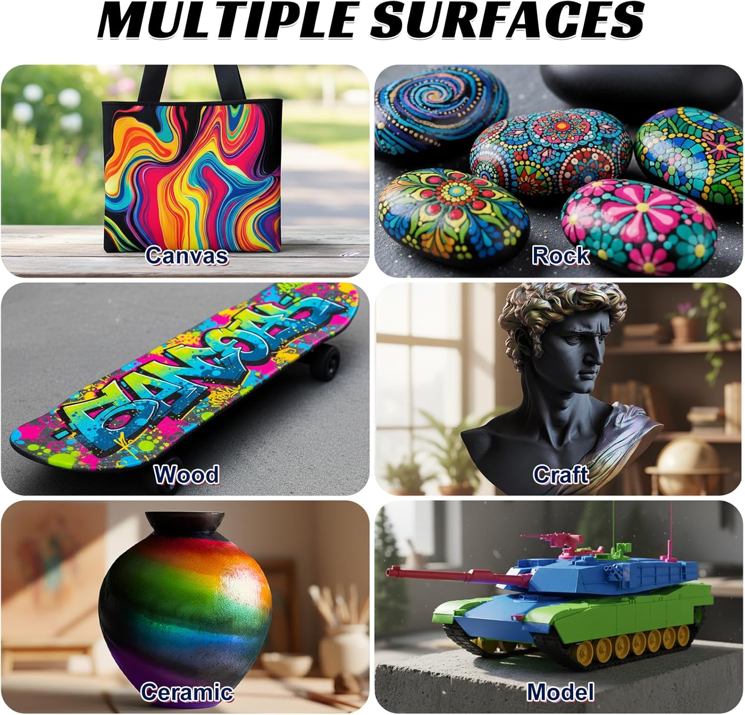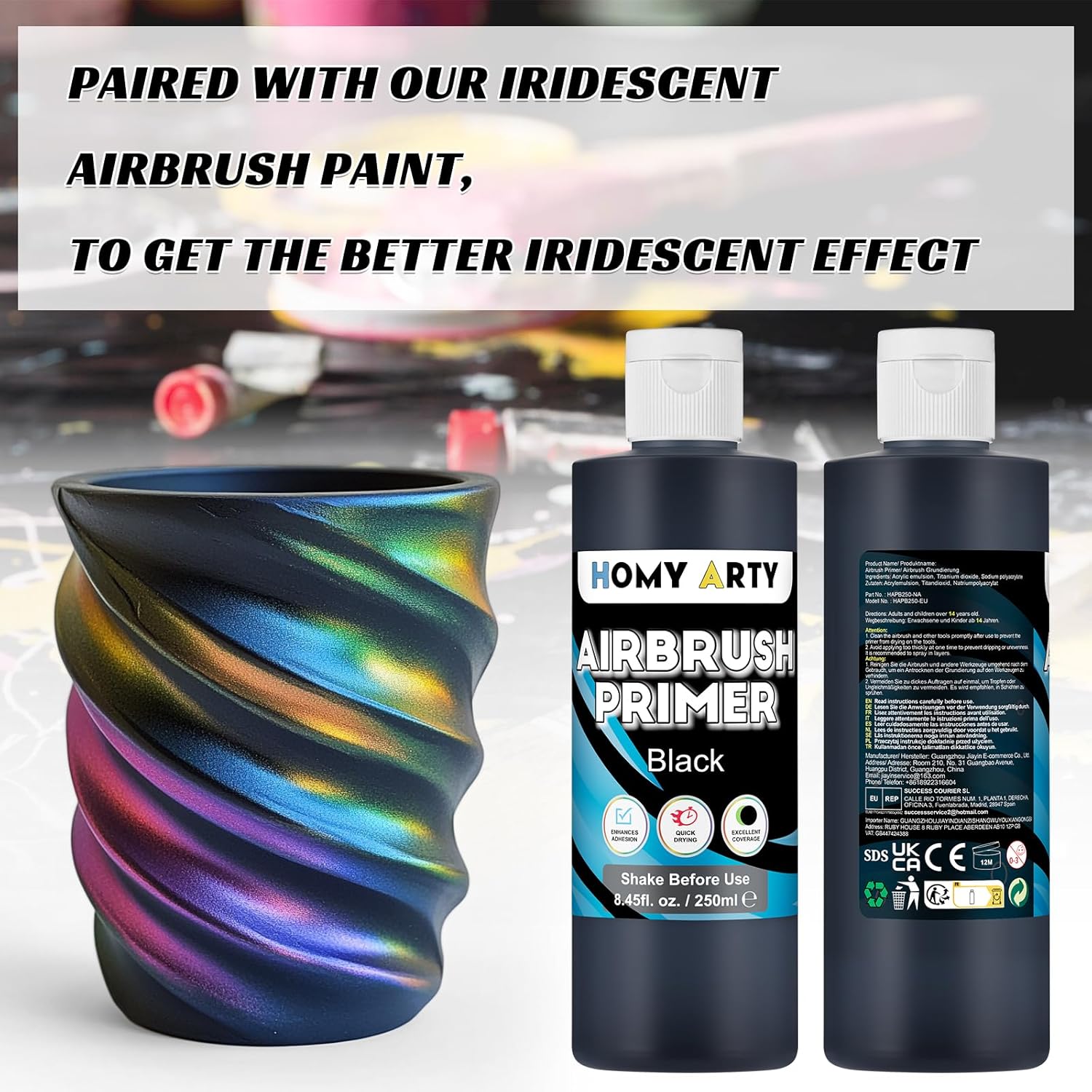 Adesione migliorata: il nostro primer nero ha una capacità di 250 ml. L'applicazione di questo primer prima di utilizzare colori acrilici migliora significativamente l'adesione delle vernici, garantendo una finitura durevole e duratura Maggiore saturazione del colore: l'utilizzo del primer nero migliora la vivacità del colore, rendendo il risultato finale più visivamente sorprendente. Abbina il nostro primer nero con vernici iridescenti aerografo per effetti iridescenti ancora migliori Forte copertura: il nostro primer per aerografo copre efficacemente il materiale sottostante, fornendo una base uniforme per l'applicazione della vernice acrilica Applicazione versatile: il primer per vernice acrilica può essere applicato con un aerografo o direttamente con un pennello. Può anche essere miscelato con diluenti e compatibile con varie vernici acriliche. È adatto per superfici come vetro, legno, plastica, metallo e tessuto Profondità e dimensioni: se utilizzato con vernici trasparenti o semitrasparenti, il primer nero aggiunge profondità visiva e dimensione, rendendo la tua opera d'arte più dinamica e coinvolgente