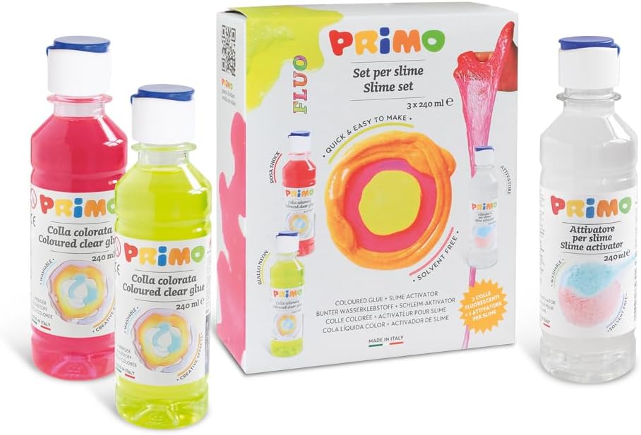 KIT CREATIVO PER CREARE SLIME FLUO: Contiene 2 colle colorate fluorescenti 240 ml + 1 attivatore 240 ml. Versare 60 ml di colla in una ciotola e aggiungere 30 ml di attivatore, mescolando bene per ottenere una consistenza compatta e uniforme e modellare per qualche minuto. In breve tempo otterrai uno slime elastico e divertente. Una volta finito di giocare, si può conservare in un contenitore ermetico COLLA AD ACQUA FLUORESCENTE CON TAPPO DOSATORE PER CARTOLERIA E MATERIALE SCOLASTICO: Il tappo dosatore assicura un utilizzo pratico e agevole, riducendo sprechi e garantendo una lunga durata del prodotto AD ALTO POTERE COLLANTE, SICURA SENZA SOLVENTI E GLUTEN FREE: Formulata specificamente per l'adesione su carta, il prodotto offre un alto potere collante. Per ottenere un ottimo potere adesivo, è consigliabile lasciare asciugare completamente il prodotto PRODOTTO VERSATILE E CREATIVO CREA EFFETTI LUCIDI PER LAVORETTI ARTISTICI: La colla ad acqua colorata fluorescente è trasparente e lucida. Una volta asciutta, forma uno strato lucido e brillante che migliora l'aspetto dei lavoretti artistici. É disponibile in bottiglia in PET da 240 ml con sotto tappo di sicurezza da rimuovere prima dell’uso PRIMO BY MOROCOLOR, QUALITÀ MADE IN ITALY: I colori fanno parte della nostra tradizione di famiglia, iniziata nel 1933 con un gessetto bianco da lavagna. Da oltre 90 anni trasmettiamo l'equilibrio perfetto tra creatività e responsabilità con prodotti per bambini e artisti di alta qualità, sicuri e sostenibili, coniugando tradizione e innovazione e promuovendo il valore del Made in Italy