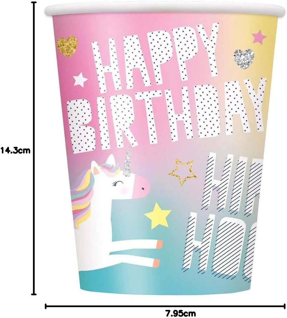 Tema magico unicorno: eleva la festa di compleanno del tuo bambino con i nostri incantevoli bicchieri di carta multicolore con unicorno; progettati per deliziare i bambini e stimolare la loro immaginazione. Design multicolore vivace: le nostre accattivanti tazze con unicorno presentano una splendida tavolozza multicolore, aggiungendo un tocco stravagante e colorato a qualsiasi celebrazione. Dimensioni perfette: ogni confezione da 8 bicchieri di carta da 255 ml assicura che ce ne sia abbastanza per tutti gli ospiti delle feste, e sono di dimensioni ideali per servire bevande rinfrescanti o deliziose prelibatezze. Ecologici e pratici: realizzati in carta usa e getta di alta qualità, i nostri bicchieri di compleanno rendono la pulizia dopo la festa un gioco da ragazzi e aiutano a ridurre gli sprechi ambientali. Ideali per feste per bambini: queste adorabili tazze con unicorno sono l'aggiunta perfetta alla festa speciale del tuo bambino, rendendole un accessorio essenziale per eventi indimenticabili.
