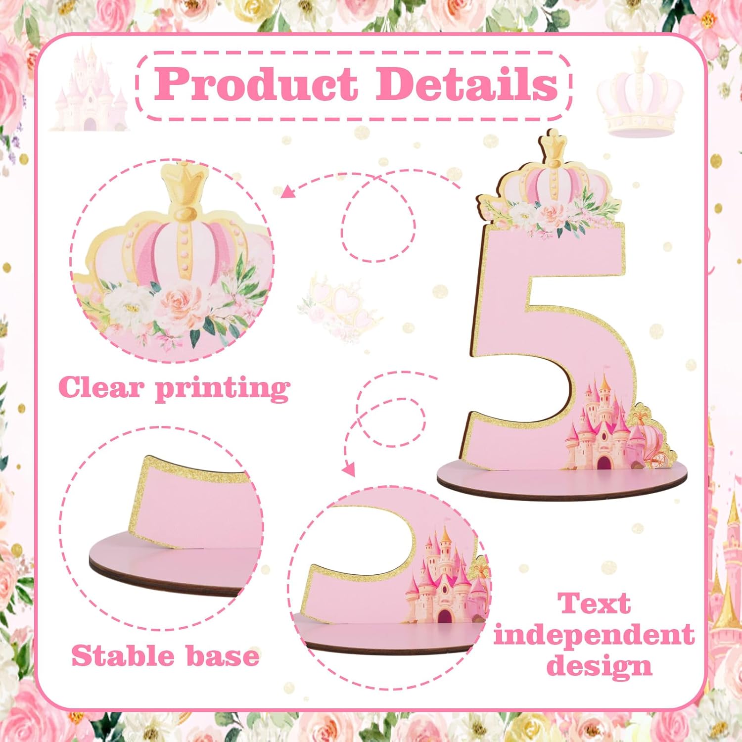 Centrotavola con numero di compleanno: riceverai una decorazione da tavolo in legno con numero a tema principessa, con una base rimovibile e stabile che lo rende facile da riporre. Scegli questa decorazione di compleanno di tre anni, rendendo la festa del 5° compleanno del tuo bambino più speciale e diventa il momento clou delle riunioni di famiglia. Design squisito: il centrotavola con numero di compleanno principessa presenta un design unico principessa e numero 5, mette in mostra perfettamente il tuo tema della festa "Her Royal Fiveness". Sia utilizzato insieme ad altre decorazioni o da solo, questo cartello di compleanno da tavolo in legno porterà divertimento infinito alla tua festa! Materiali di qualità: questa decorazione da tavolo per 5° compleanno è realizzata in legno di alta qualità, garantendo durata e può essere utilizzata più volte, rendendolo una scelta buona ed economica per i genitori. Ampia applicazione: il centrotavola in oro rosa e glitter è molto adatto per decorazioni da tavola per il 5° compleanno del bambino e forniture per feste di anniversario della principessa, anche un accessorio fotografico perfetto per qualsiasi altra occasione, creerà ricordi di compleanno indimenticabili per te e il tuo bambino. Dimensioni adatte per la visualizzazione: il cartello di compleanno della principessa cinque anni misura circa 24,9 x 15,5 x 0,5 cm o 24,8 x 15,6 x 0,5 cm, rendendolo un display prominente sul tavolo della festa, catturerà l'attenzione di tutti.
