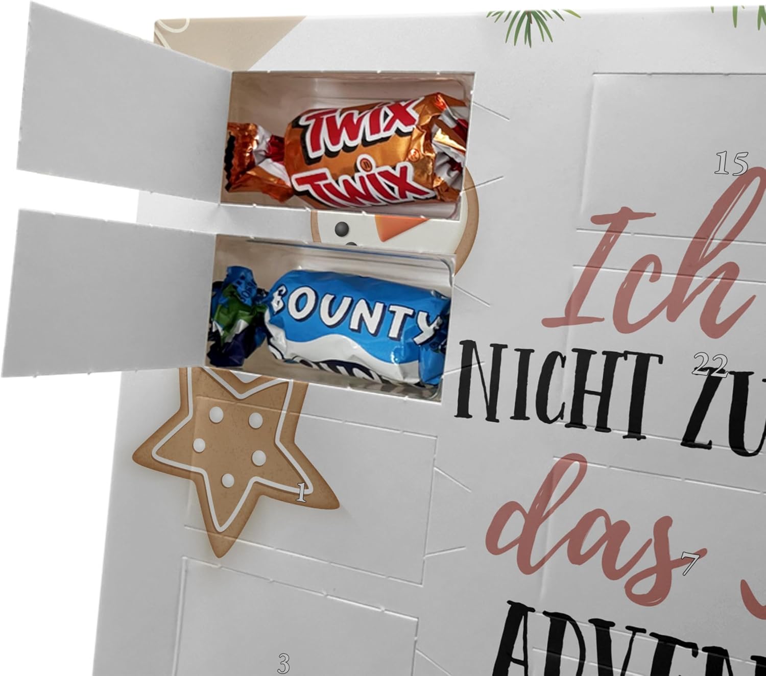 MOTIVO DETTI SUL DAVANTI - Scegli uno dei 30 detti; La frase scelta è stampata come motivo disegnato sulla parte anteriore del calendario. CALENDARIO DELL'AVVENTO RICCO DI CELEBRAZIONI - 24 porte con deliziose sorprese celebrative per ogni giorno dell'Avvento. OTTO VARIETÀ DI CONTENUTO – Maltesers, Mars, Snickers, Twix, Milky Way, Bounty, Galaxy e Galaxy Caramel per vari momenti di divertimento. STAMPA E MATERIALE DI ALTA QUALITÀ – Qualità di stampa brillante con protezione superficiale semiopaca su cartone extra resistente; superfici laterali stampate e stabile dispositivo per appendere/stare in piedi. INFORMAZIONI TECNICHE E SOSTENIBILE – Formato 32,5 × 22,5 × 2,7 cm; Peso: 324 g; Area di stampa anteriore: 324 × 226 mm; Blister con circa l'80% di contenuto riciclato.