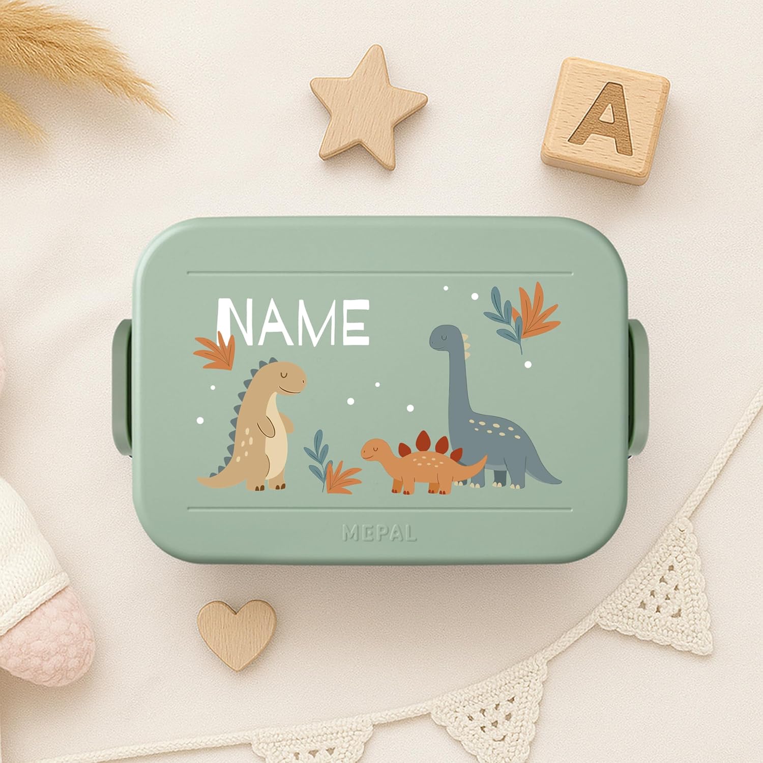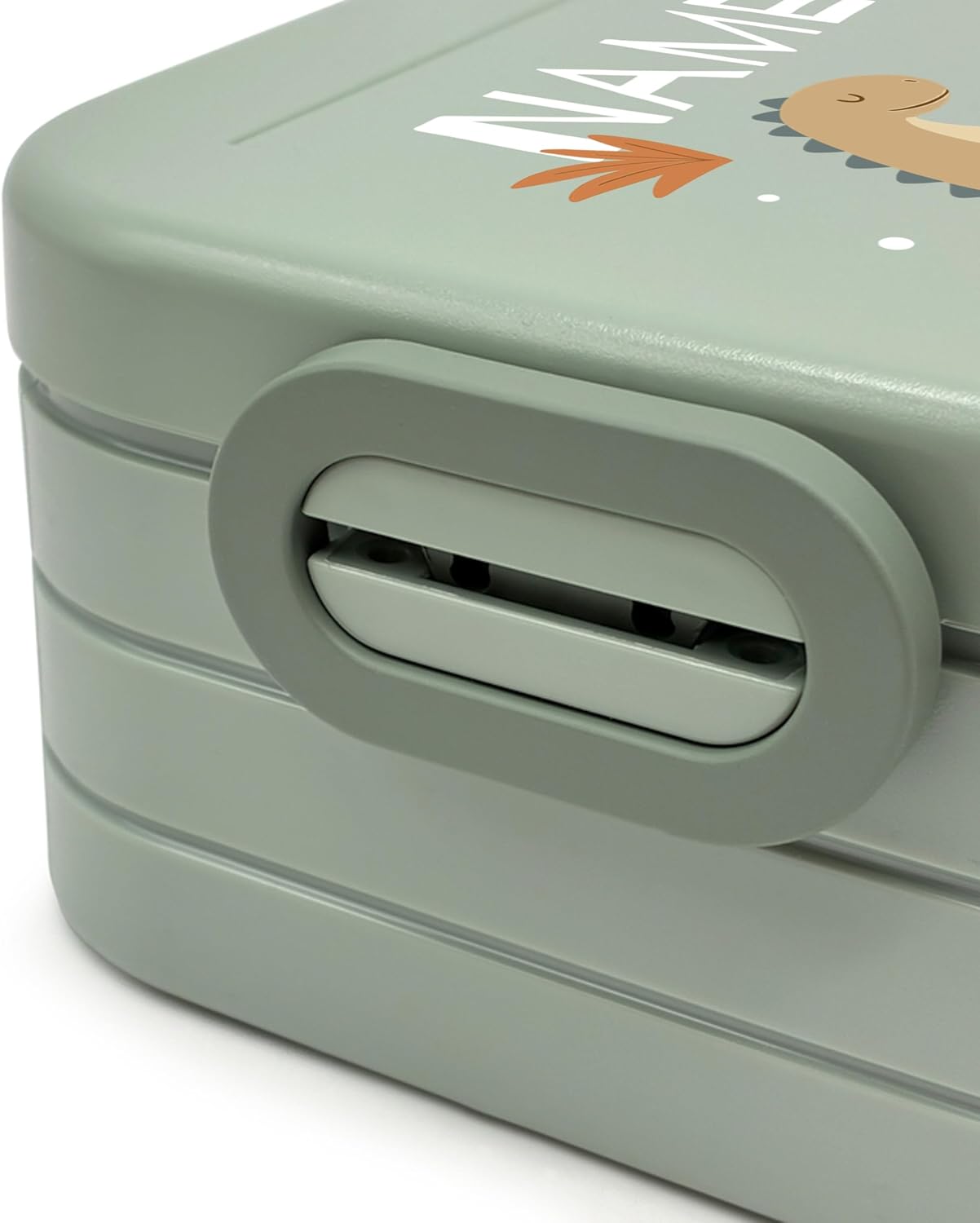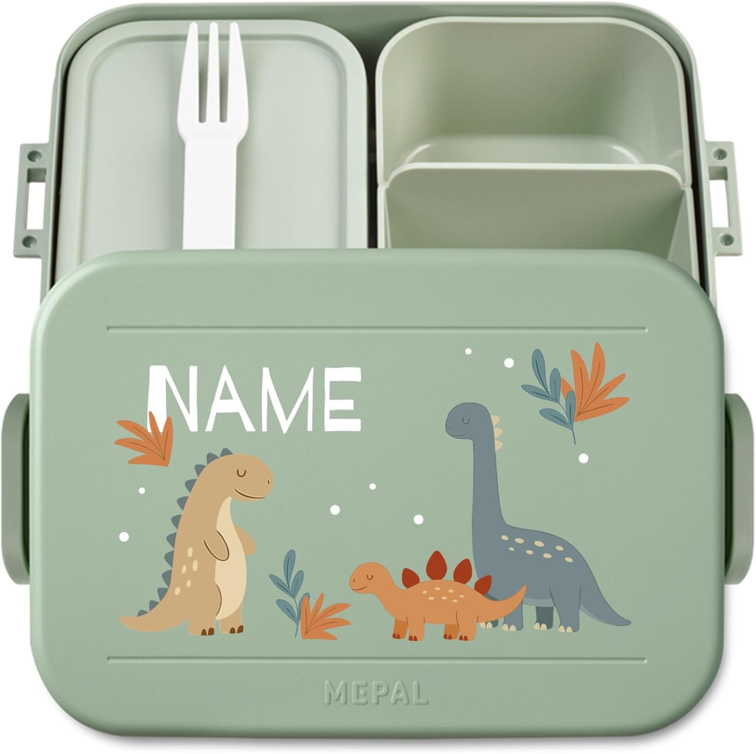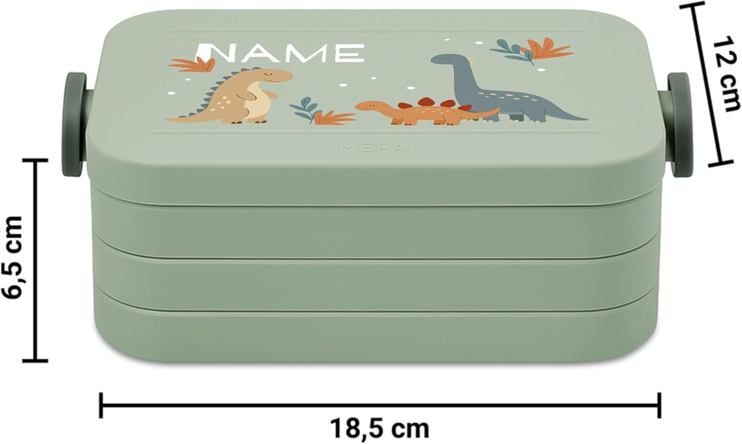 printplanet® Contenitore per il pranzo personalizzabile “Layout Dinos” – contenitore per il pranzo/bento box di Mepal – con il proprio nome o testo desiderato – colore Nordic Sage – senza BPA – idea regalo