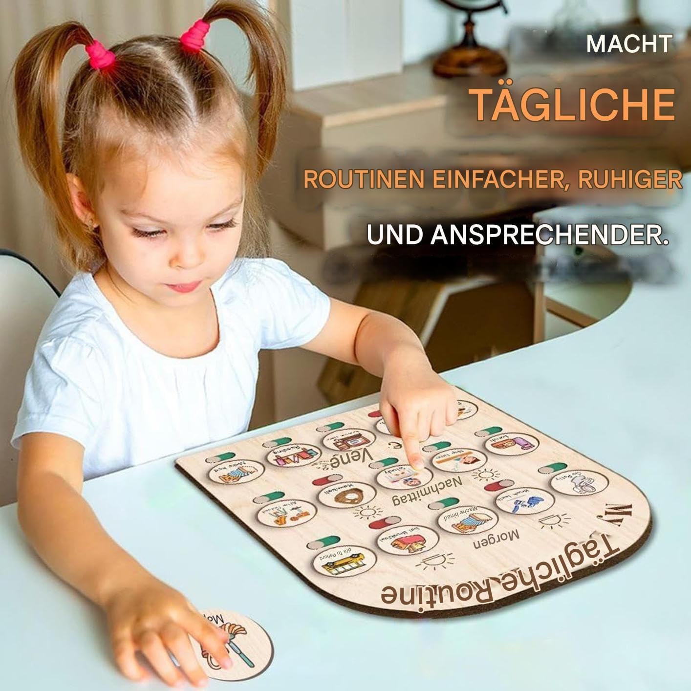 Aiuto visivo per la pianificazione: progettato come uno strumento pratico di apprendimento, l'organizer in legno rafforza i ritmi quotidiani attraverso periodi di tempo tangibili. La chiara visualizzazione dei compiti favorisce la comprensione delle sequenze temporali e sostiene lo sviluppo dell'orologio interno nei bambini. Scelta regalo ideale: regalo di gioco educativo per incoraggiare i bambini. Serve come utile ausilio all'apprendimento per i bambini in età prescolare e come regalo prezioso per compleanni o vacanze con valore educativo duraturo per le fasi di sviluppo. Supporto olistico allo sviluppo: supporta in modo giocoso lo sviluppo del pensiero logico e dell'immaginazione creativa nei bambini. Promuove efficacemente l'acquisizione del linguaggio, la percezione visiva e le capacità motorie attraverso metodi interattivi, ideali per l'apprendimento naturale nella vita di tutti i giorni. Utilizzo versatile: utilizzabile come agenda da parete o modello da tavolo ad un'altezza a misura di bambino - ideale per case, aule e camerette per una pianificazione quotidiana senza sforzo in diversi ambienti. Set agenda giornaliera: sistema di pianificazione strutturato con carte riutilizzabili, robusto supporto in legno e borsa in cotone: il sistema di visualizzazione delle carte rotonde consente ai bambini di organizzare le attività e le routine quotidiane in modo chiaro e chiaro per una maggiore indipendenza.