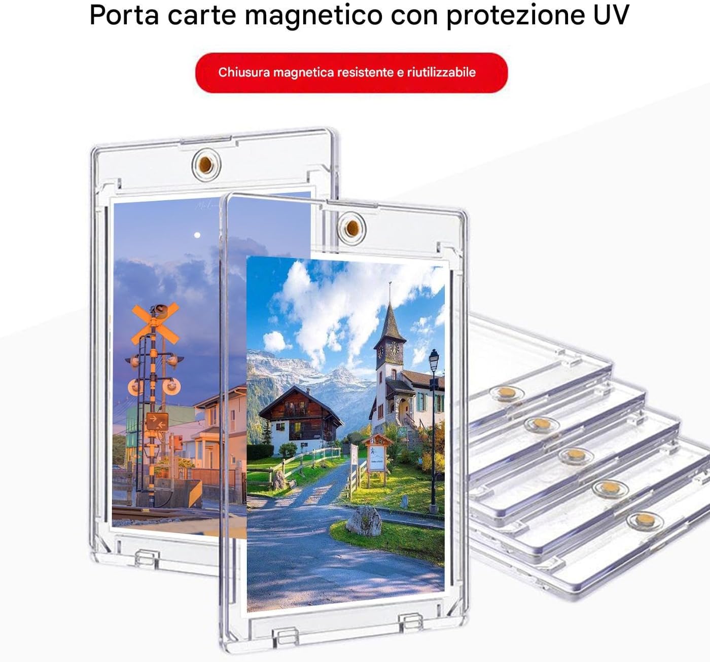 Compatibilità Universale: Progettate per contenere in modo sicuro carte sportive e da gioco, queste custodie garantiscono compatibilità con formati standard, ideali per organizzare multiple carte in modo efficiente e ordinato Protezione Carte: Dotate di qualità anti-graffio e anti-piegatura, queste custodie garantiscono una difesa completa schermando le carte da collezione da polvere e liquidi, assicurando il mantenimento di condizioni durature Soluzione Avanzata: La tecnologia no-unseal e la trasparenza totale abilitano la visualizzazione duplice, riducendo l'usura e offrendo un processo di collezionismo raffinato e migliorato di Accesso Protetto: La chiusura magnetica di queste custodie rigide protegge le carte da usura e cadute, mantenendo un design intuitivo che permette di estrarre e riporre le carte in modo semplice e senza rischi. Soluzione Anti-Ossidazione: Protezione con acrilico bloccante UV preserva i colori nel ed evita lo scolorimento durante la conservazione prolungata