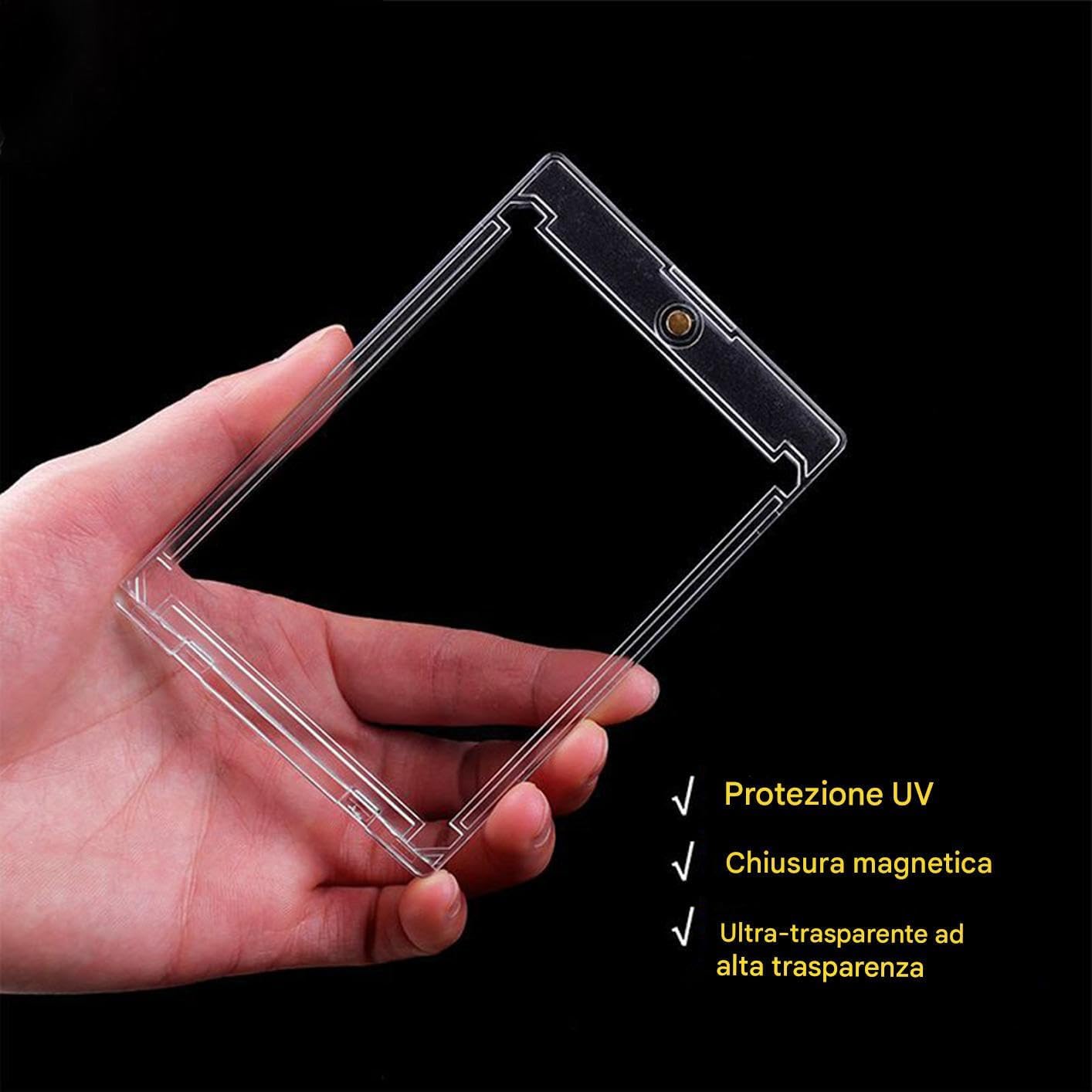 Utilizzo Polivalente: Perfette per custodire carte sportive e da gioco, con design universale che supporta il immagazzinamento multiplo e offre una soluzione completa per i collezionisti in un unico prodotto pratico e funzionale Difesa a 360: Forniscono una protezione completa per le carte da collezione da polvere, esposizione a liquidi, e pieghe, offrendo serenità per esigenze di conservazione a lungo termine in modo efficace Conservazione e Mostrazione: La visione senza apertura e la trasparenza completa garantiscono chiarezza fronte e retro, minimizzando l'usura per migliorare complessivamente il godimento della tua collezione Protezione Anticaduta: Dotate di chiusura magnetica, queste custodie offrono una soluzione di storage sicuro che previene cadute accidentali, unendo accessibilità immediata e difesa robusta per mantenere le carte sempre al sicuro. Conservazione Anti-Scolorimento: Custodie con acrilico anti-UV prevengono fading e ossidazione, assicurando colori vibranti per esposizioni da collezione