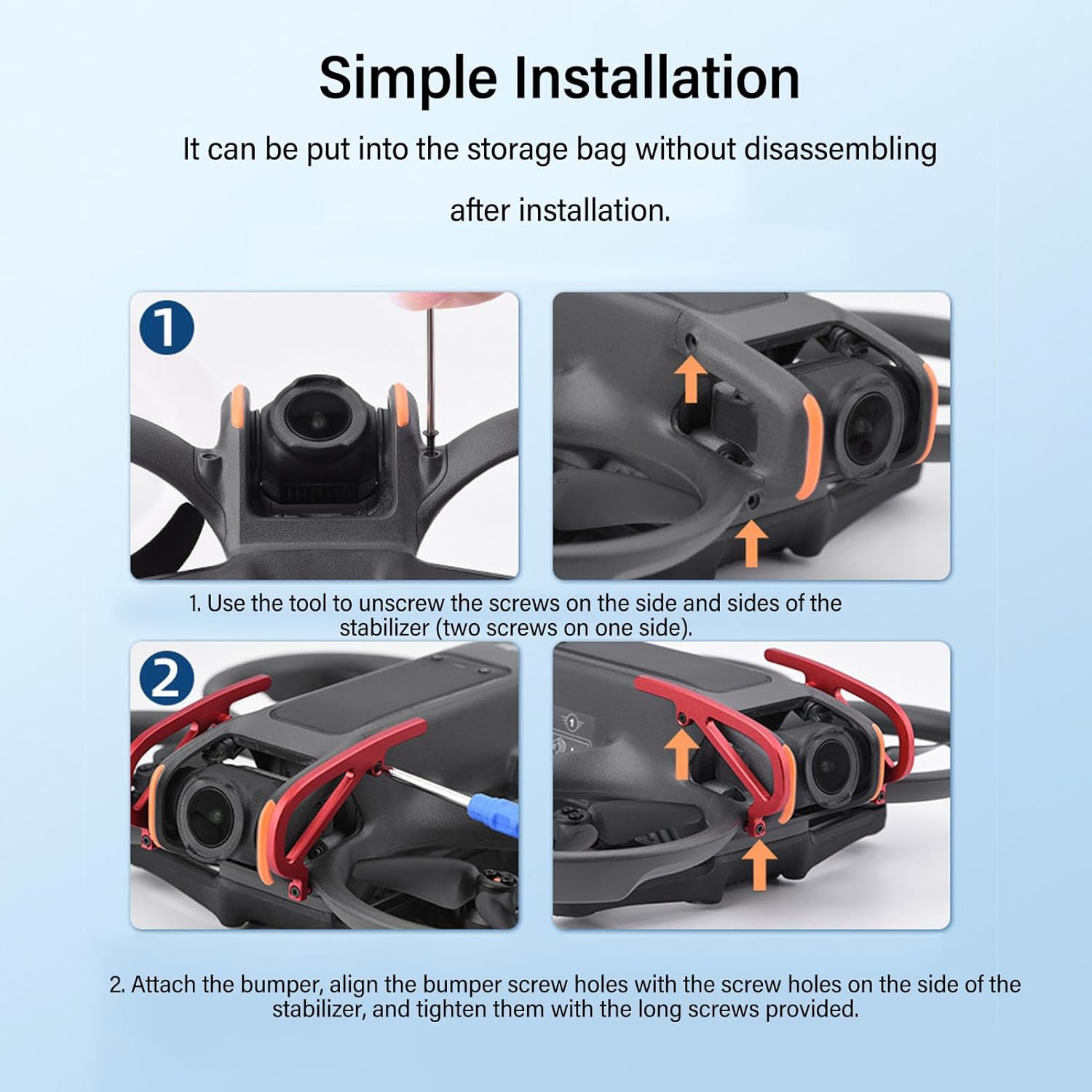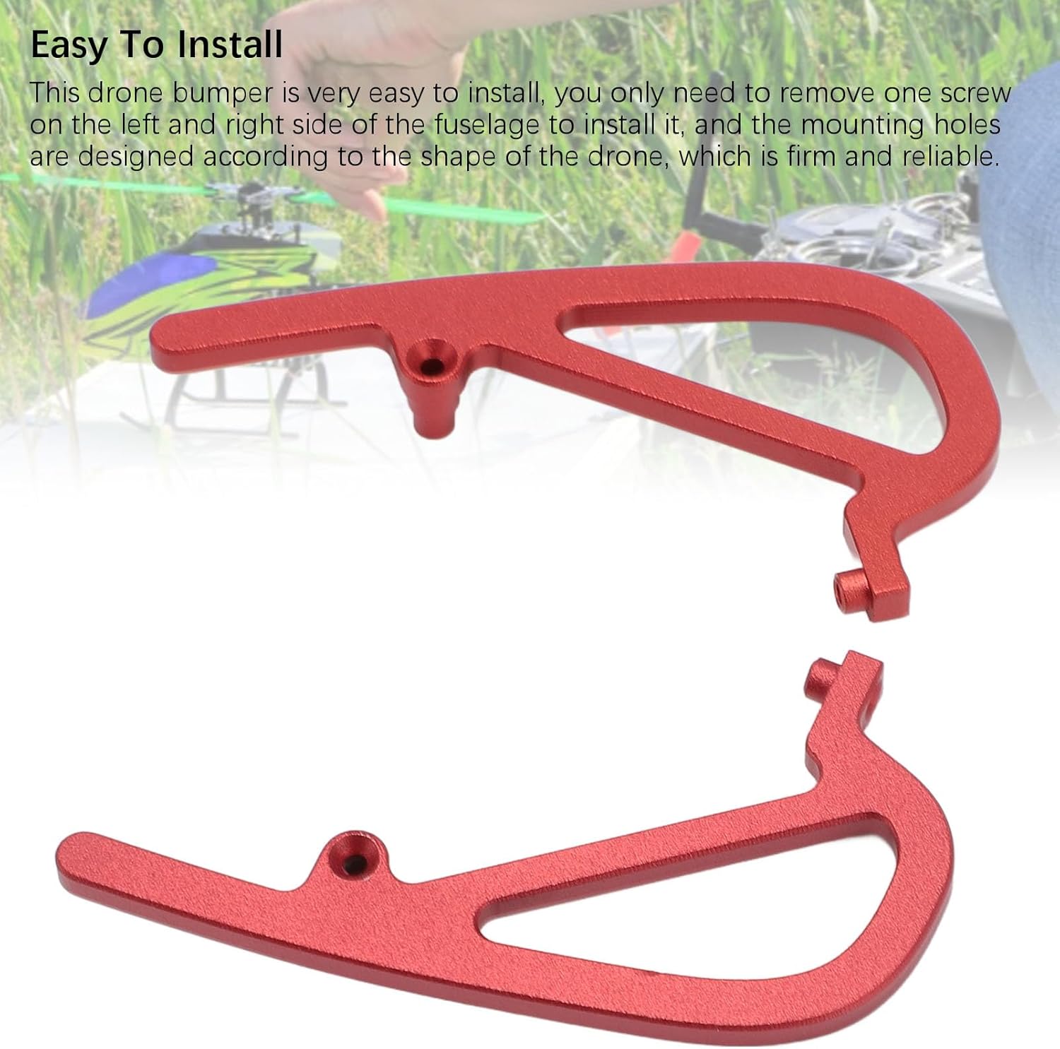 Eccellente materiale in lega di alluminio: questa protezione per paraurti per droni è realizzata in eccellente materiale in lega di alluminio, robusto e resistente all'usura, non facile da danneggiare, stampaggio integrato e la superficie è ossidata, che non è facile da sbiadire e non arrugginisce. Design esteso: questo paraurti stabilizzatore per droni presenta un design esteso in cui la parte anteriore del paraurti si estende sopra la parte anteriore della fotocamera con una parte che ha un impatto minore sulla fotografia aerea del volo. Ampia applicazione: questa protezione per paraurti per droni RC fornisce una protezione di estensione superiore, che protegge le parti superiori del drone in una certa misura quando il drone è capovolto e può essere utilizzata per fotografie aeree, prestazioni, ecc. Design ad arco unico: questo paraurti per droni in lega di alluminio presenta un design ad arco unico, che aumenta la resistenza agli urti del paraurti e protegge l'obiettivo e lo stabilizzatore del drone in modo più efficace in caso di incidente. Facile da installare: questo paraurti per droni è molto facile da installare. È sufficiente rimuovere una vite sui lati sinistro e destro della fusoliera per installarla e i fori di montaggio sono adattati alla forma del drone, che è solido e affidabile.