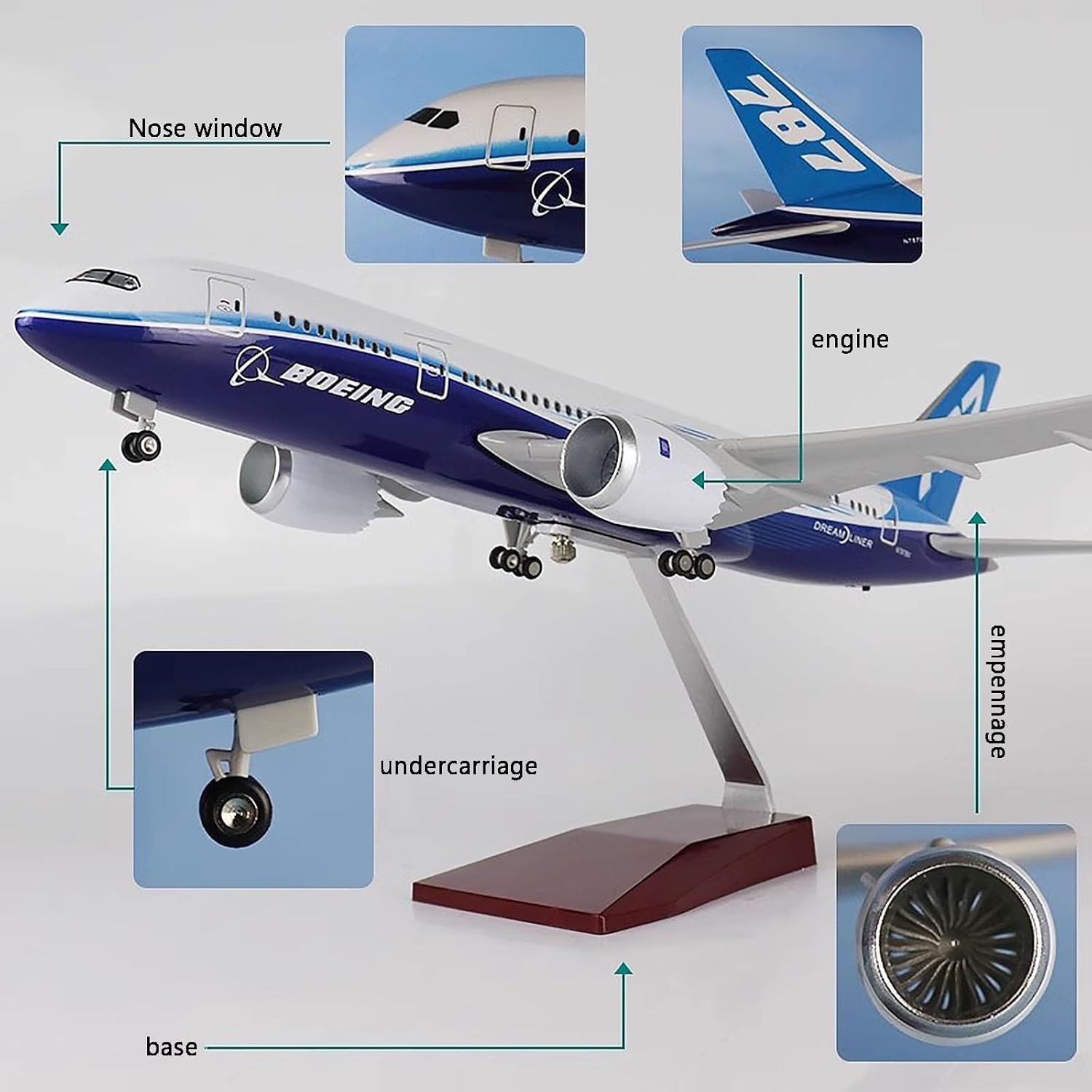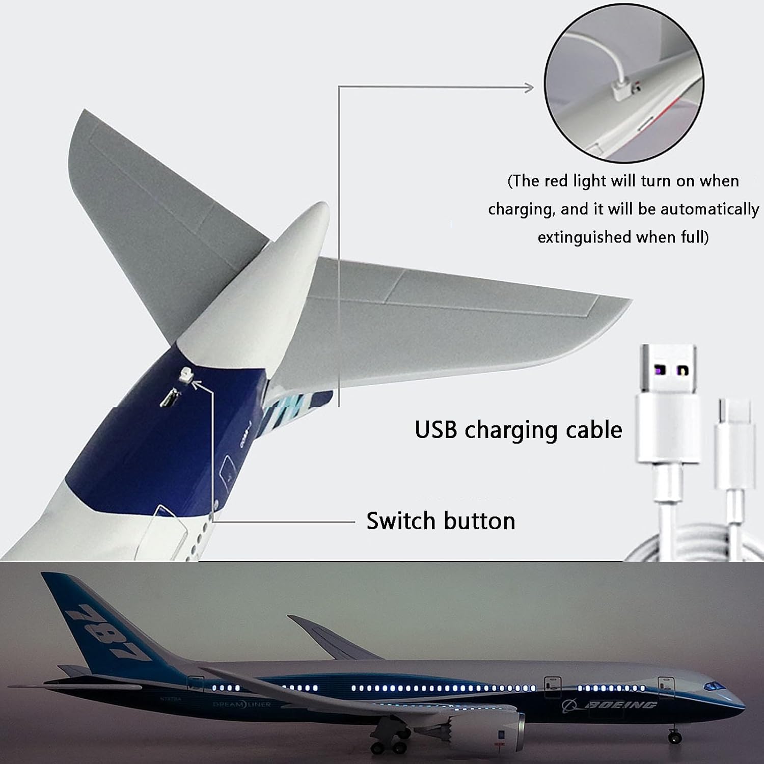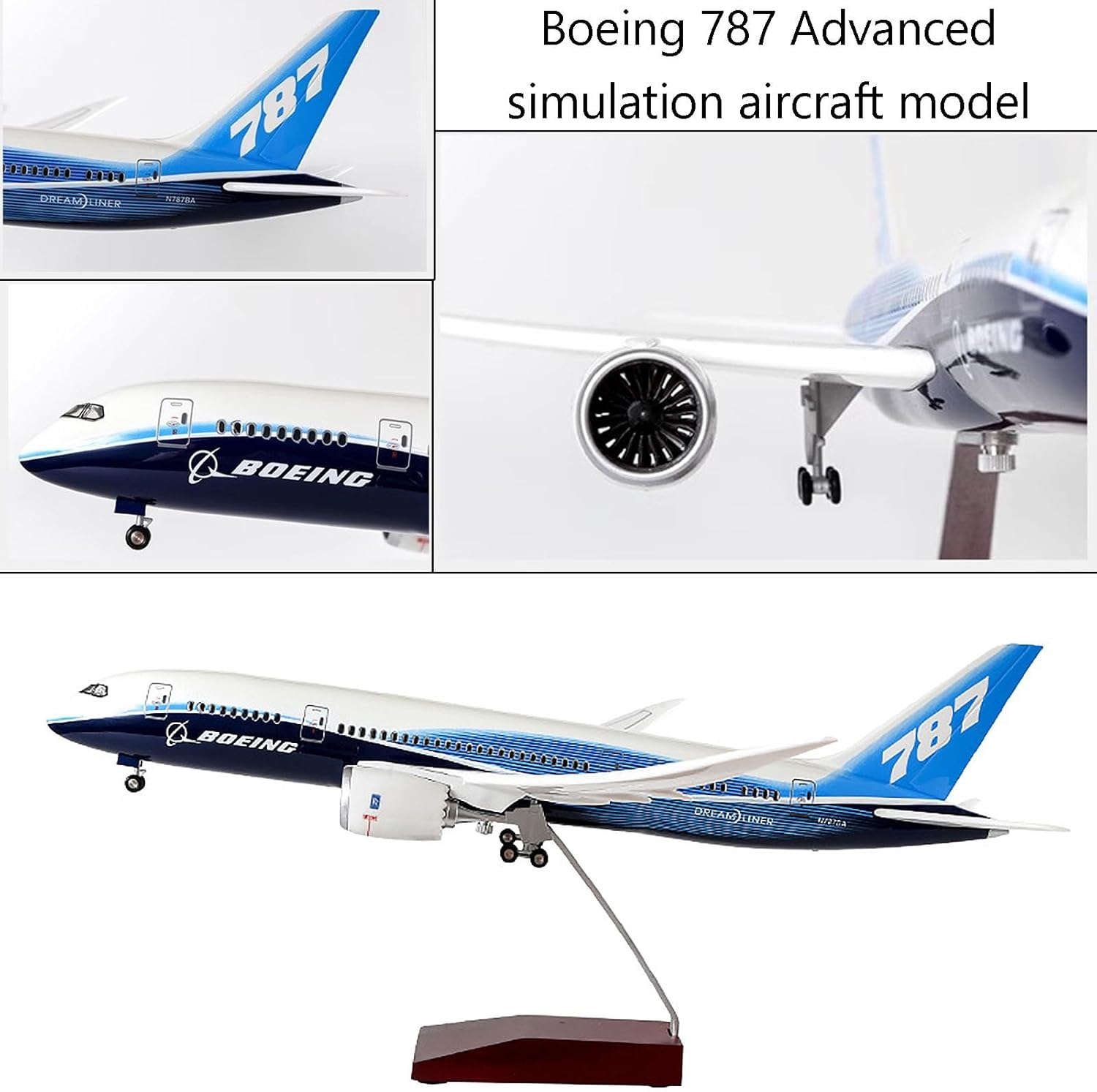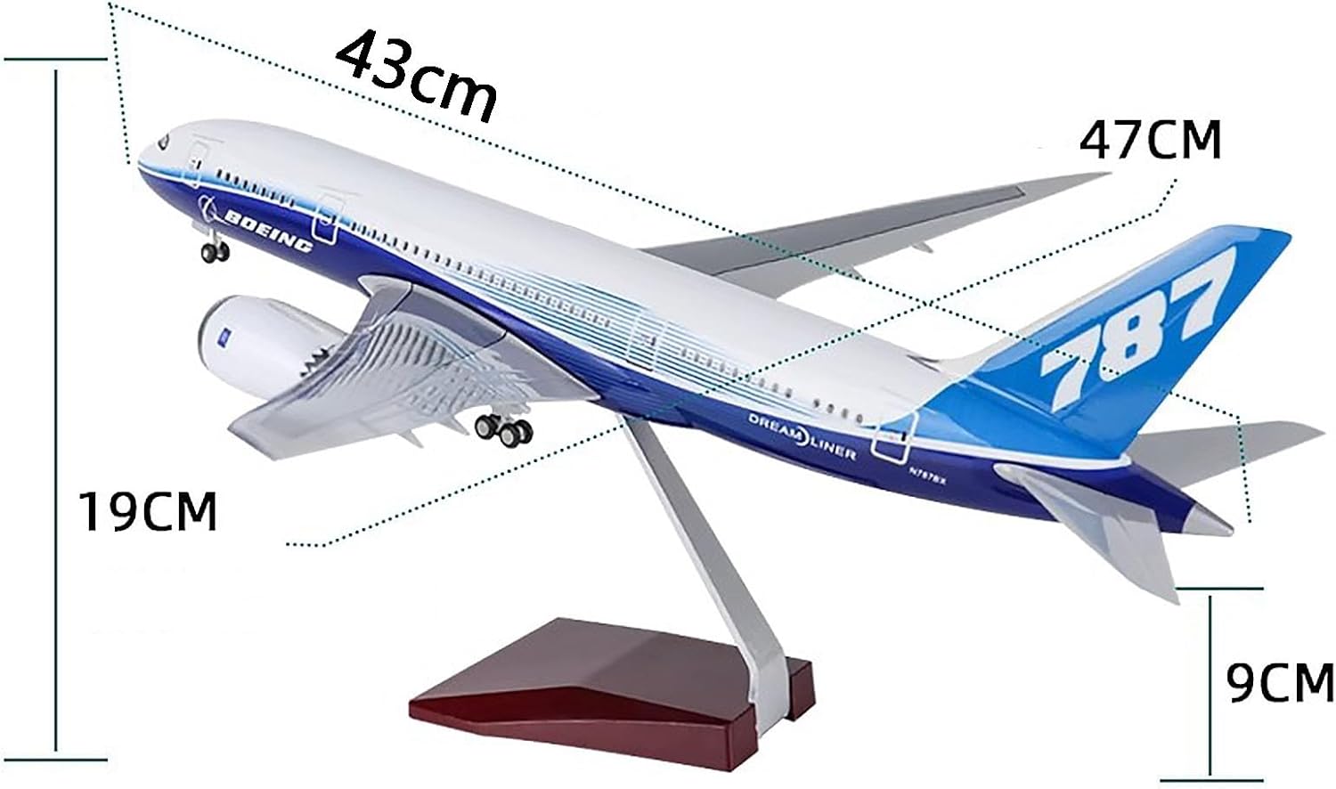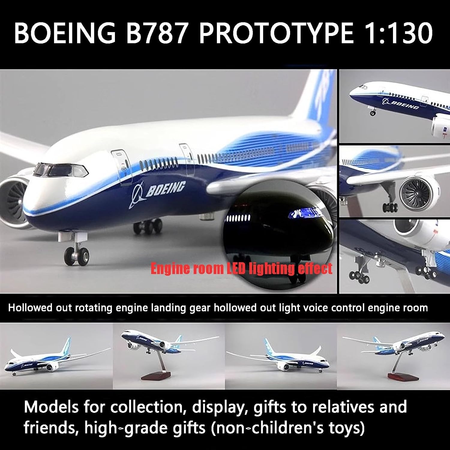 Prototipo Boeing 787 Cabin LED Light - Il grande modello di aereo con illuminazione interna a LED a bordo, inclusa l'illuminazione della cabina di pilotaggio. È piuttosto luminoso e si presta alla creazione di un modello di visualizzazione statica più creativo. Le luci si attivano tramite tocco o suono. Alta qualità e dettagli: molto dettagliato dalle pinne dei motori ai dettagli nella vernice. Le pale principali della ventola ruotano e le ruote possono girare. Corpo in resina di alta qualità, base trapezoidale in legno e staffa in metallo, stabile e può sostenere molto bene l'aereo. Modello di aereo simulato in scala ridotta: modello di aereo pressofuso di grandi dimensioni in scala 1:130, lunghezza (18,5 pollici), ali (19,9 pollici), altezza (7,7 pollici) Le luci a LED si illumineranno quando fai una voce o lo tocchi, molto affascinante e si spegnerà automaticamente dopo 20 secondi, ricarica USB Modello di aereo di linea: il materiale del modello è materiale composito aeronautico, il supporto è materiale di alluminio e la base è in legno massello Corpo in resina di alta qualità, base trapezoidale in legno e staffa metallica, stabile e può sostenere molto bene l'aereo. I migliori regali: può essere utilizzato for decorare l'ufficio, la casa o il negozio e un ottimo regalo aziendale, regalo di compleanno, regalo for festival, confezione squisita, lo imballeremo con una scatola modello bella e ben protetta