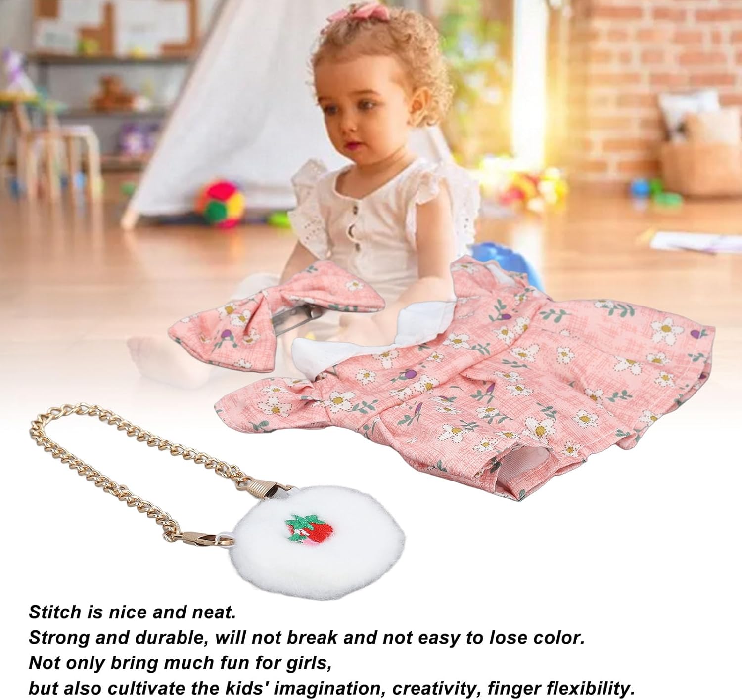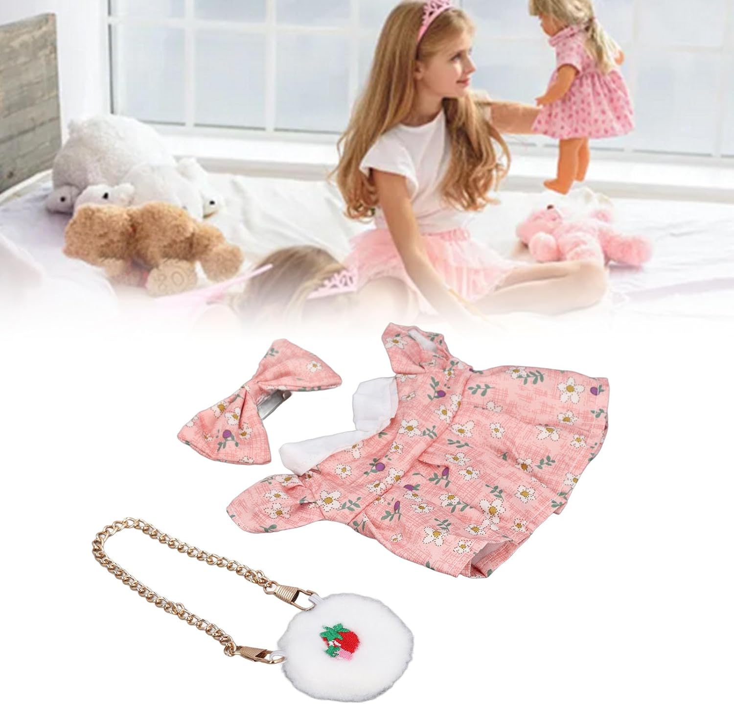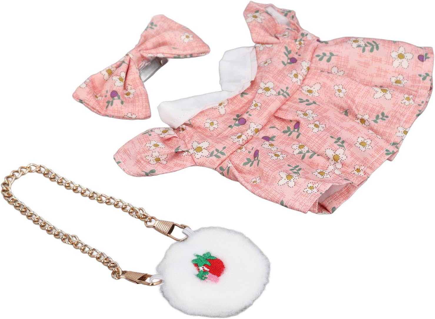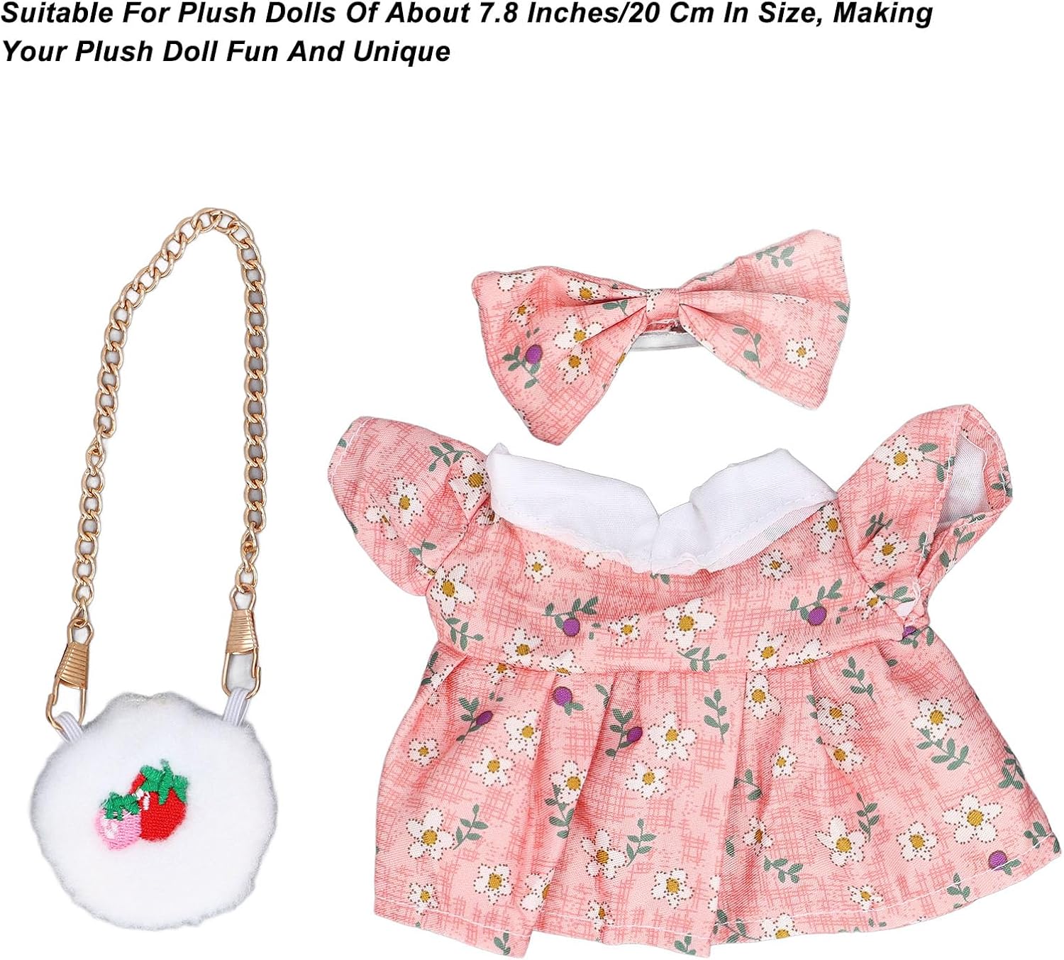 [Fit per bambole da 20 cm] su misura per bambole peluche da 20 cm/8 pollici, garantendo una vestibilità comoda e precisa per i tuoi giocattoli preferiti. [Migliora l'aspetto della bambola] Vestite le tue bambole con un , una borsa e un vestito per creare un look unico e affascinante. [Resistente e delicato] Realizzato con cotone e tessuto per usura duratura e cura delicata della superficie della tua bambola lussuosa. [Accessori divertenti aggiuntivi] include una borsa per fragola e un papillon maggiore giocosità ed espressione creativa nei bambini. [Opzione ideale] per i bambini che amano vestire le loro bambole o come appassionati di bambole e collezionisti.