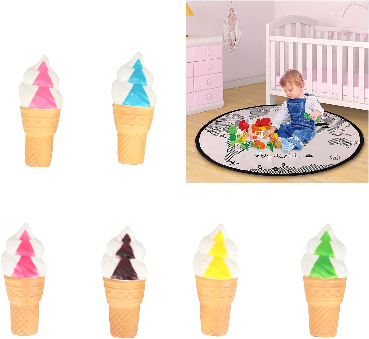 [Gioco di finzione coinvolgente] Promuove il divertimento interattivo, incoraggiando i bambini a condividere e godersi il tempo di gioco sociale con gli amici. [Design colorato] I giocattoli di gelato luminosi e vivaci attirano l'attenzione, fornendo stimolazione visiva ed esperienze di apprendimento giocose. [Materiali morbidi] Realizzato in vinile sicuro e non tossico, per le mani dei più piccoli per godersi un gioco fantasioso senza preoccupazioni. [Caratteristica sonora] Ogni cono gelato emette suoni deliziosi, aggiungendo una dimensione emozionante all'esperienza di gioco finta. [Divertenti decorazioni per la casa] Questi affascinanti giocattoli di gelato possono anche servire come decorazioni giocose nelle stanze dei bambini o nelle aree giochi.