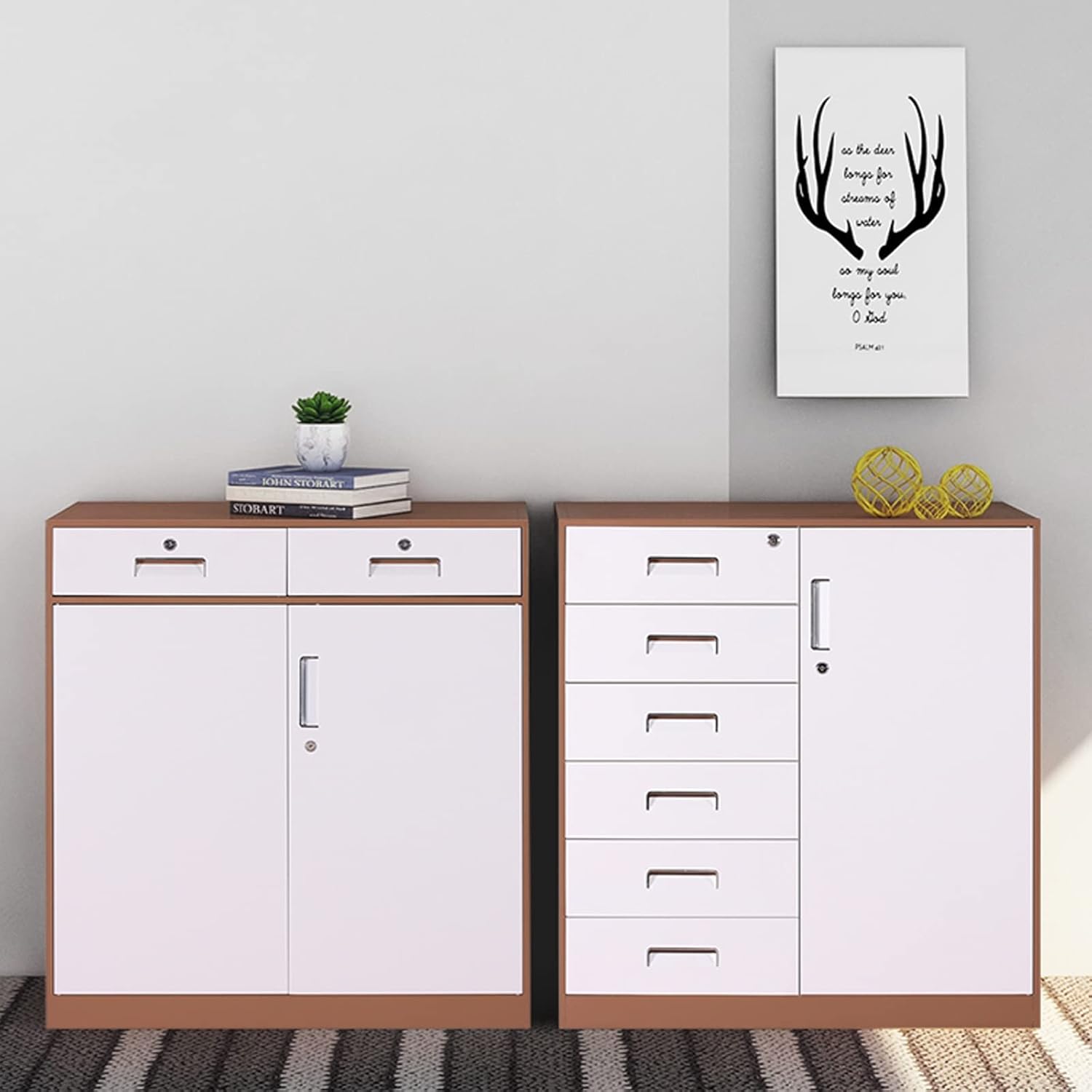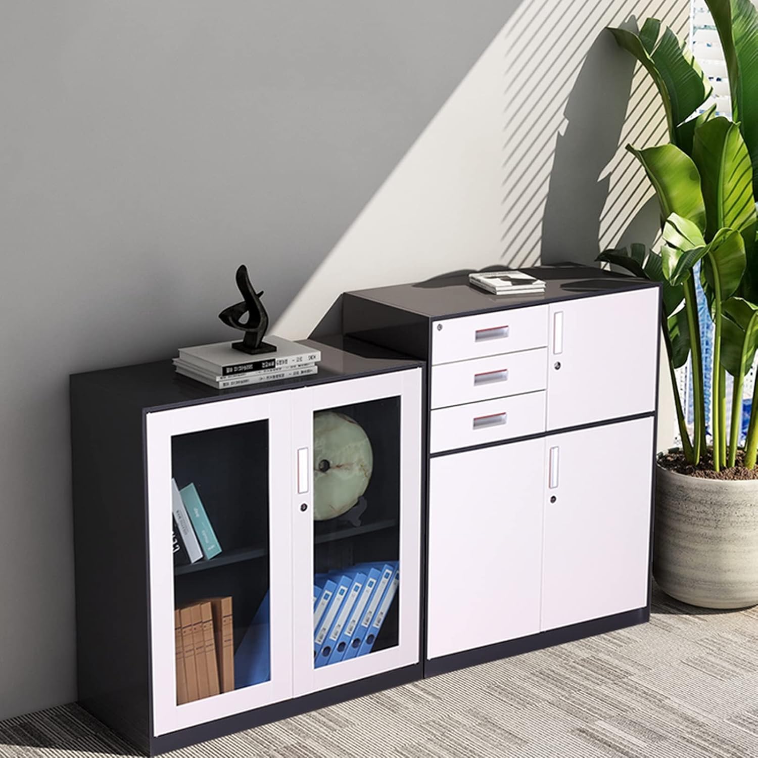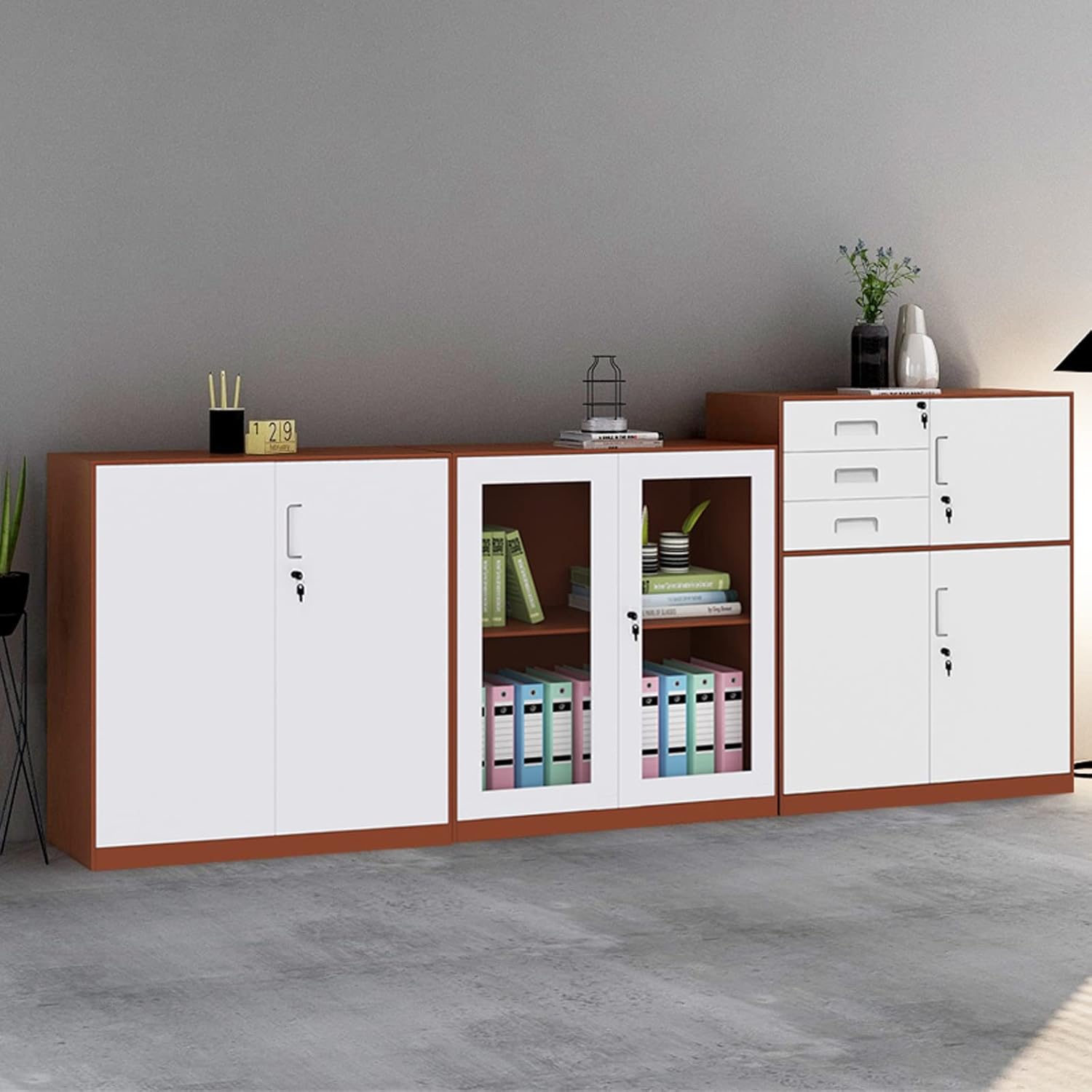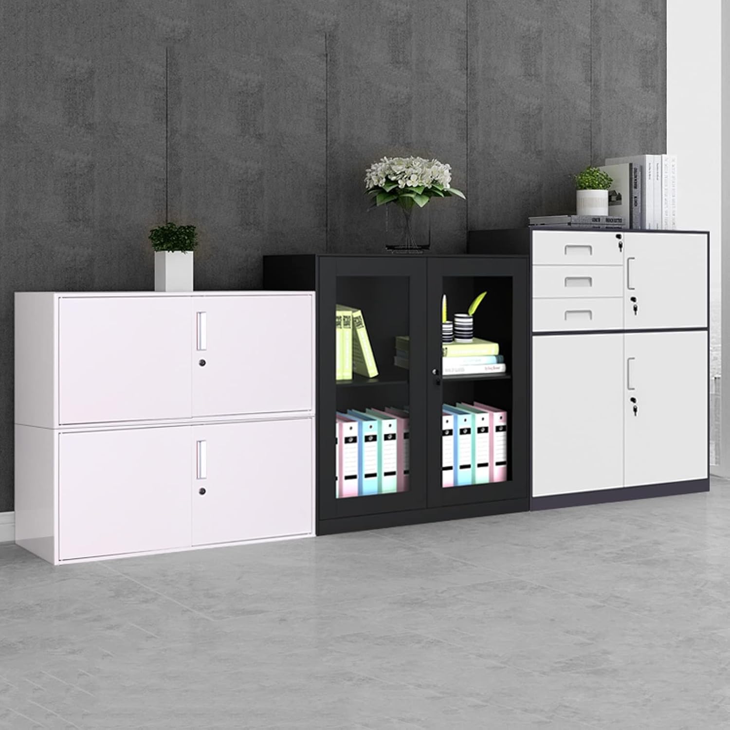 Gli armadietti per documenti dall'aspetto moderno e raffinato possono abbinarsi perfettamente agli altri mobili per aggiungere magia e fascino alla moda al tuo ufficio. Adatto per la maggior parte degli uffici domestici. La dimensione del file CAB è 60*39*52 cm/23,62*15,35*20,47 pollici, 60*39*50 cm/23,62*15,35*19,69 pollici. Il colore è bello e non sbiadisce facilmente ed è semplice e comodo da usare. Piccole dimensioni e grande capacità, tenendo conto dello spazio multistrato resistente e duraturo, di stoccaggio classificato.