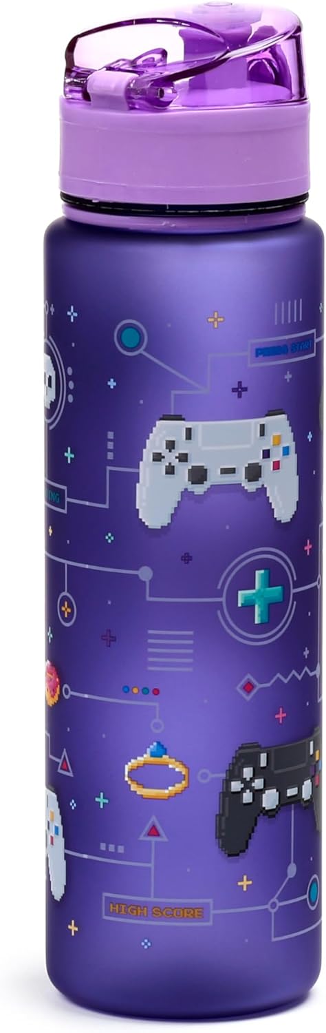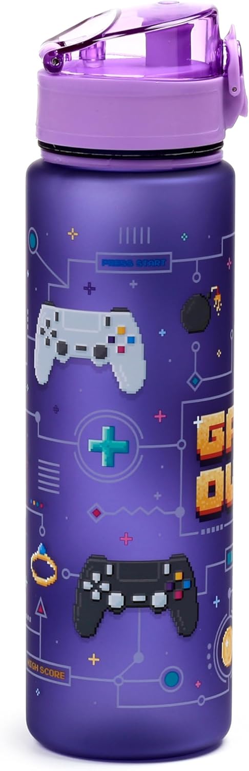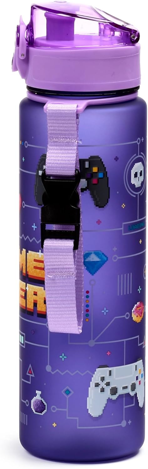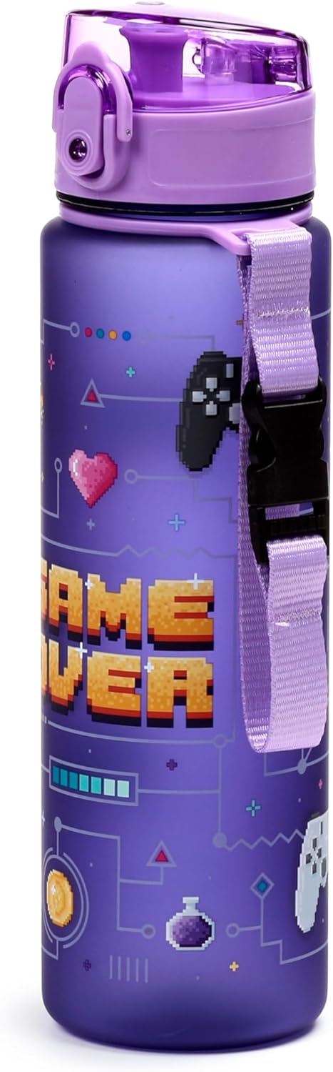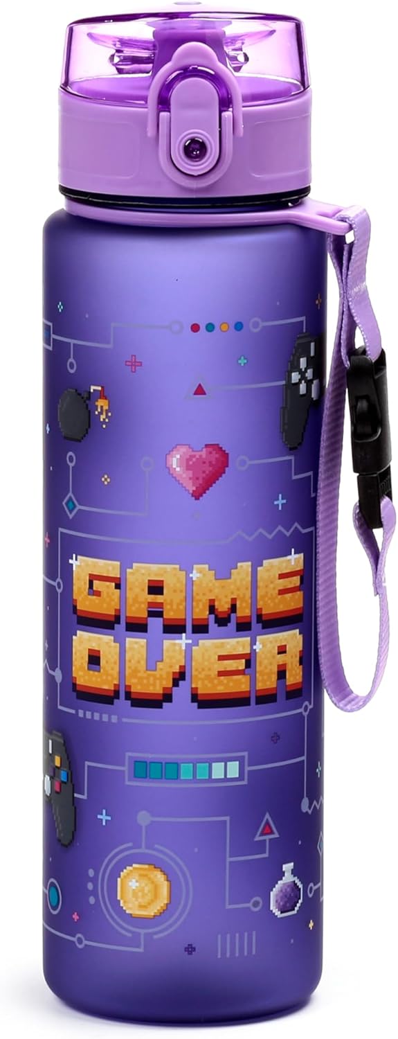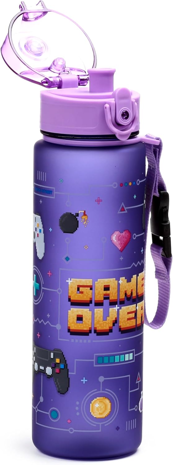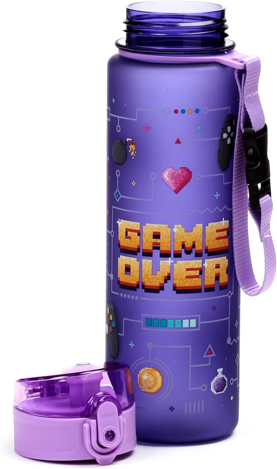 🎮 Game Over Design Materiale resistente e privo di BPA, per uso alimentare Borraccia ecologica da 600 ml con tappo a pressione e cannuccia Ha una cinghia per un facile trasporto Progettato con ❤️ e cura nel Regno Unito