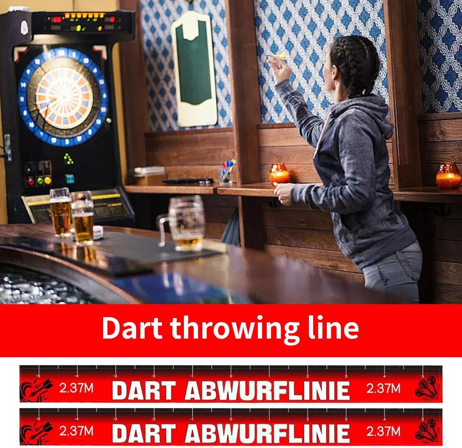 Supporto costante delle prestazioni: facilita il corretto posizionamento e allineamento del piede per una migliore precisione e tiri costanti, definendo una linea di lancio chiara che supporta accordi di competizione equi Must-Have: misura 56 x 5 cm, questa linea di tiro per freccette garantisce un posizionamento accurato ed è ideale per sostituzioni, con due linee incluse per comodità e un set completo per migliorare l'esperienza di gioco delle freccette Installazione semplice: assicura un fissaggio senza soluzione di continuità alla maggior parte delle opzioni di pavimentazione, con funzionalità di installazione e rimozione rapide, rendendolo ideale per i giocatori di freccette di tutti i livelli che cercano soluzioni di installazione efficienti Impermeabile e resistente allo sbiadimento: realizzato in carta patinata con adesivo, questa linea di tiro per freccette resiste alla desquamazione, allo sbiadimento e ai danni causati dall'umidità per un uso duraturo in vari ambienti Applicazione completa: un must per gli appassionati di giochi, funziona bene in casa, bar o feste, offrendo una configurazione professionale di freccette che garantisce divertimento e versatilità ovunque utilizzato