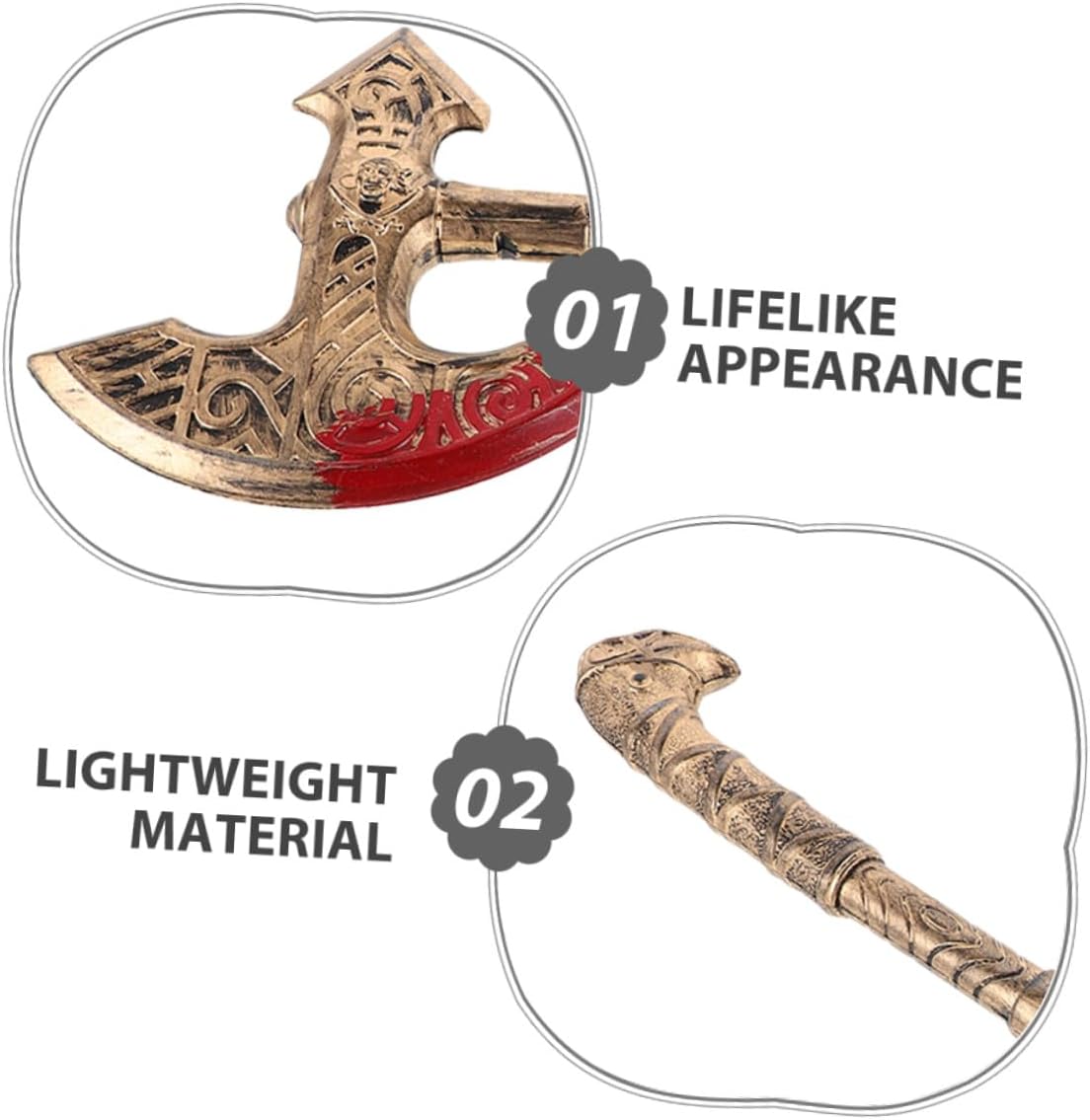 Migliora l'impatto visivo: questo oggetto di scena migliora l'aspetto generale del tuo costume e crea un'immagine impressionante che attirerà l'attenzione in qualsiasi riunione o esibizione. Ascia da gioco di ruolo vichinga, puntello per ascia per feste. Aspetto autentico: la lavorazione dettagliata di questo puntello per ascia imita i disegni storici e aggiunge un tocco di realismo ai tuoi abiti vichinghi o medievali. Ascia giocattolo vichingo di Halloween, oggetto di scena vichingo retrò Dettagli realistici: il design finemente realizzato di questo oggetto di scena è in stile storico, aggiungendo autenticità al tuo gioco di ruolo vichingo o medievale, finta ascia retrò e decorazione per feste vichinghe Durevolezza riutilizzabile: questo oggetto è progettato per durare, mantenendo la sua qualità anche dopo un uso ripetuto. rendendolo una scelta affidabile per feste e spettacoli futuri. Oggetti di scena per ascia di Halloween, oggetti di scena per cosplay di asce vintage Qualità a lungo termine: questo oggetto di scena per ascia è progettato per un uso ripetuto e mantiene la sua forma e i suoi dettagli. Offre un eccellente rapporto qualità-prezzo per gli amanti dei costumi e i frequentatori di feste. Puntello per ascia costume da cavaliere, puntello per ascia medievale in plastica