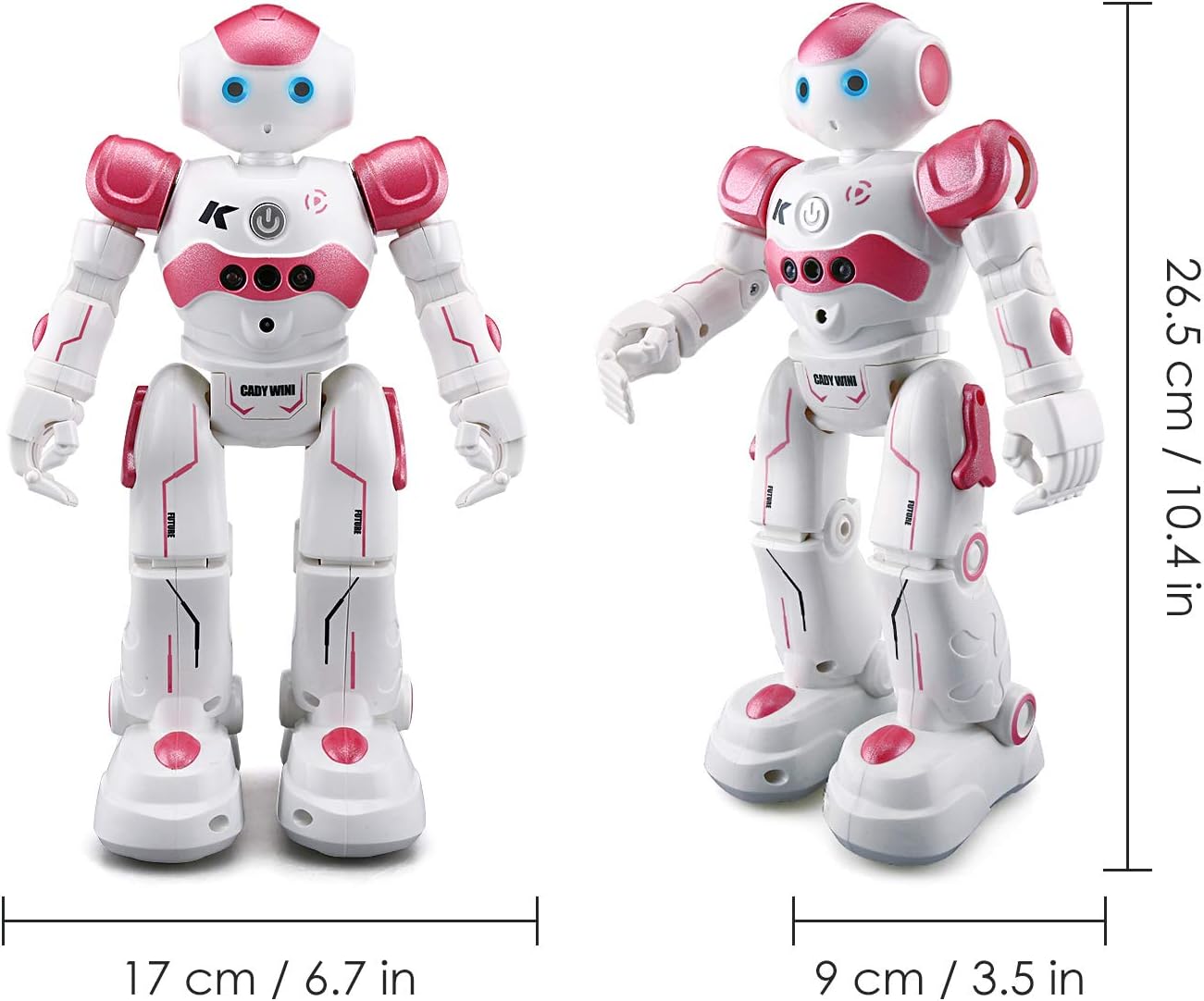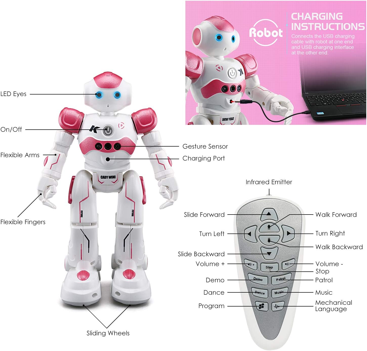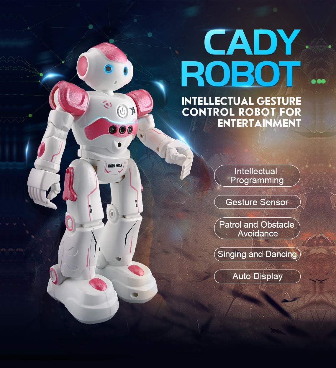Gesture Sensing Il robot telecomando segue i comandi gestuali e reagisce ai gesti con un movimento di base, insieme agli effetti sonori. È possibile utilizzare i gesti per controllare il robot per andare avanti e indietro e girare a sinistra ea destra. Allo stesso tempo, la tecnologia di rilevamento del movimento consente al robot di allontanarsi dagli ostacoli rilevati. Una volta rilevato l'ostacolo, può muoversi all'indietro per evitare gli ostacoli Divertimento interattivo Il robot può cantare e ballare per divertirti. Il robot telecomando è dotato di occhi illuminati, suono coinvolgente e musica per rendere la riproduzione più interattiva. Il robot può eseguire canto, camminare, scivolare, parlare, accompagnato da mosse di danza, e la simulazione del design antropomorfo porta più divertimento ai bambini Robot di programmazione intelligente Questo robot intelligente può essere programmato per eseguire le azioni che hai creato e può registrare fino a 50 azioni. Basta semplicemente premere il pulsante Programma e digitare una serie di azioni, e poi il robot remoto intelligente li ricorderà ed eseguire le azioni uno per uno Due modalità di movimento e giunti flessibili Il robot include sia a piedi che a scorrimento due modalità Movimento. I piedini del robot sono dotati di ruote integrate di alta qualità per un bilanciamento dinamico e manovre rapide e agili. I bracci flessibili hanno giunti multipli flessibili che possono piegare e spostare i pollici e fare posizioni diverse d'azione, rende il robot più realistico Batteria ricaricabile Il robot telecomando viene fornito con una batteria integrata che può essere caricata tramite cavo USB. Completamente carica per 120 minuti, può offrire 1 ora di gioco. Il telecomando wireless fornisce il controllo remoto del robot e consente il controllo remoto di camminare, cantare, ballare e programmare. La distanza RC può raggiungere 6 8 metri