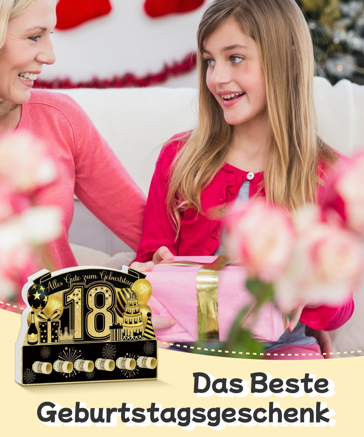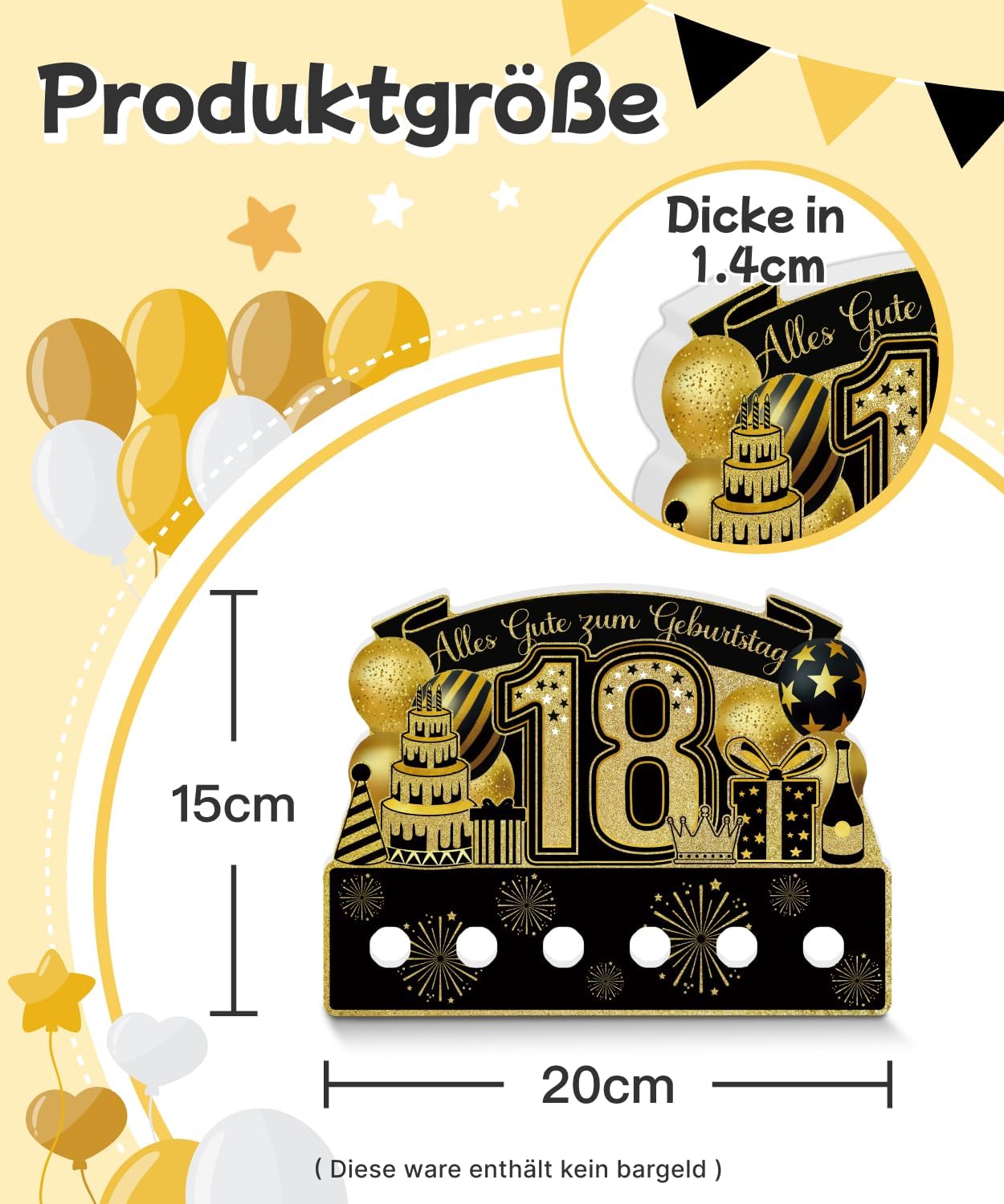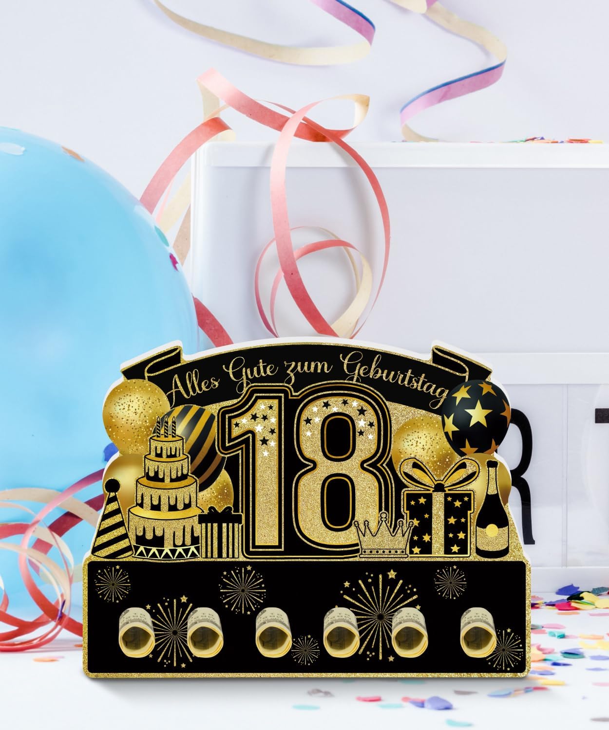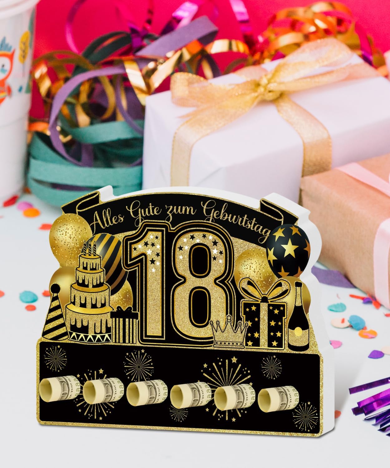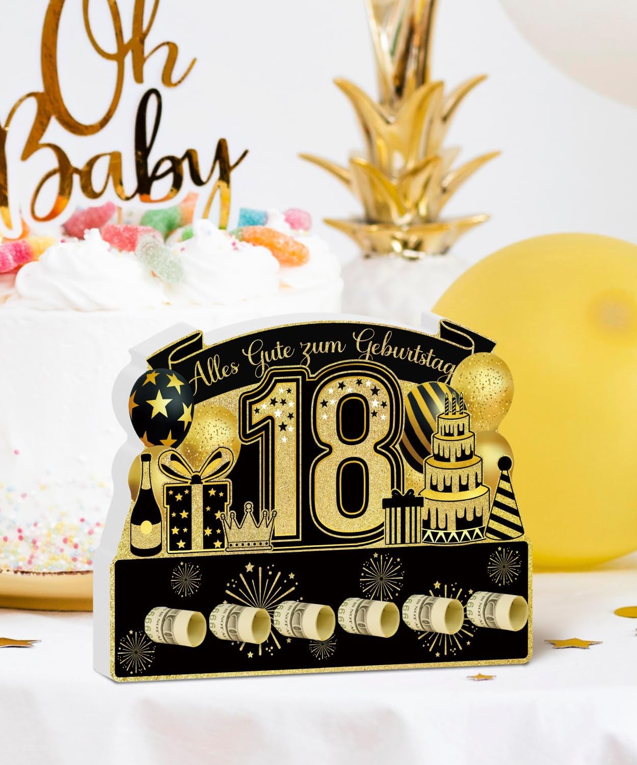 Design accattivante per compleanno: il numero 18 al centro con dettagli dorati ed elementi festivi rende l'espositore da tavolo un'attrazione Materiale PVC durevole: realizzato in robusto PVC, questo espositore offre stabilità ed è adatto per l'uso multiplo Già montato: non è necessario alcun montaggio, può essere posizionato direttamente sul tavolo dalla confezione Uso versatile: ideale come centrotavola per il tavolo di compleanno o come sfondo fotografico per gli ospiti Idea regalo solenne: un bel extra per ogni 18° Festa di compleanno o come sorpresa per amici e parenti